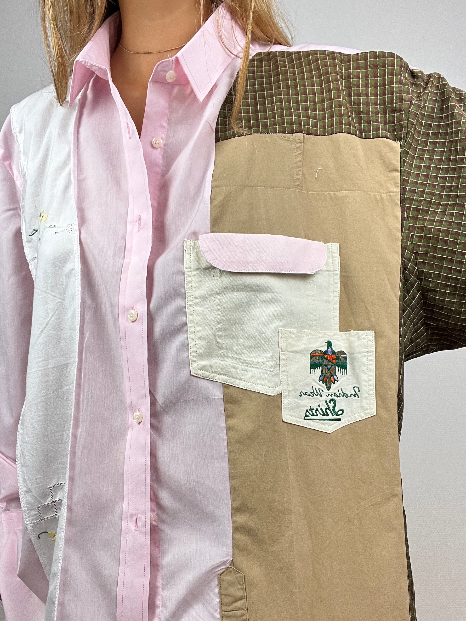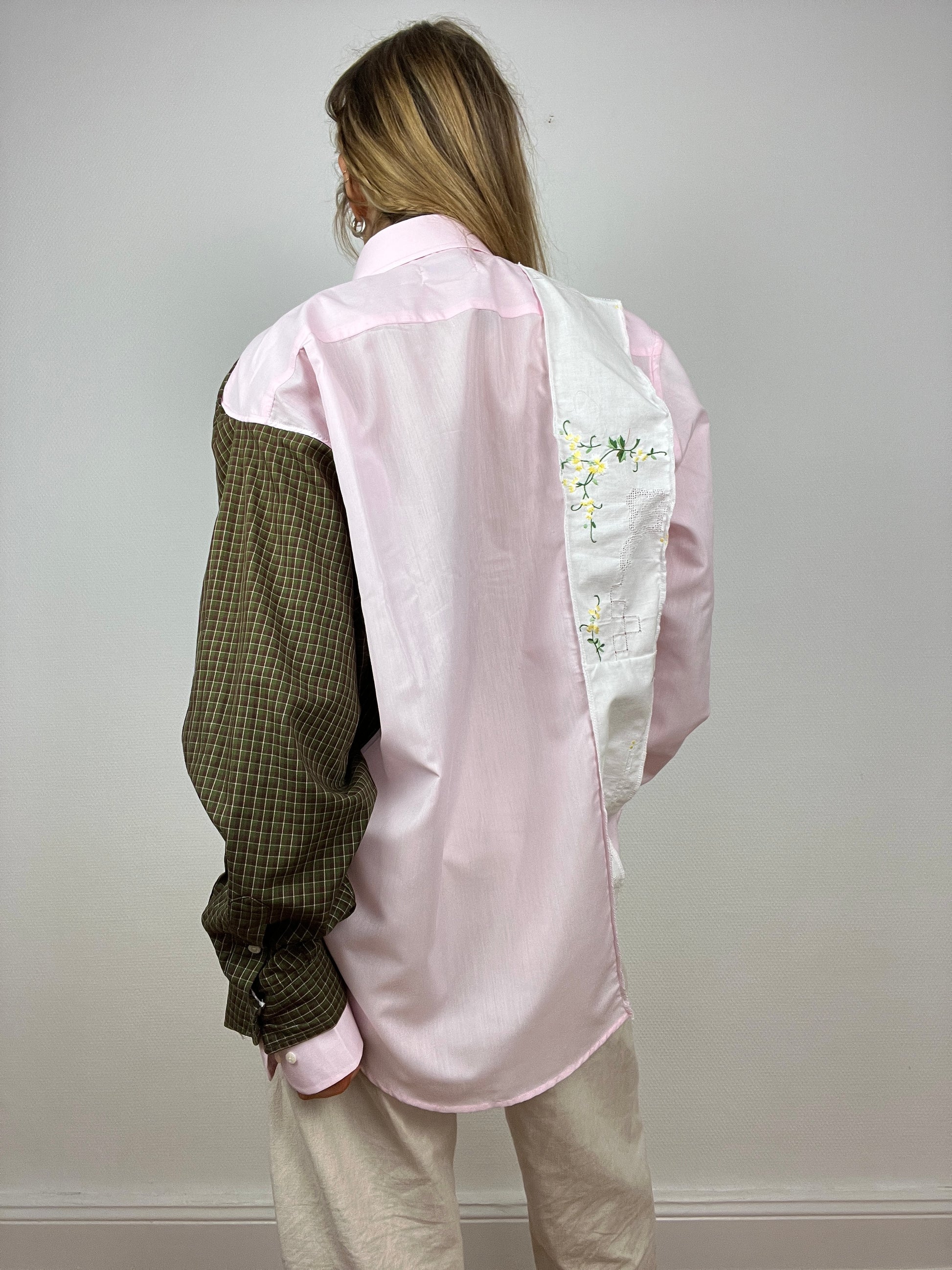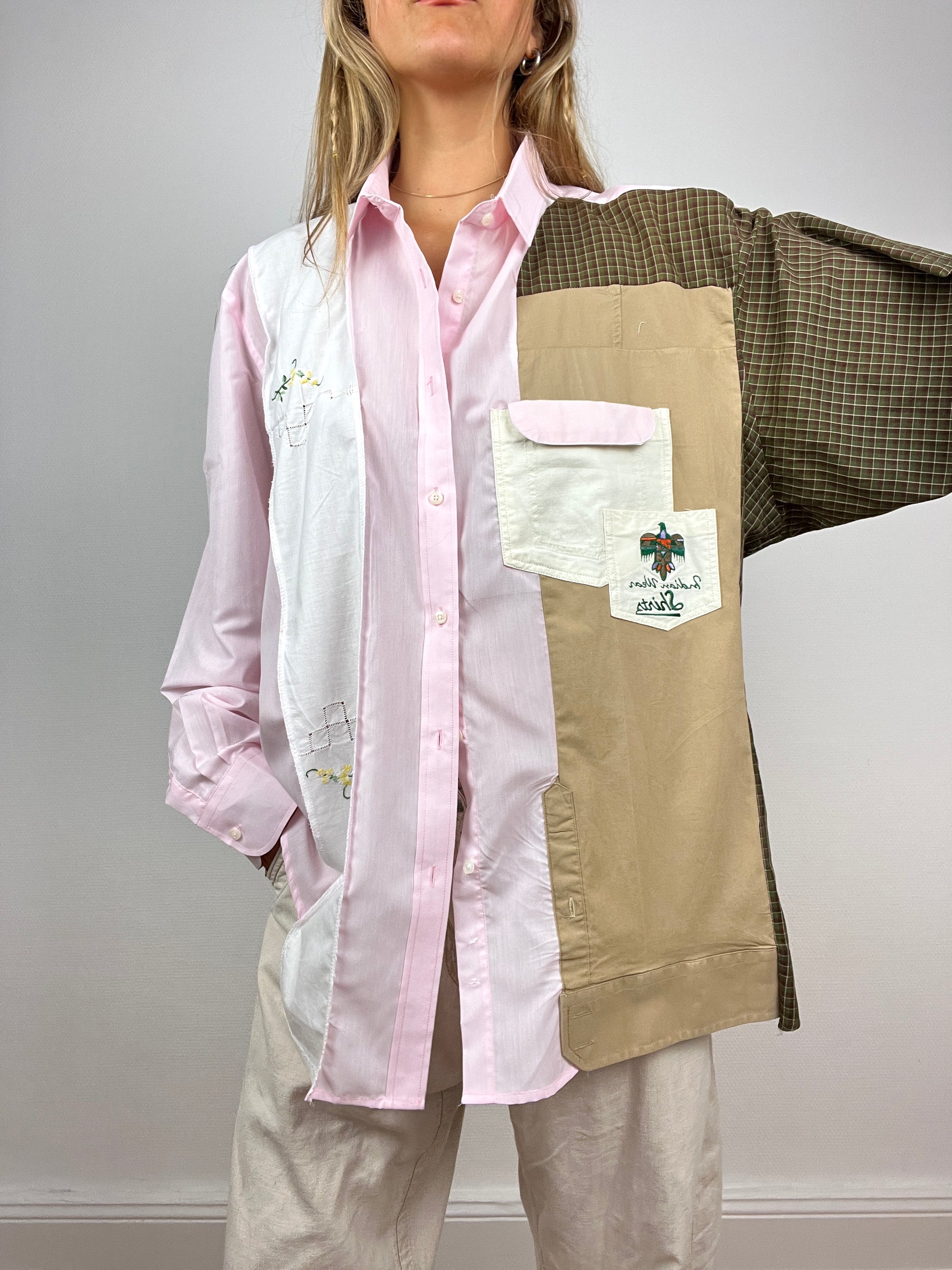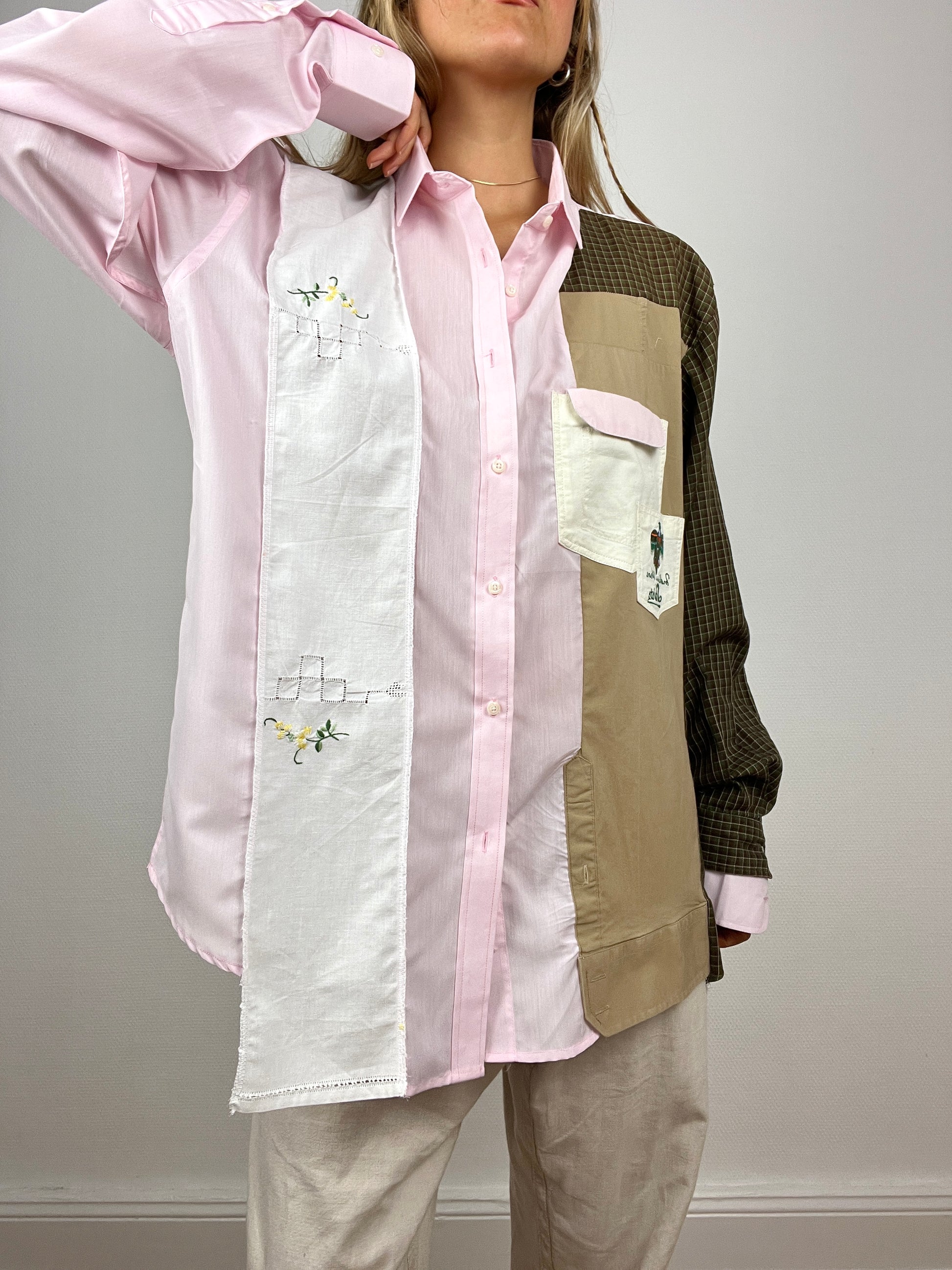 Chemise upcyclée à partir d’un mélange de chutes de chemises. Design avec des touches d’upcycling uniques.