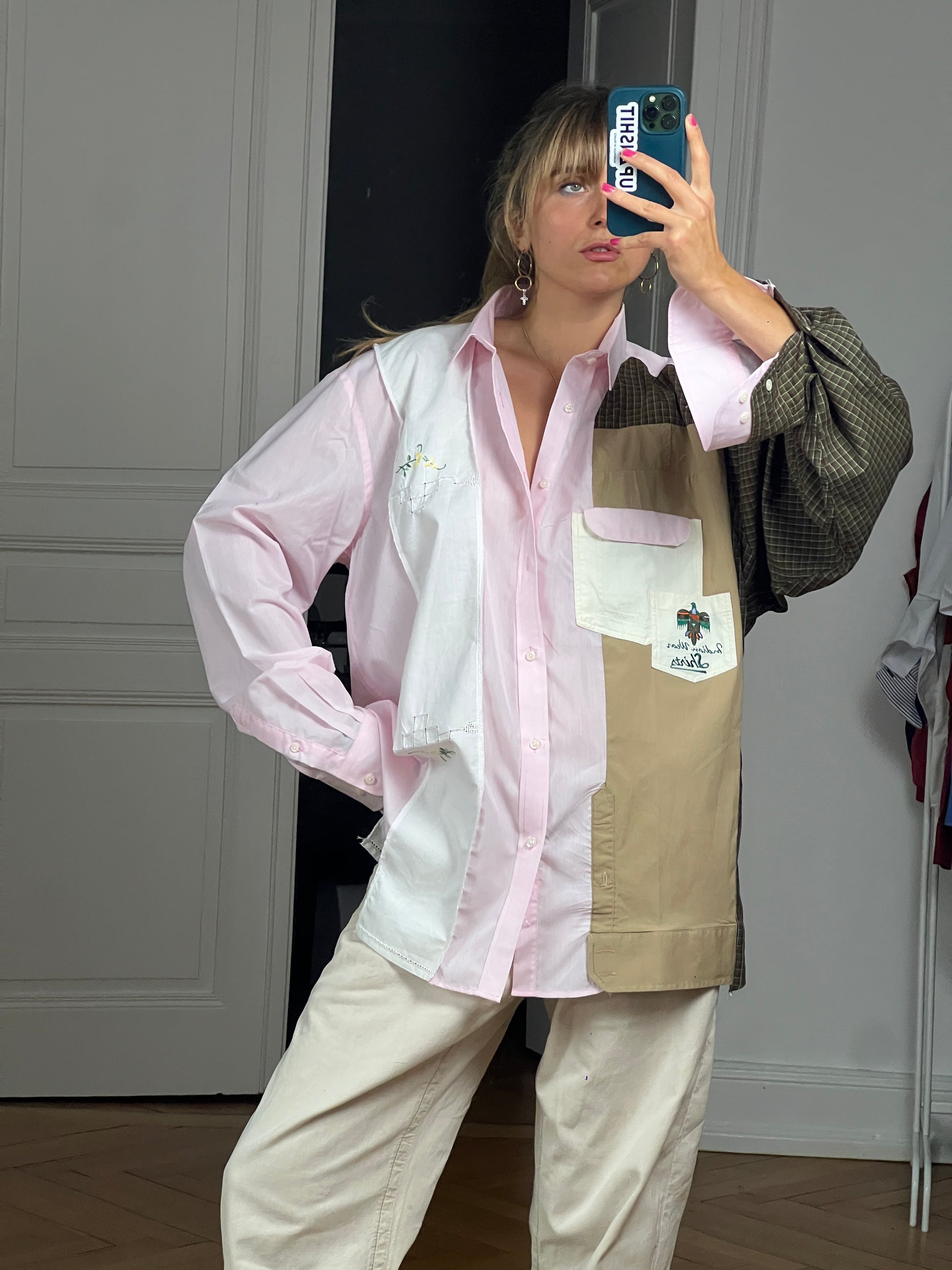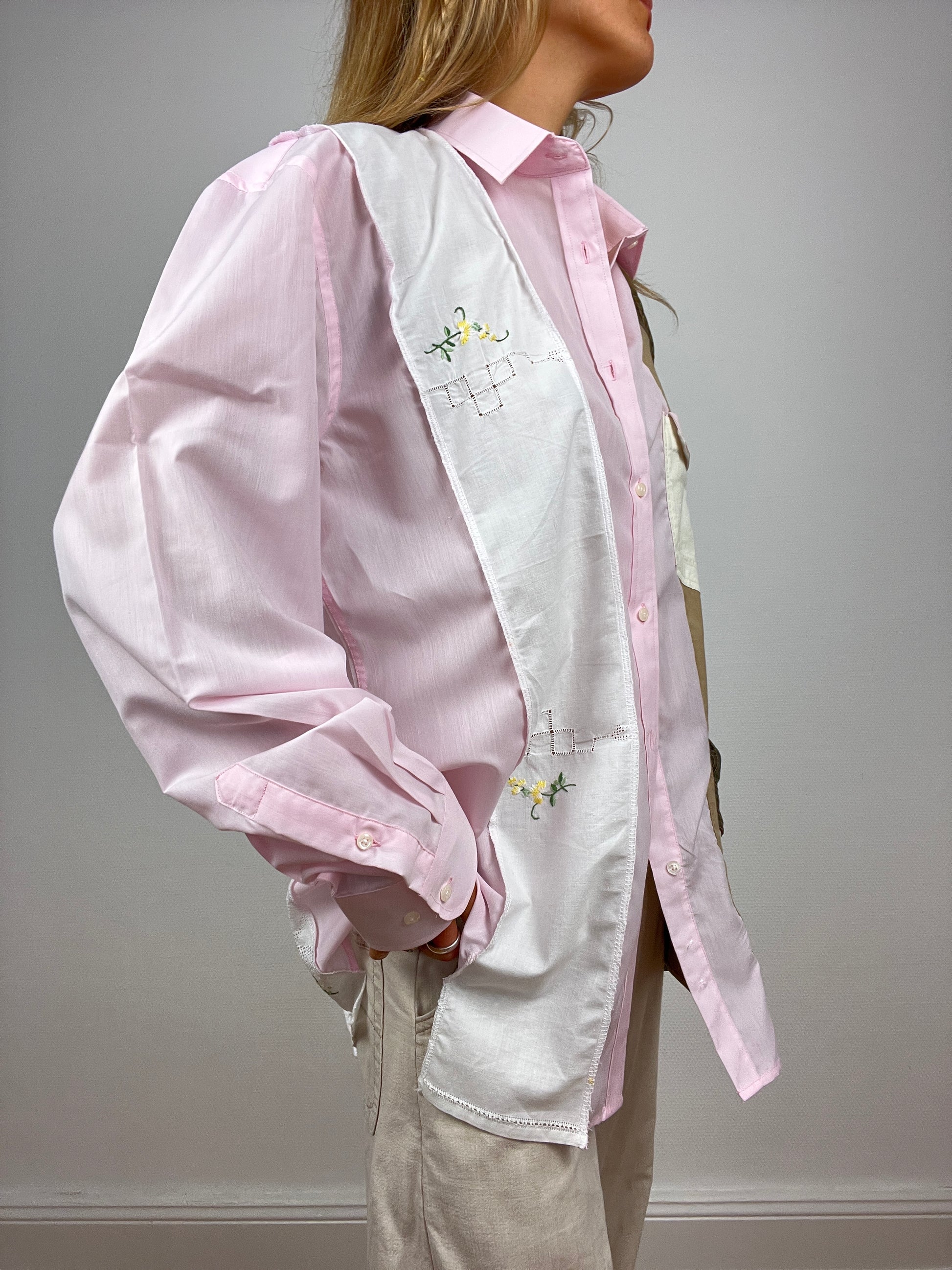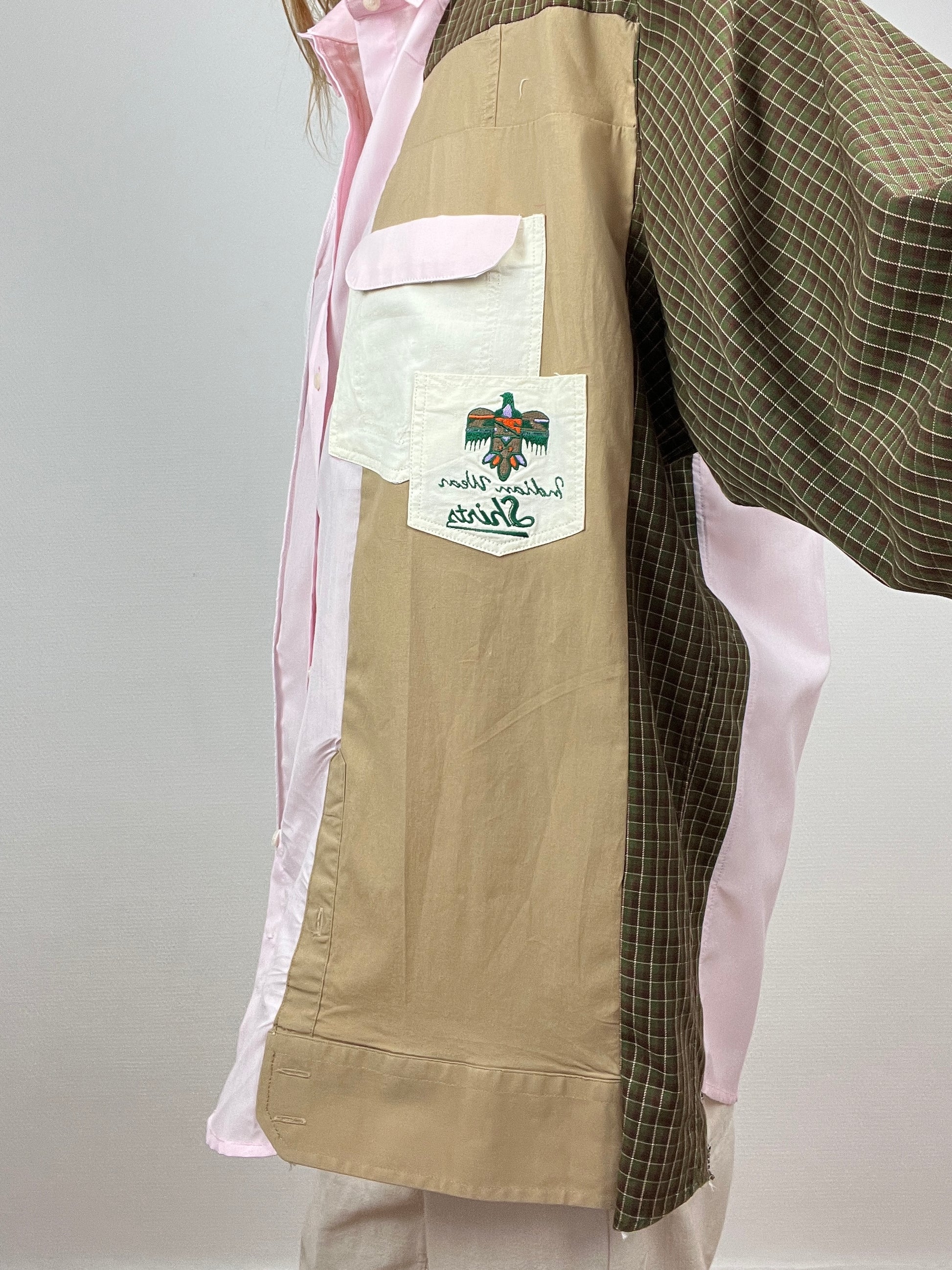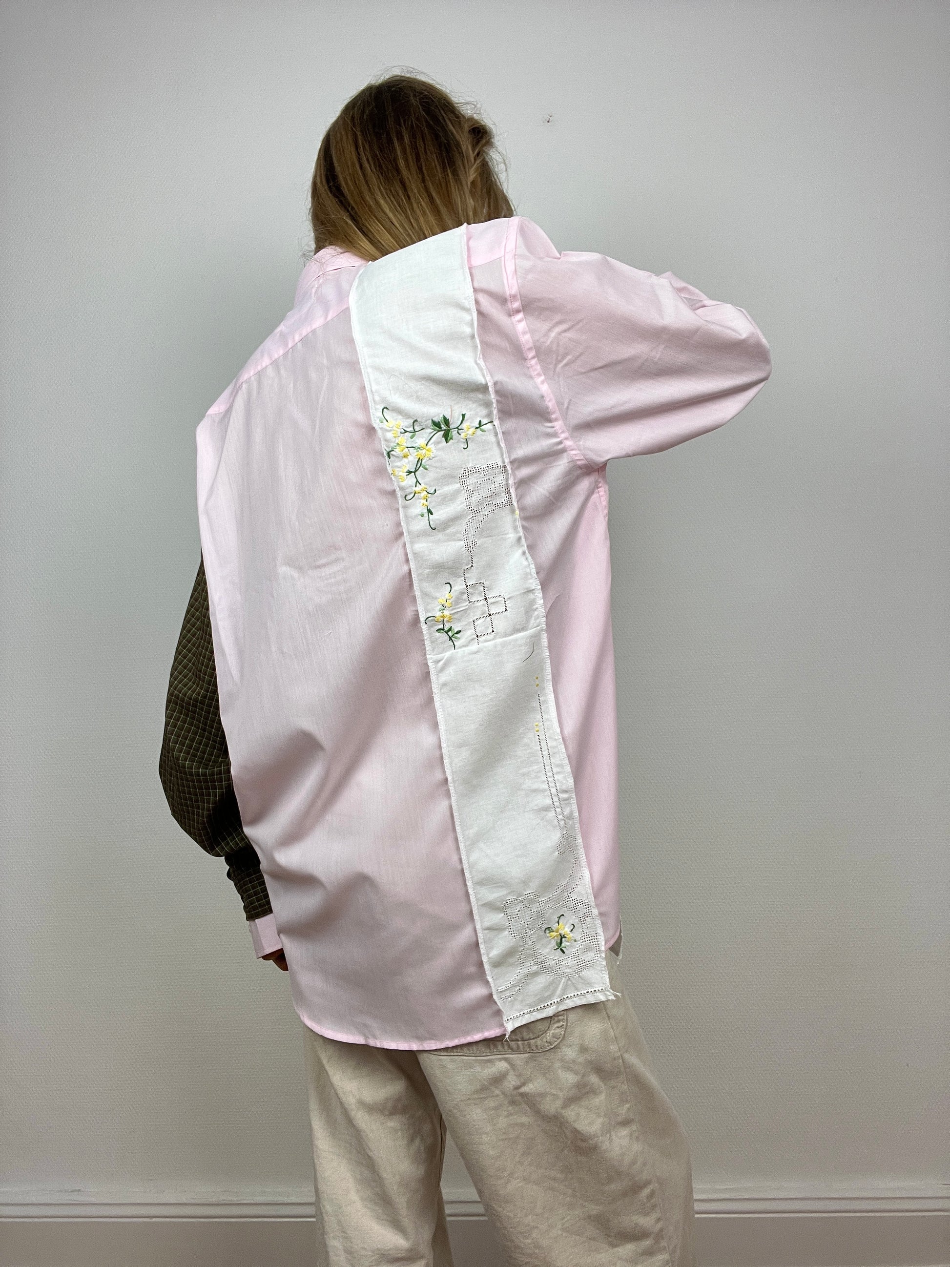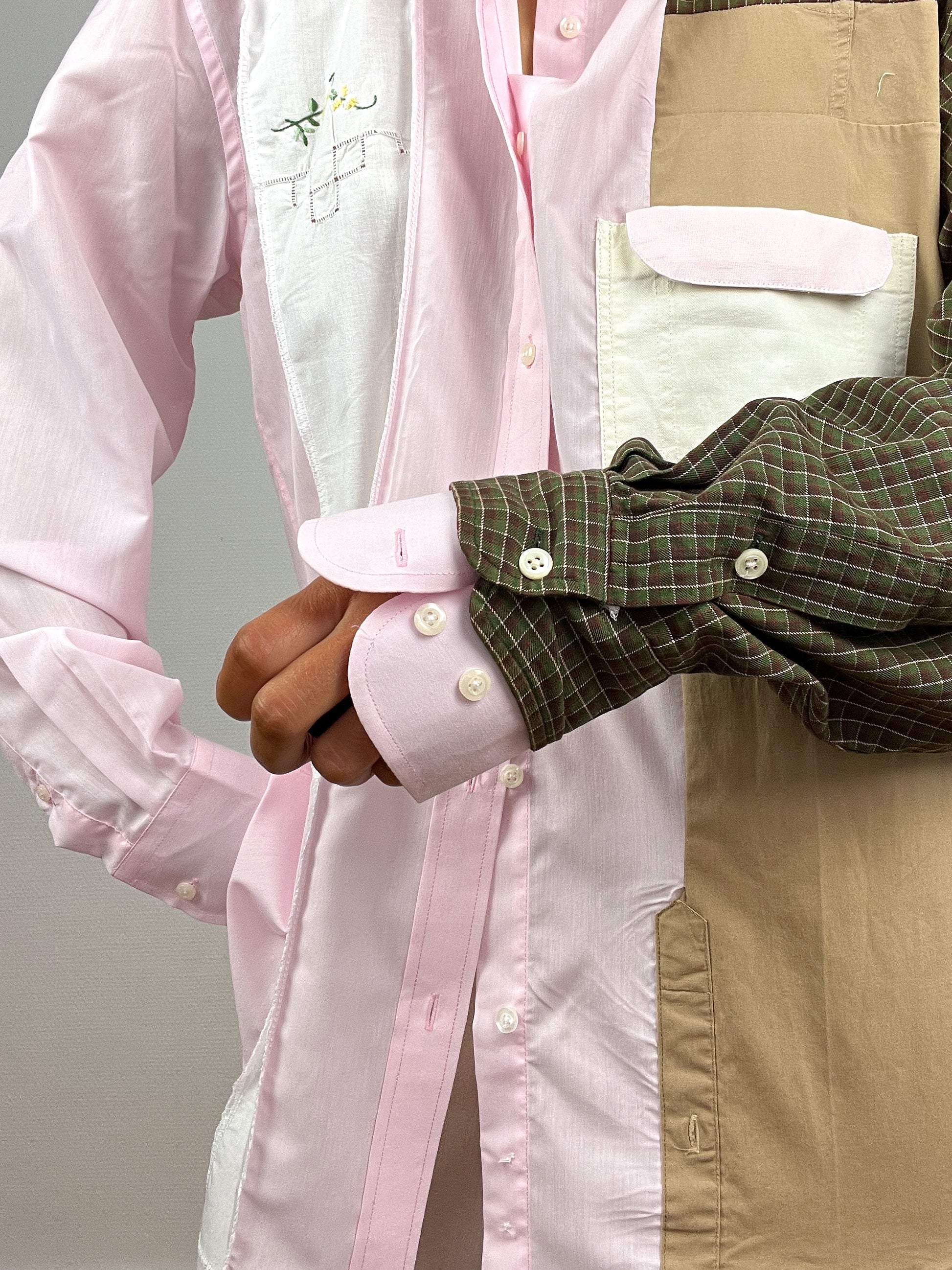 Chemise upcyclée à partir d’un mélange de chutes de chemises. Design avec des touches d’upcycling uniques.