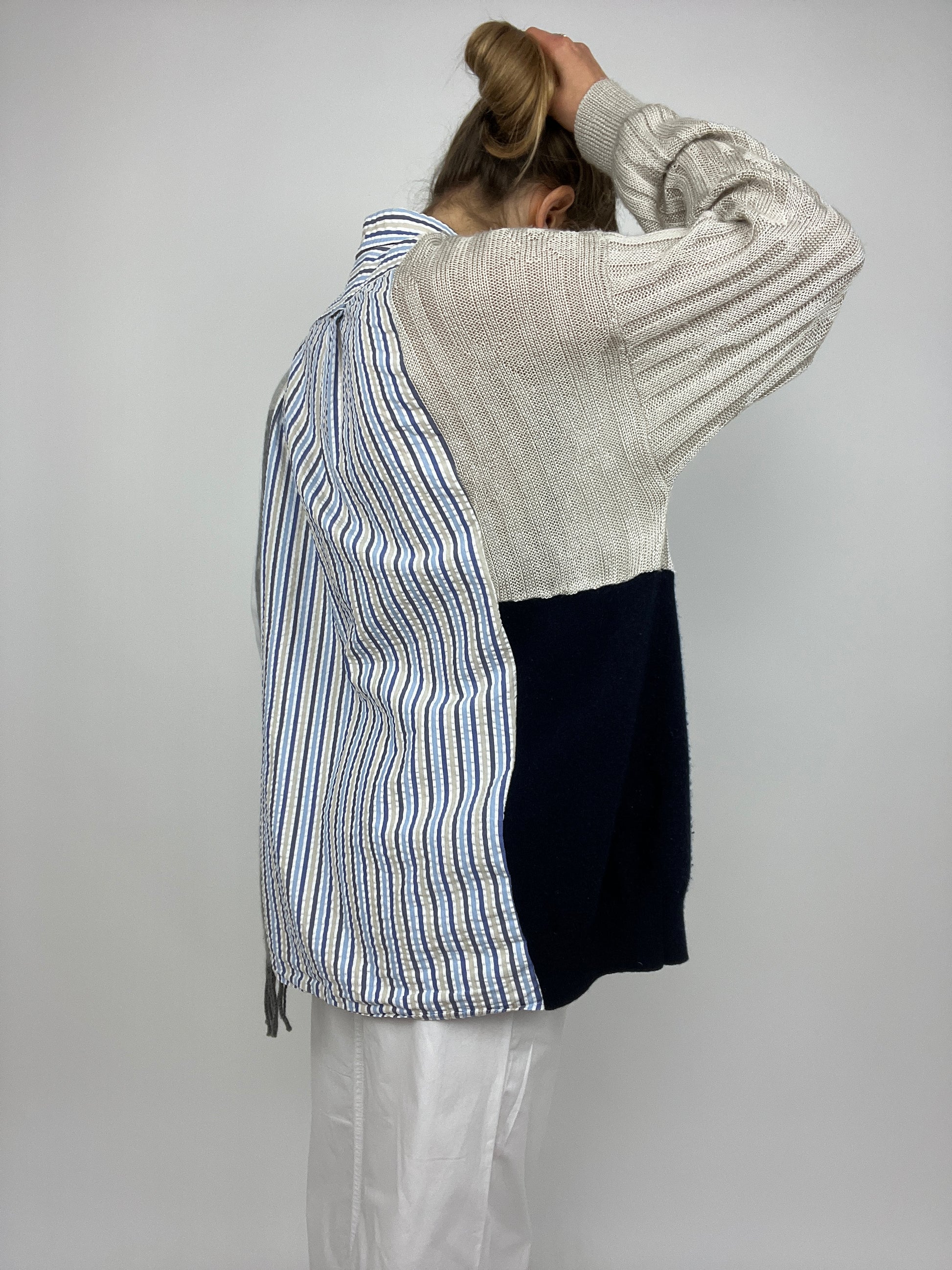 Chemise upcyclée à partir de chutes de chemises et pulls en maille. Design unique avec des touches d'upcycling uniques.