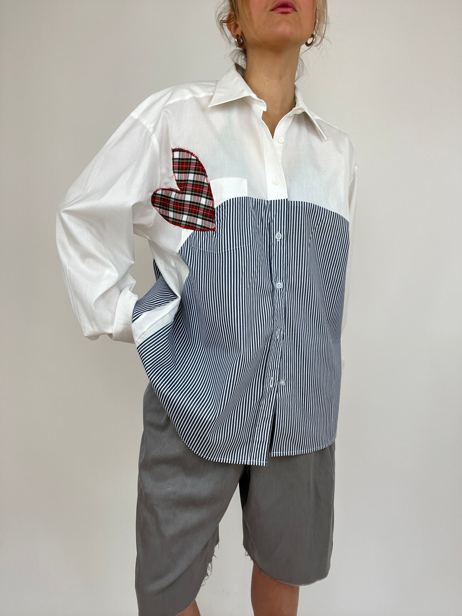 Chemise upcyclée à partir de deux chemises pour homme mélangées. Design unique avec des touches d'upcycling uniques.