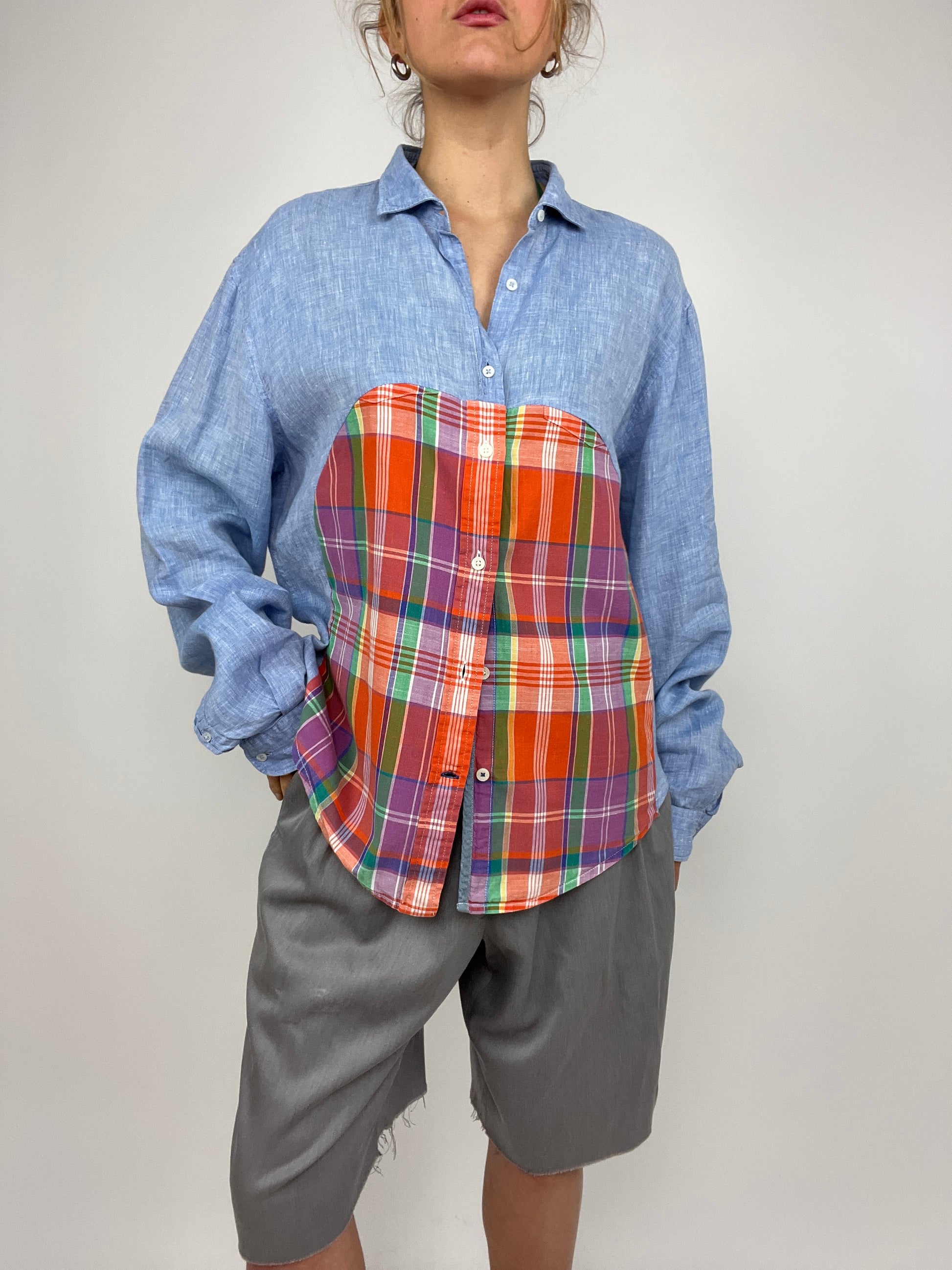 Chemise upcyclée à partir de deux chemises pour homme mélangées. Design unique avec des touches d'upcycling uniques.