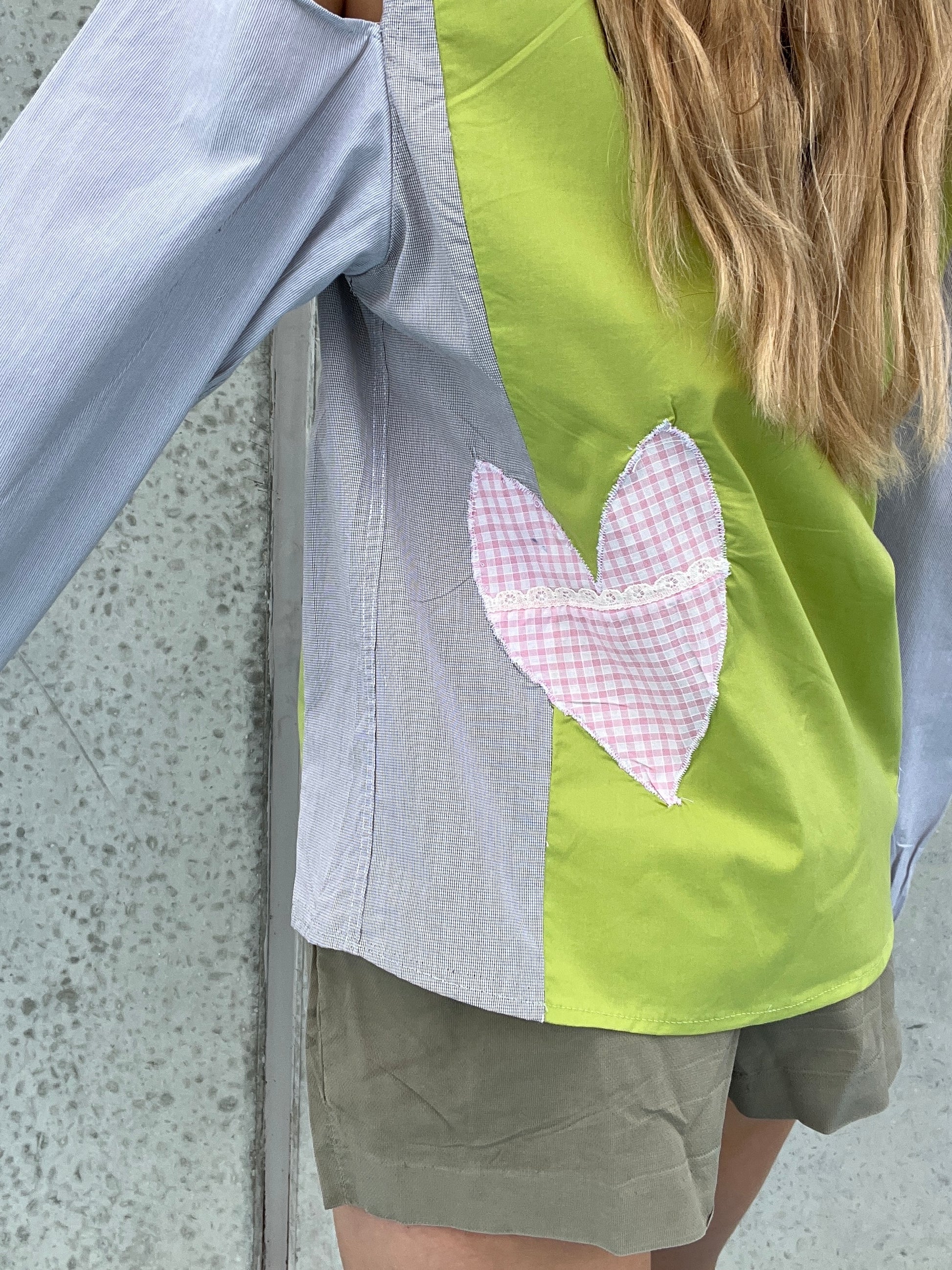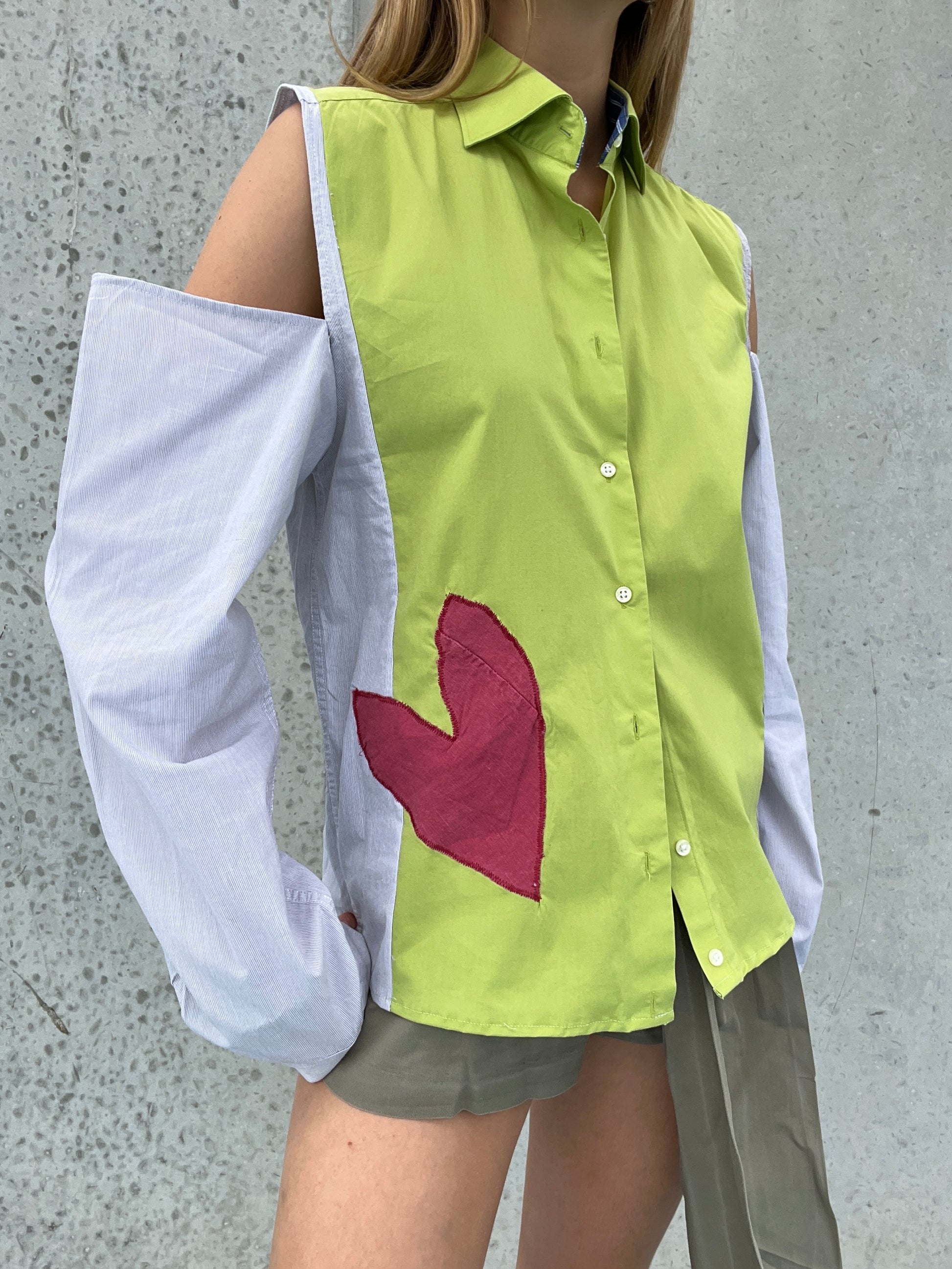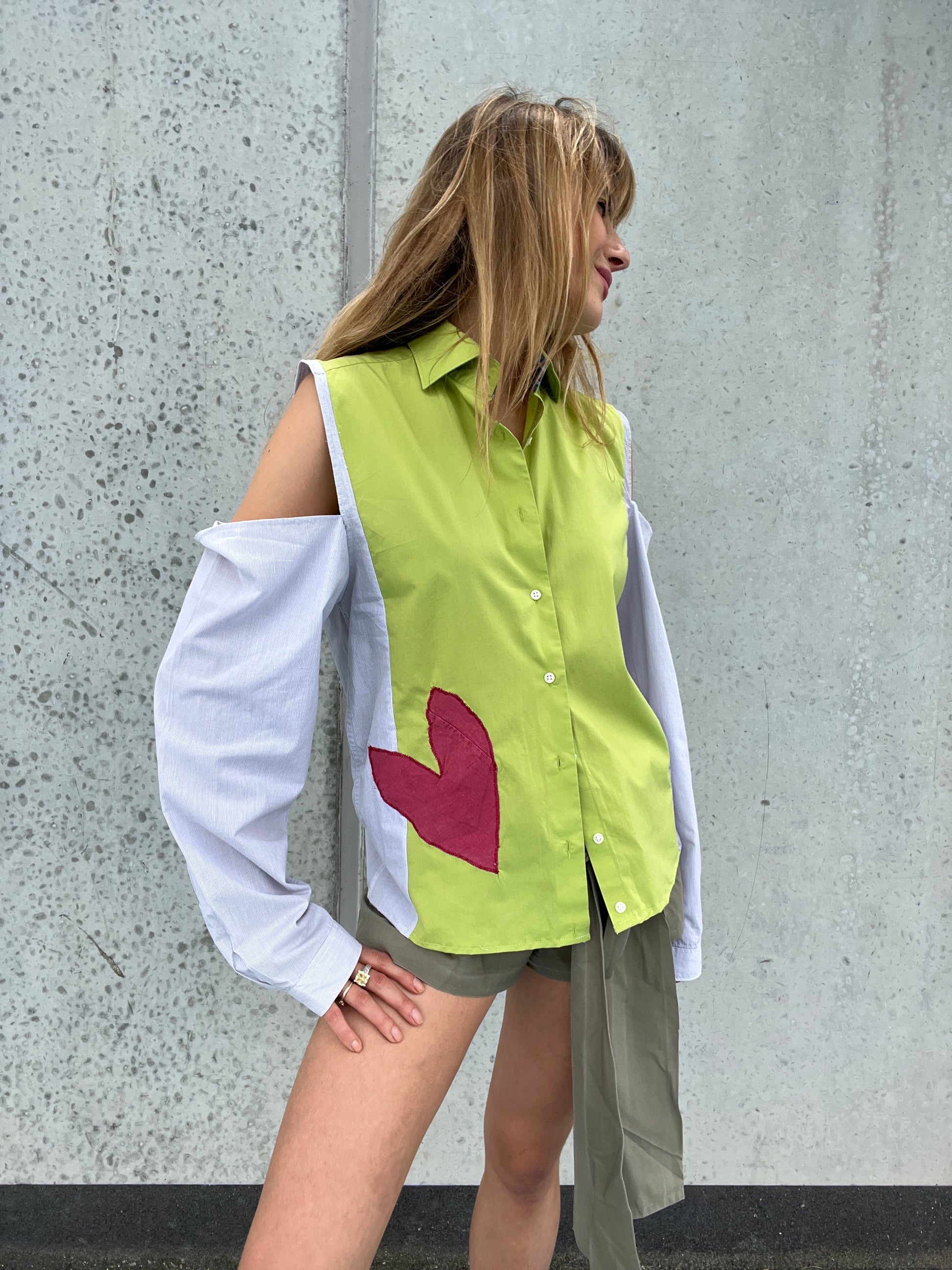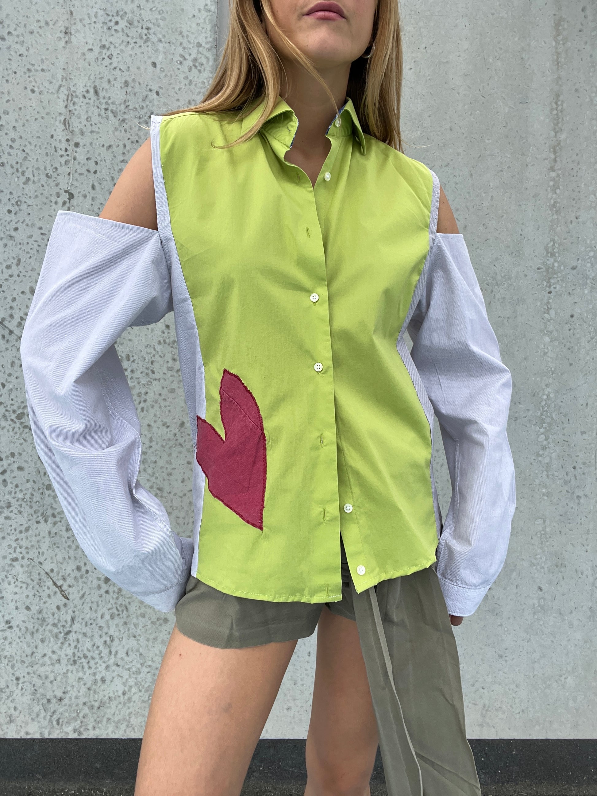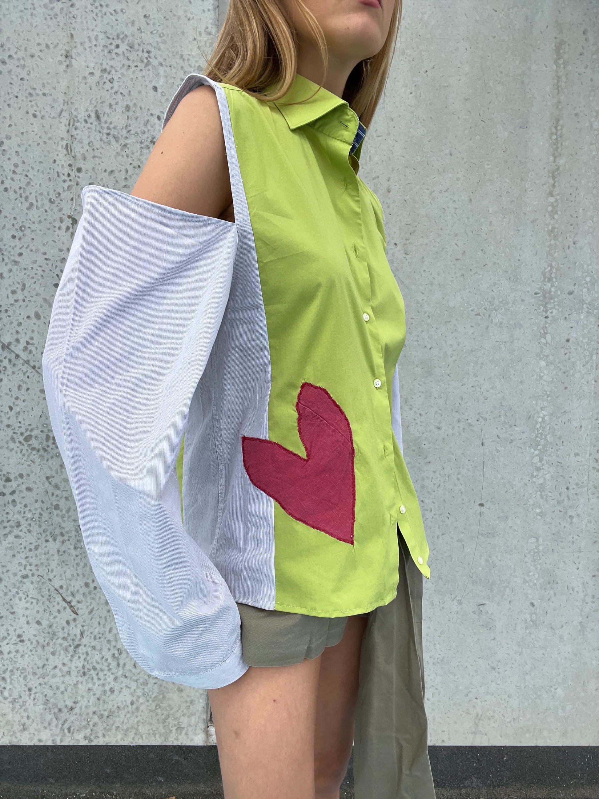 Chemise upcyclée à partir de chemises et chutes de chemises pour homme. Design unique avec le coeur et épaules dénudées.