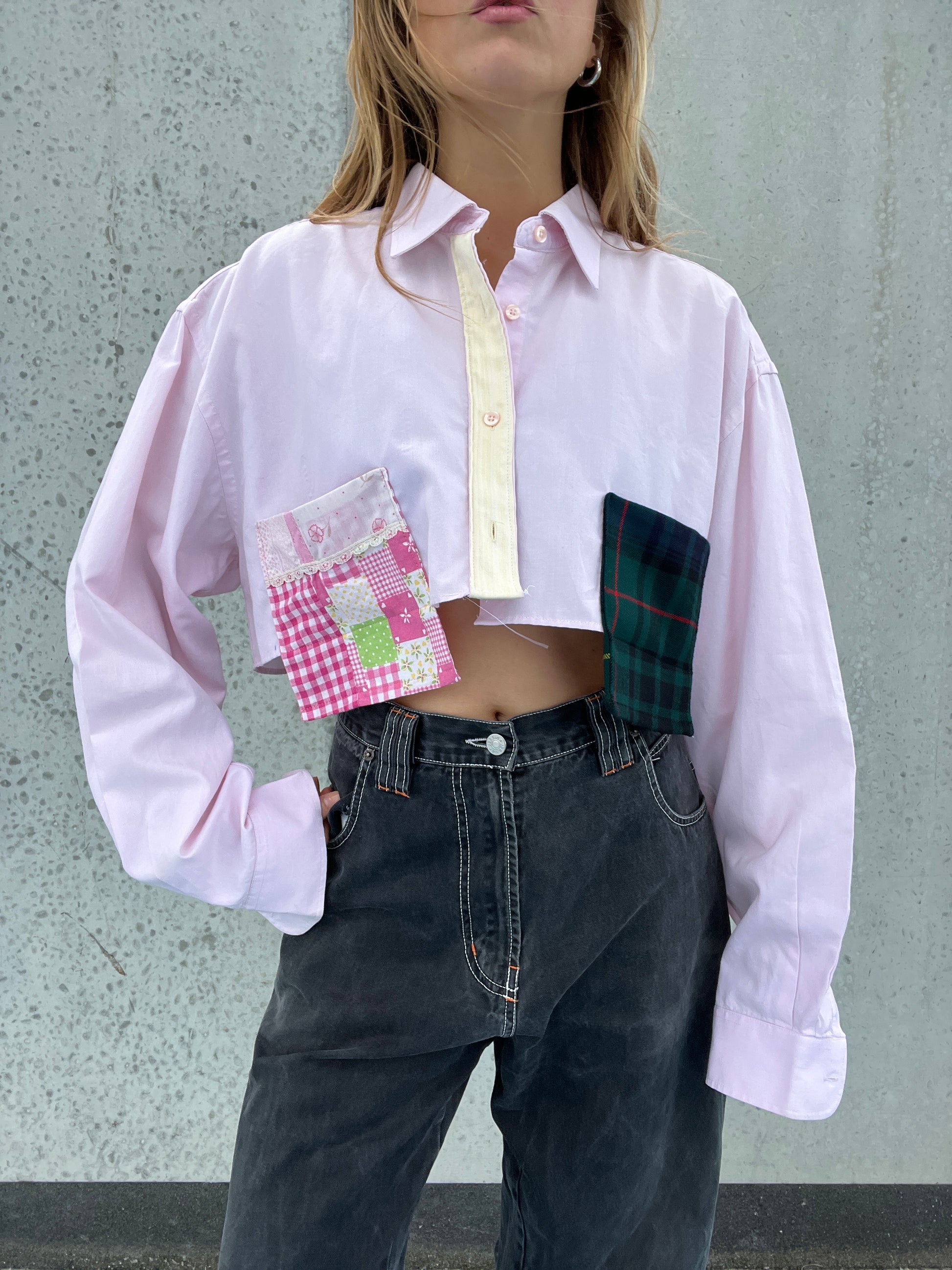 Chemise courte upcyclée à partir de chemises et chutes de chemises pour homme. Design unique à poches flotantes et motif tartan.