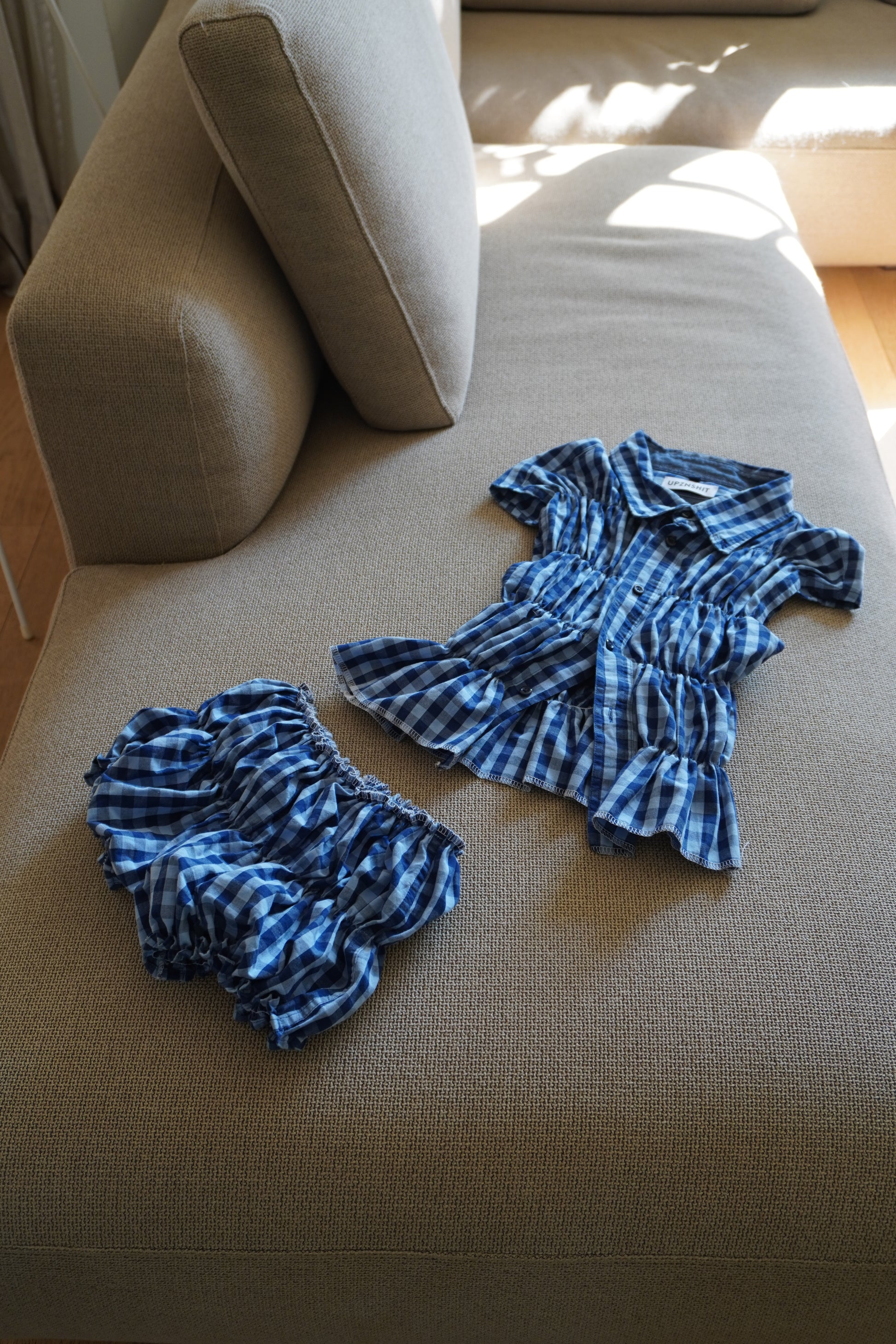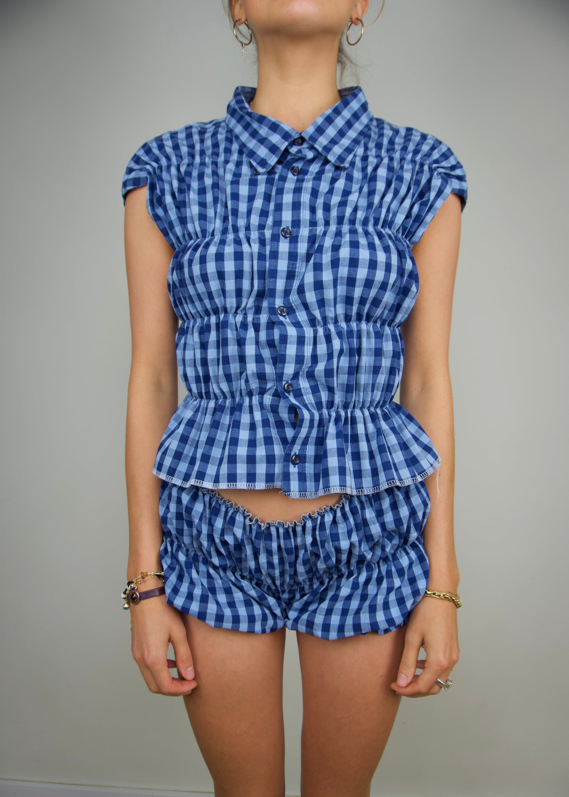 Chemise à fronces, upcyclé à partir d'une chemise pour homme. Shorty Molly assorti à retrouver dans la page produit. Pièce unique à détails uniques.