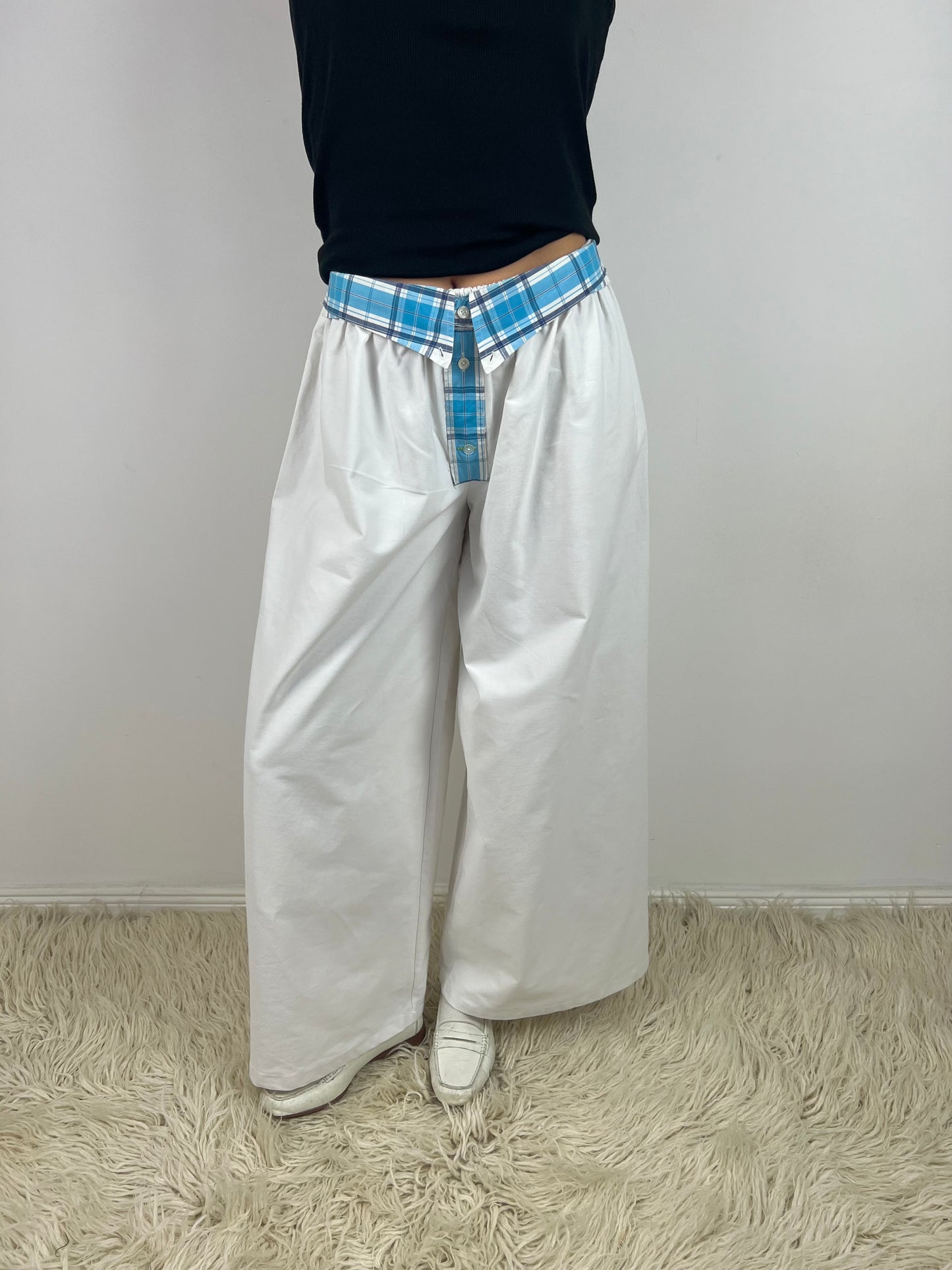 Pantalon fluide blanc, upcyclé à partir de tissu mélangé de lin et de coton, issu de stocks invendus. Il a été associé au col de la vieille chemise de ton daron, qui traînait depuis bien trop longtemps dans son armoire.