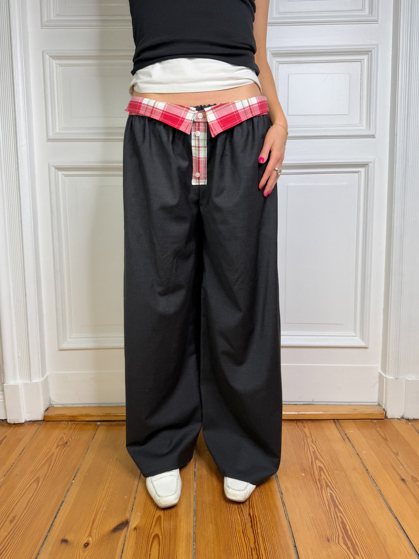Pantalon fluide gris anthracite en laine fine, issu de stocks dormants. Associé avec le col d’une chemise oubliée. Probablement celle de ton ex. Il ne méritait pas de la garder de toute façon.