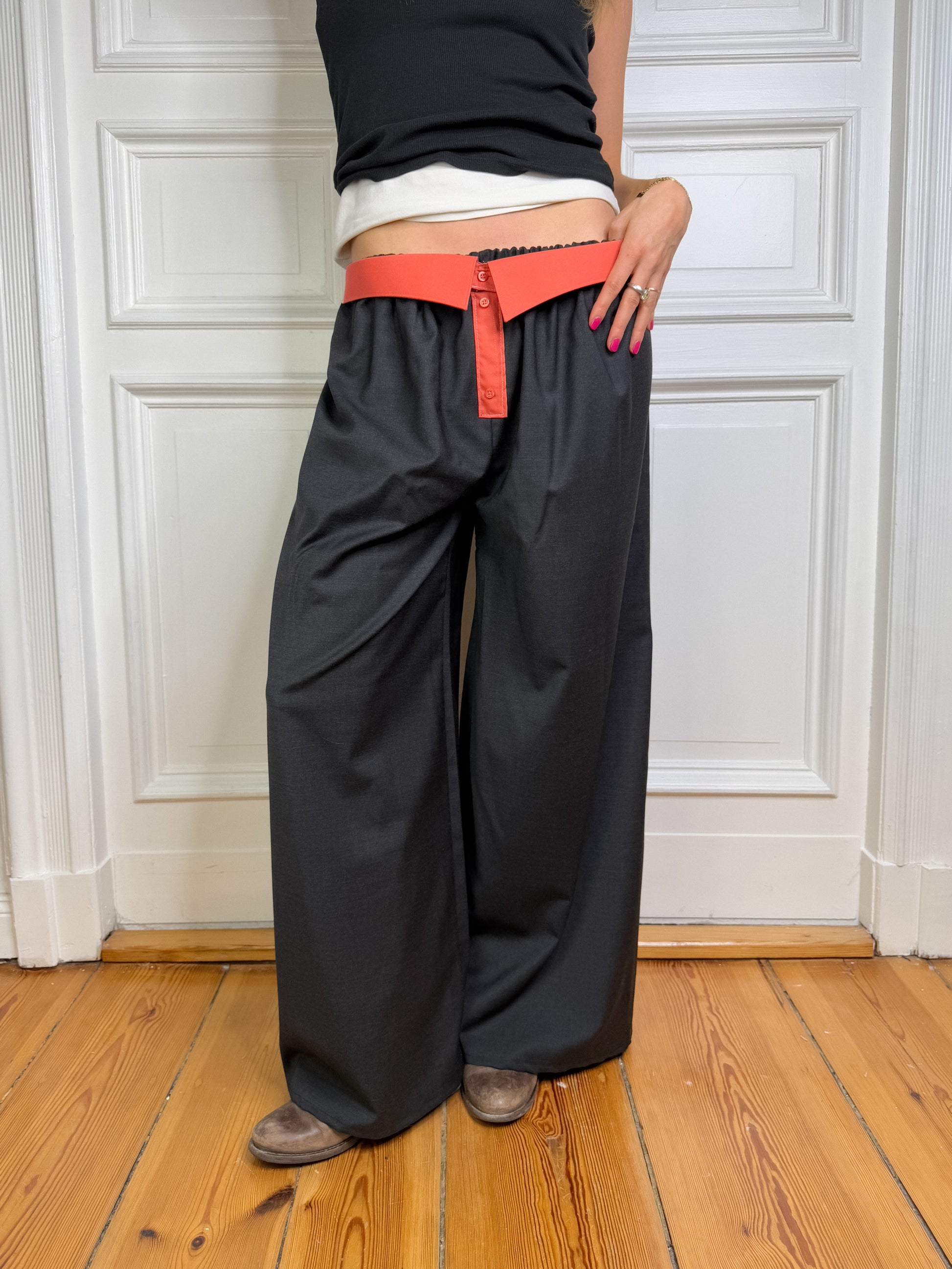 Pantalon fluide gris anthracite en laine fine, issu de stocks dormants. Associé avec le col d’une chemise oubliée. Probablement celle de ton ex. Il ne méritait pas de la garder de toute façon.