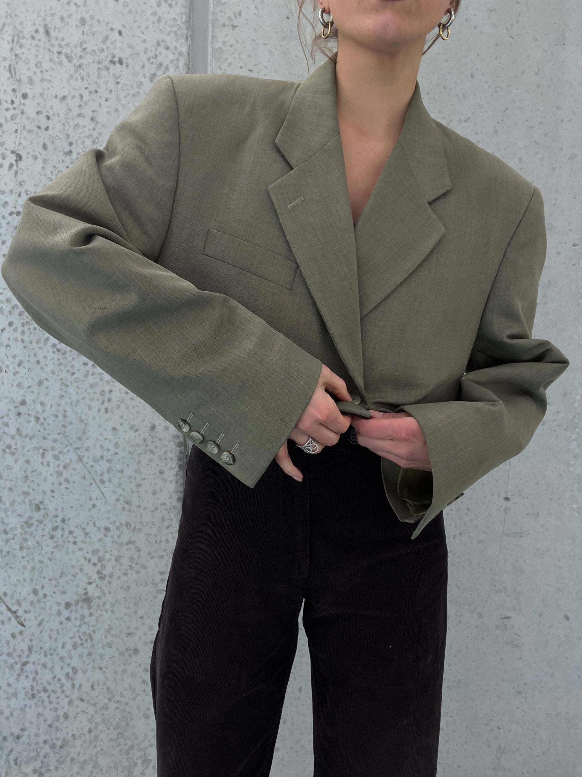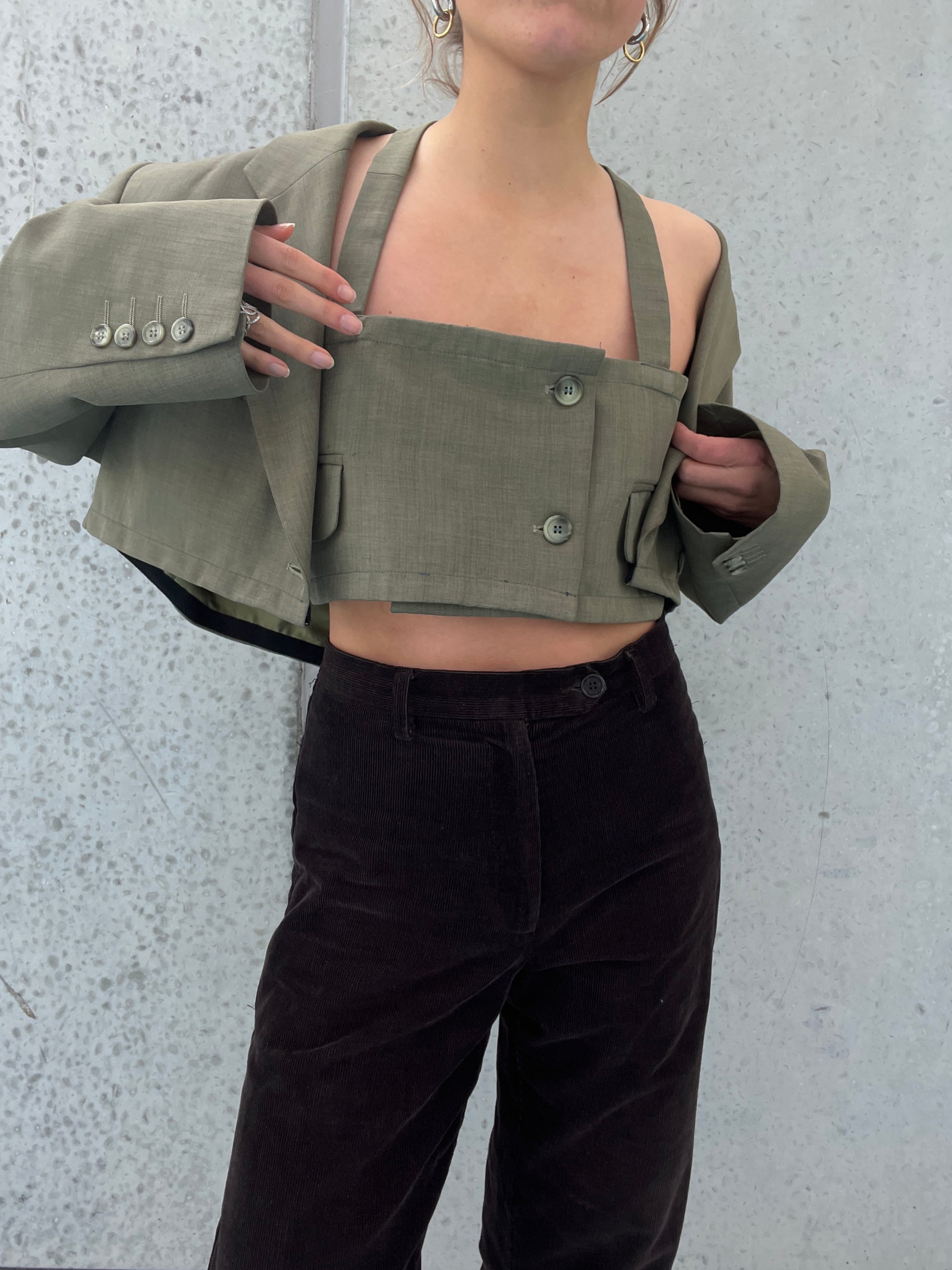 Le JP Set ou Jean-Paul, upcyclé à partir d’une veste de costume vintage pour homme. Top de costume boutonné vert, avec sa veste courte assortie.