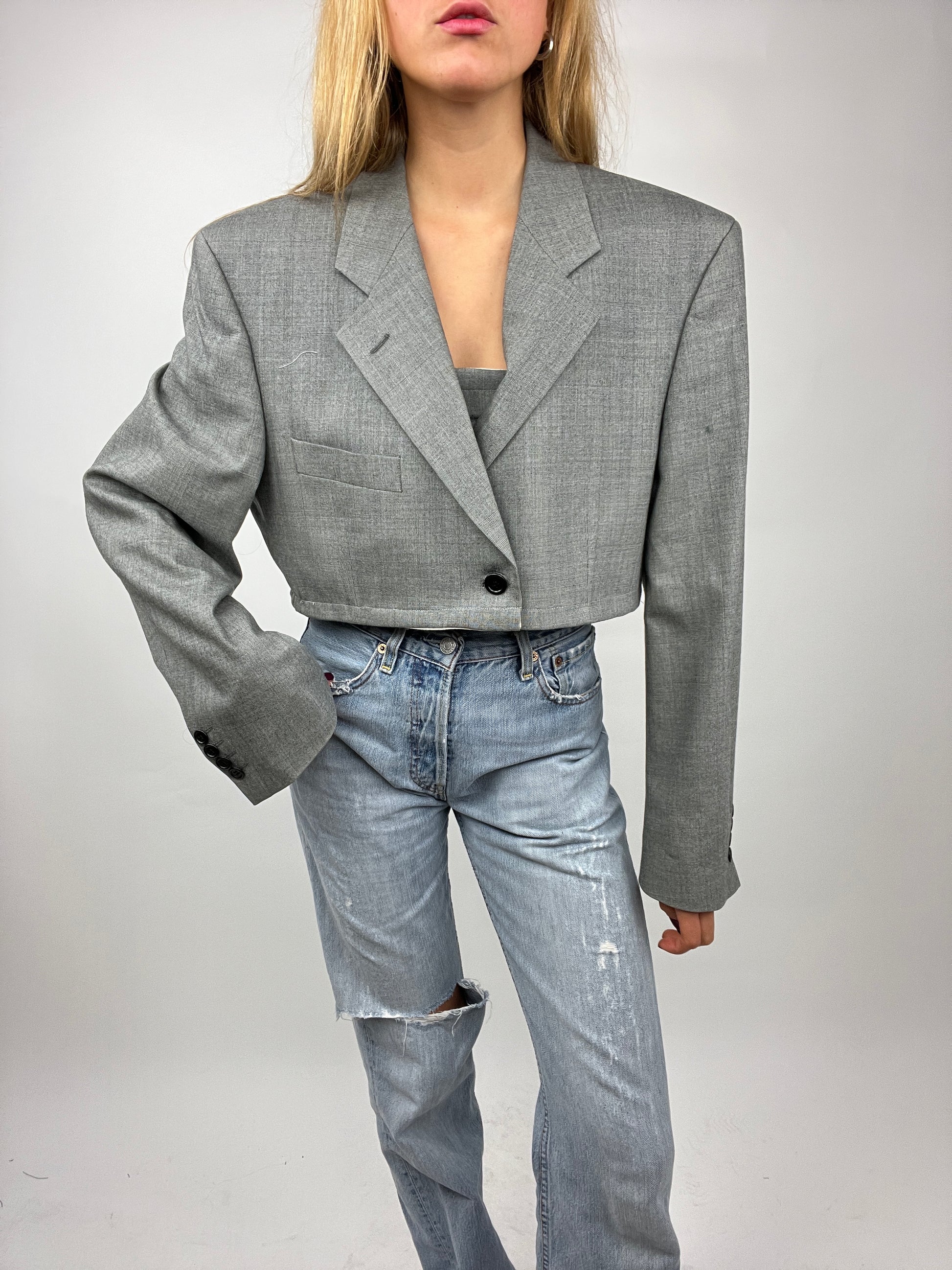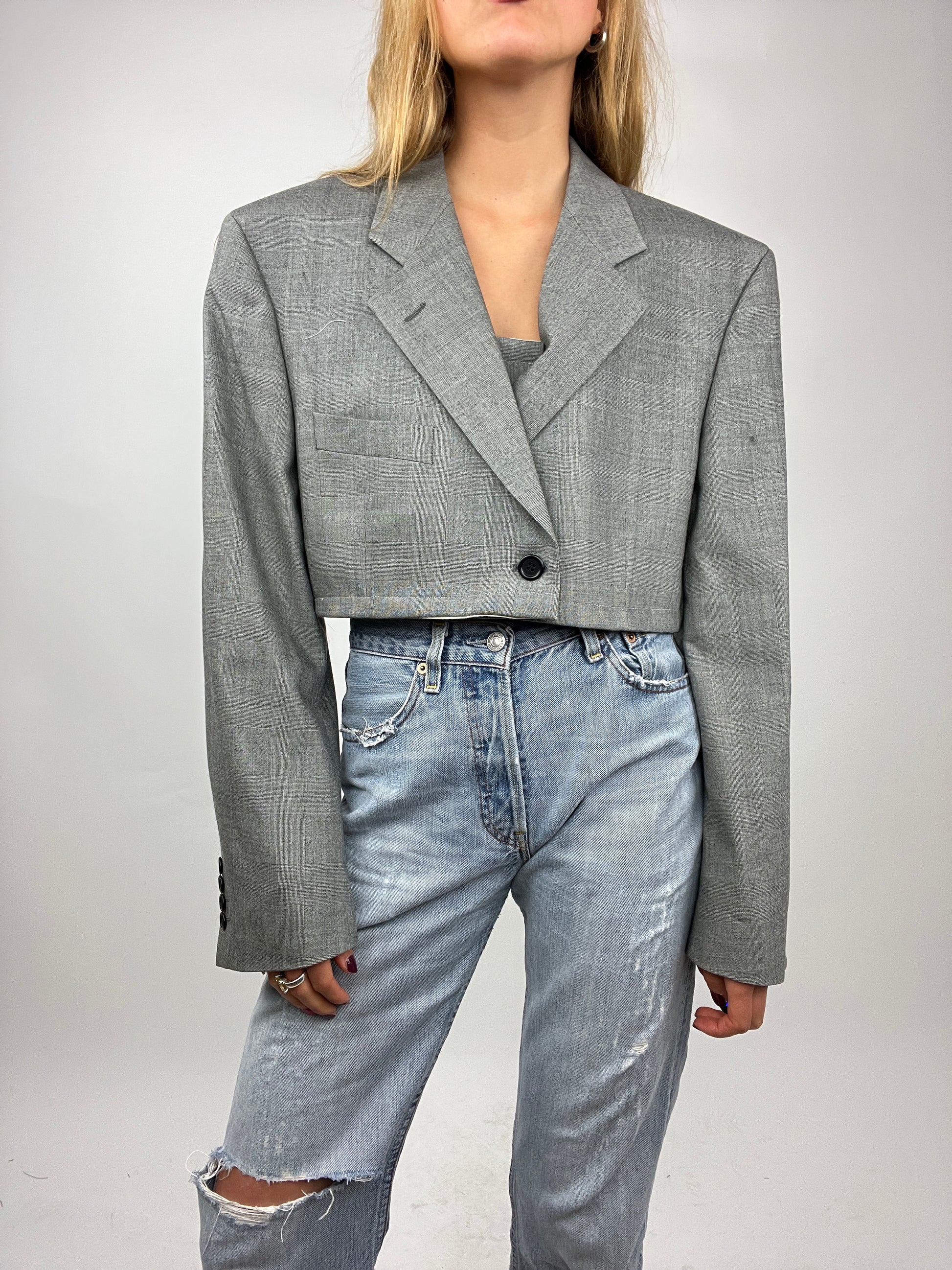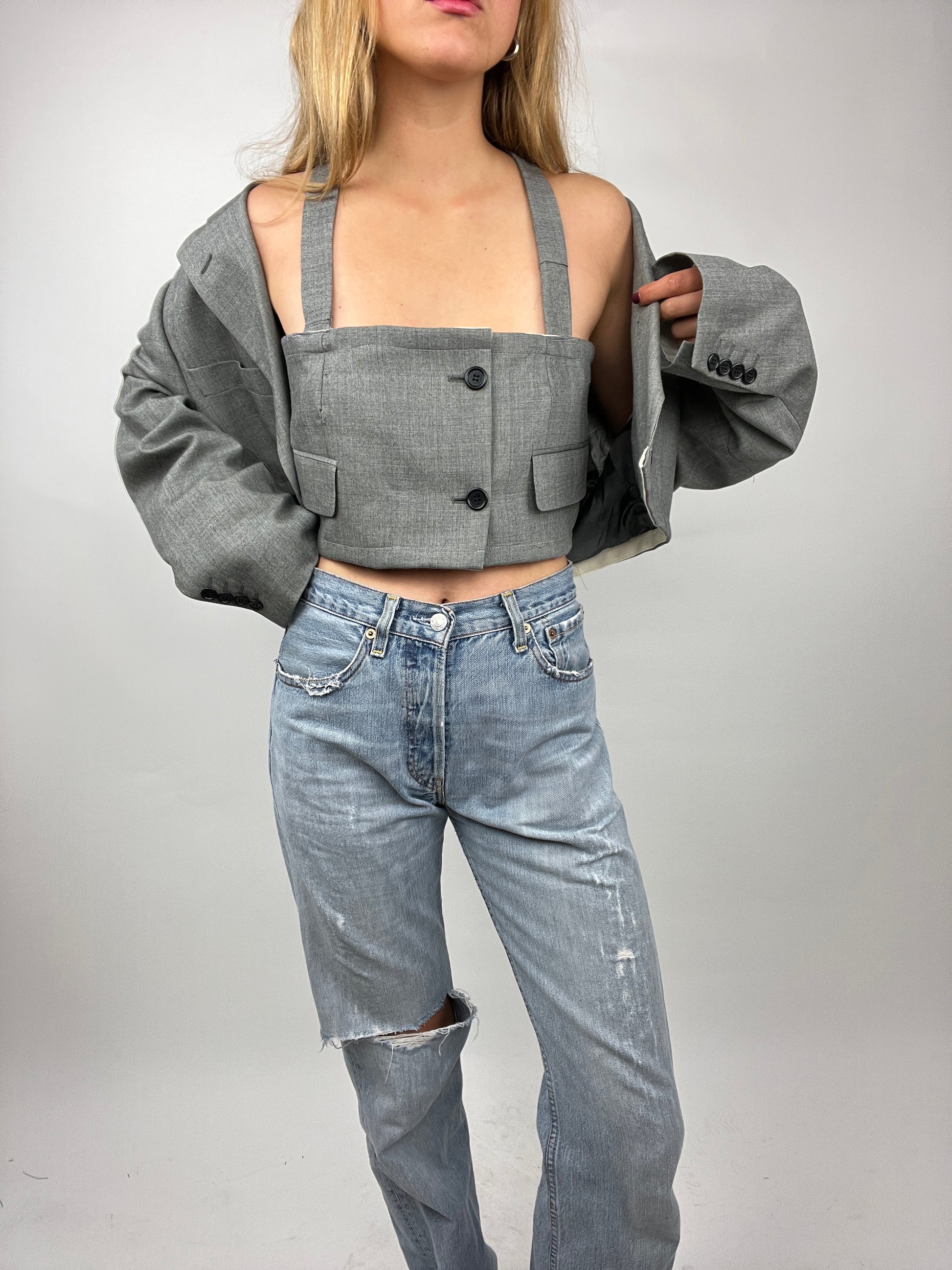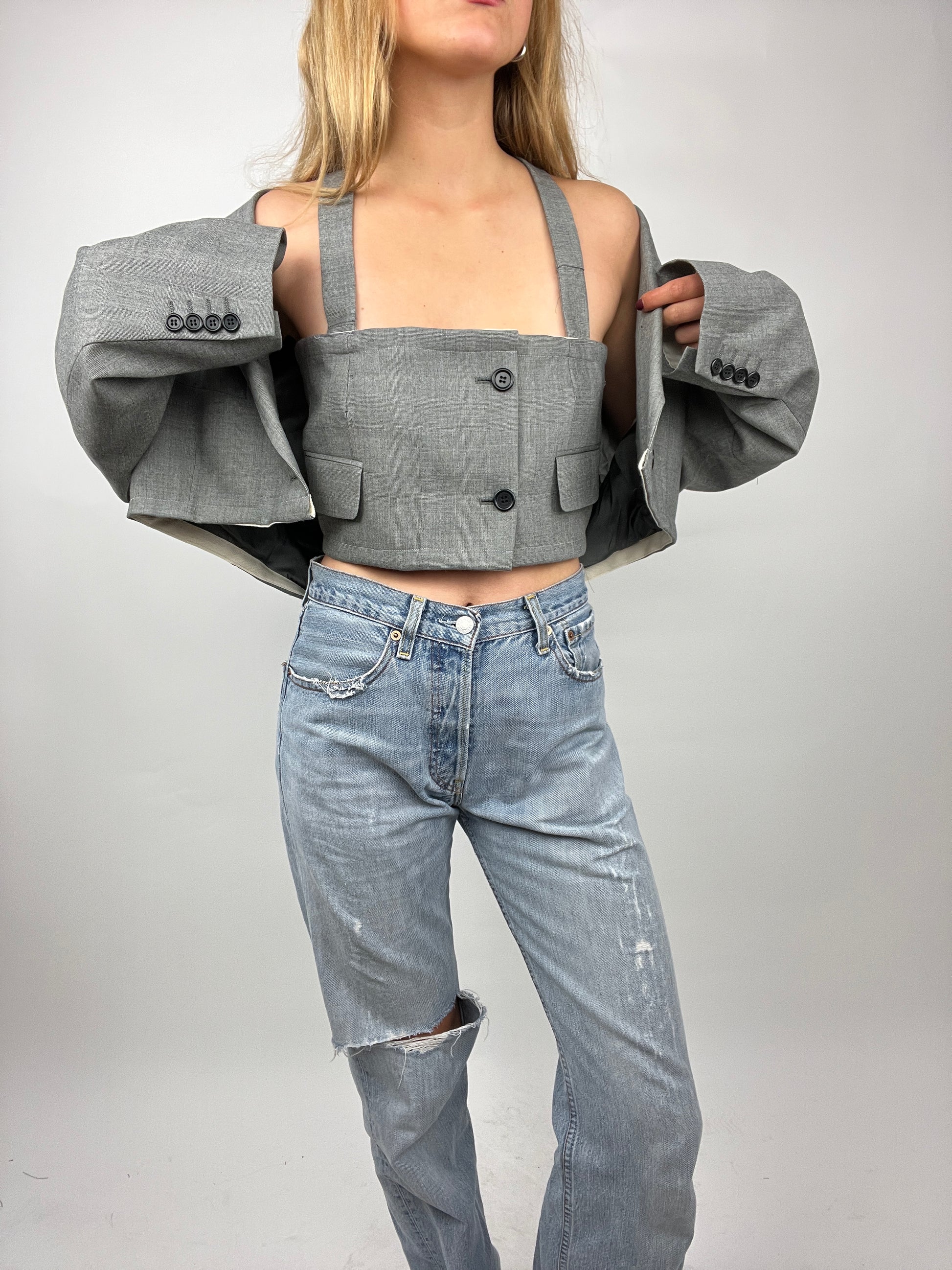 Le JP Set ou Jean-Paul, upcyclé à partir d’une veste de costume pour homme. Top de costume gris à légers carreaux, avec sa veste courte assortie.
