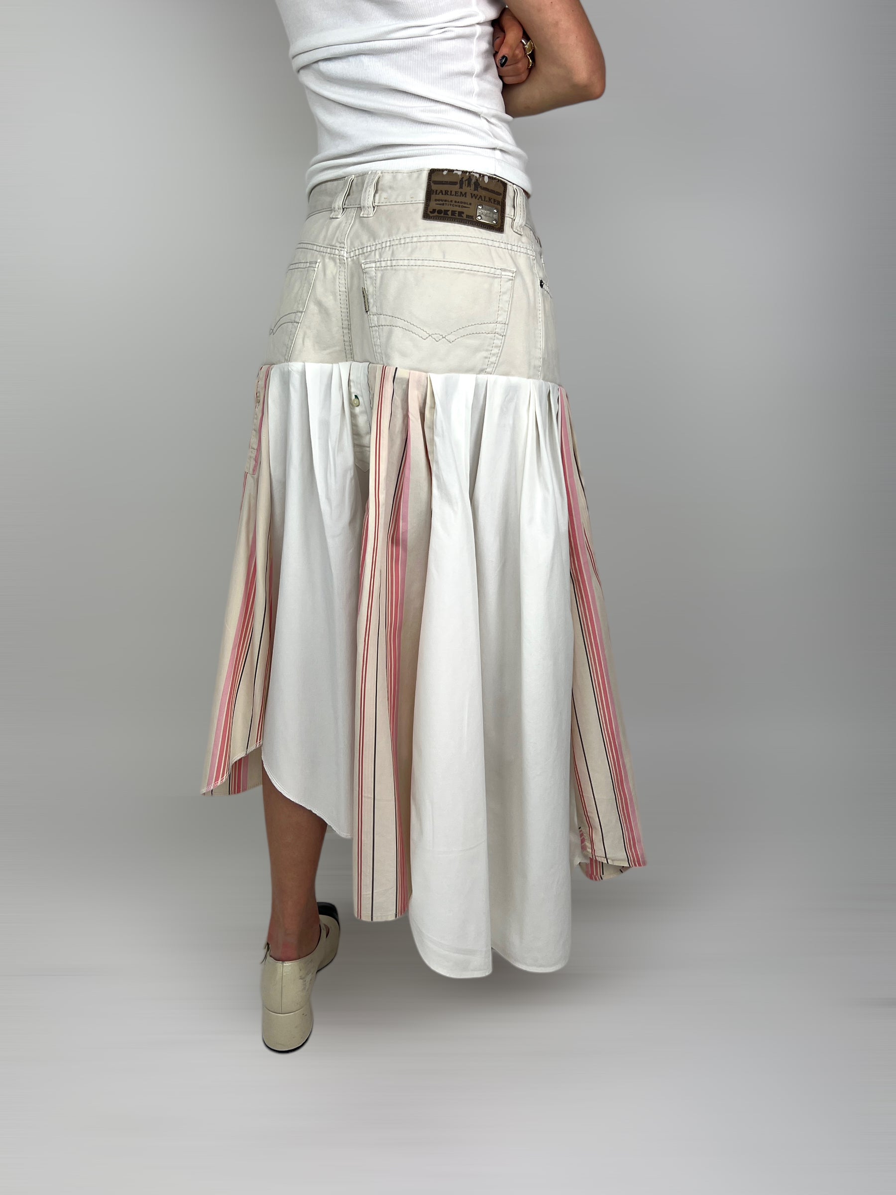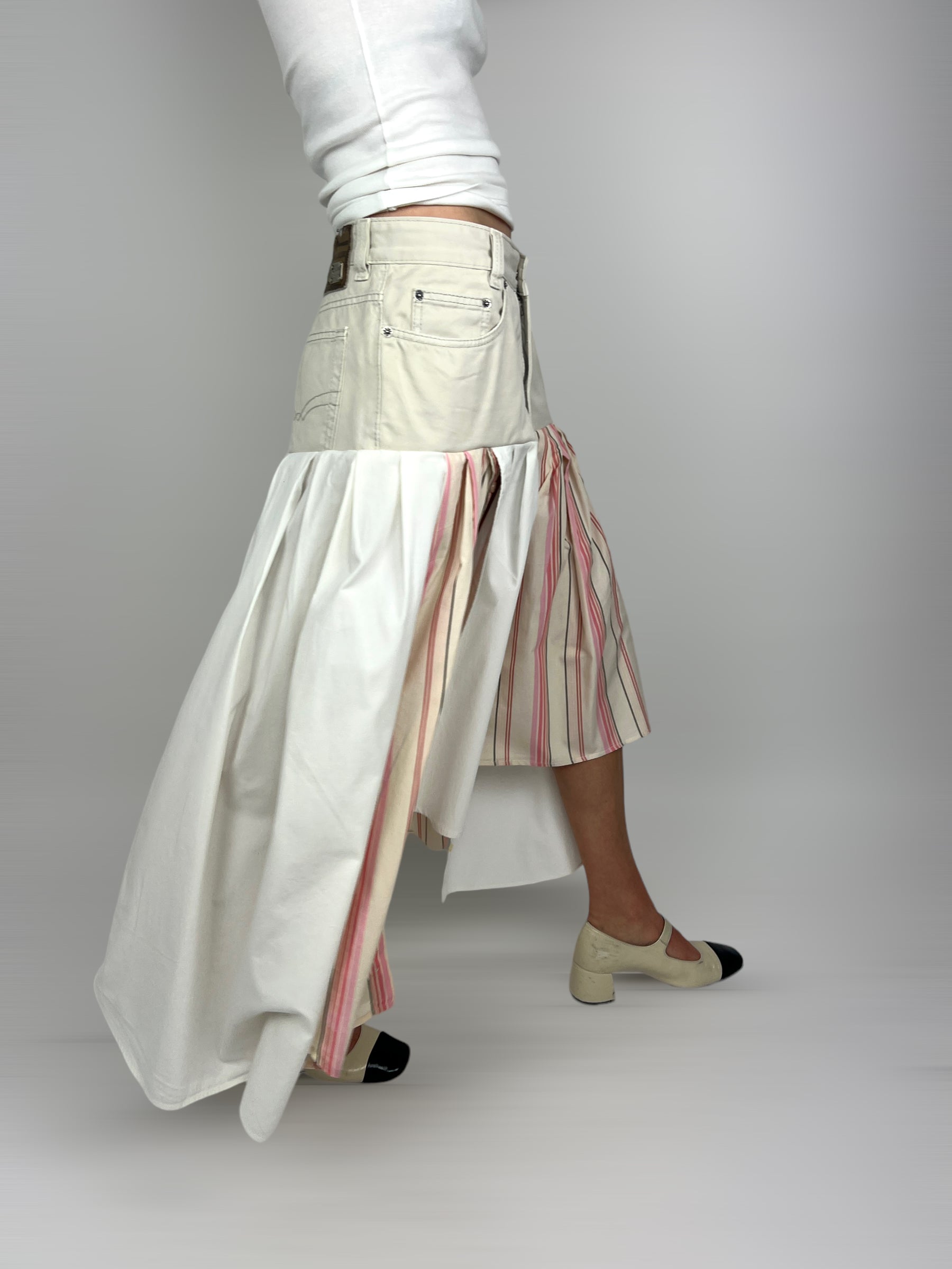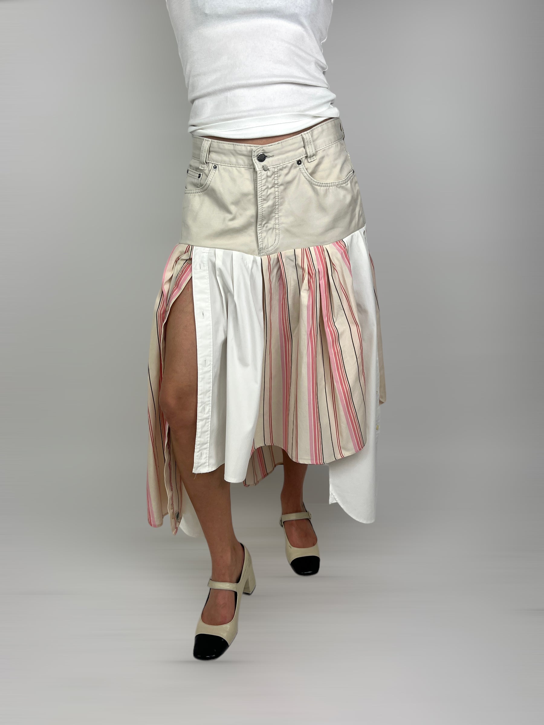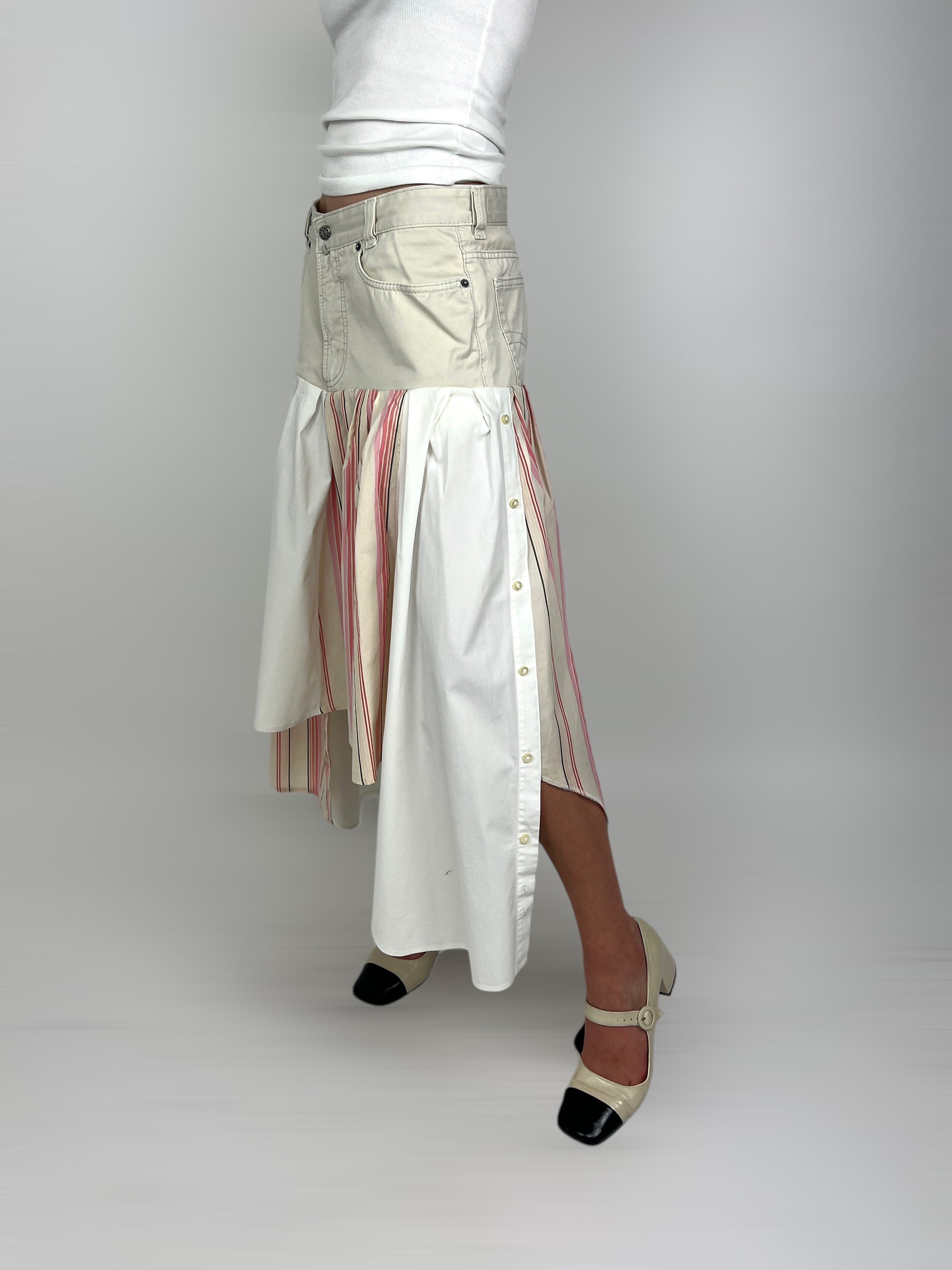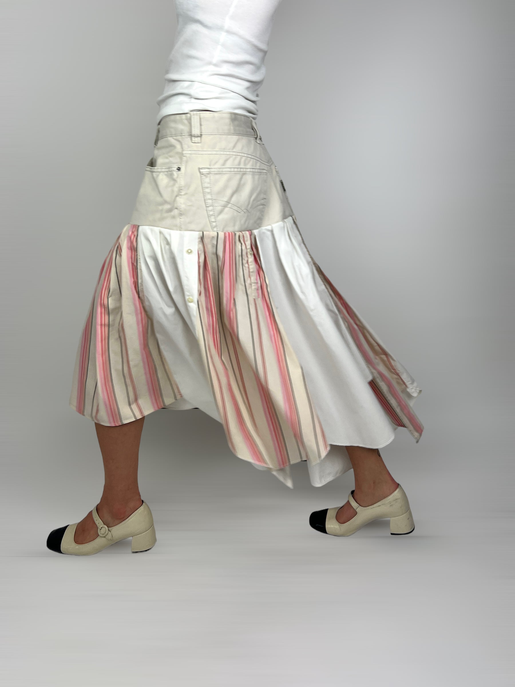 Jupe “June” upcyclée à partir d’un pantalon de costume et deux chemises pour homme. Design unique avec des asymétries et touches d’upcycling uniques.