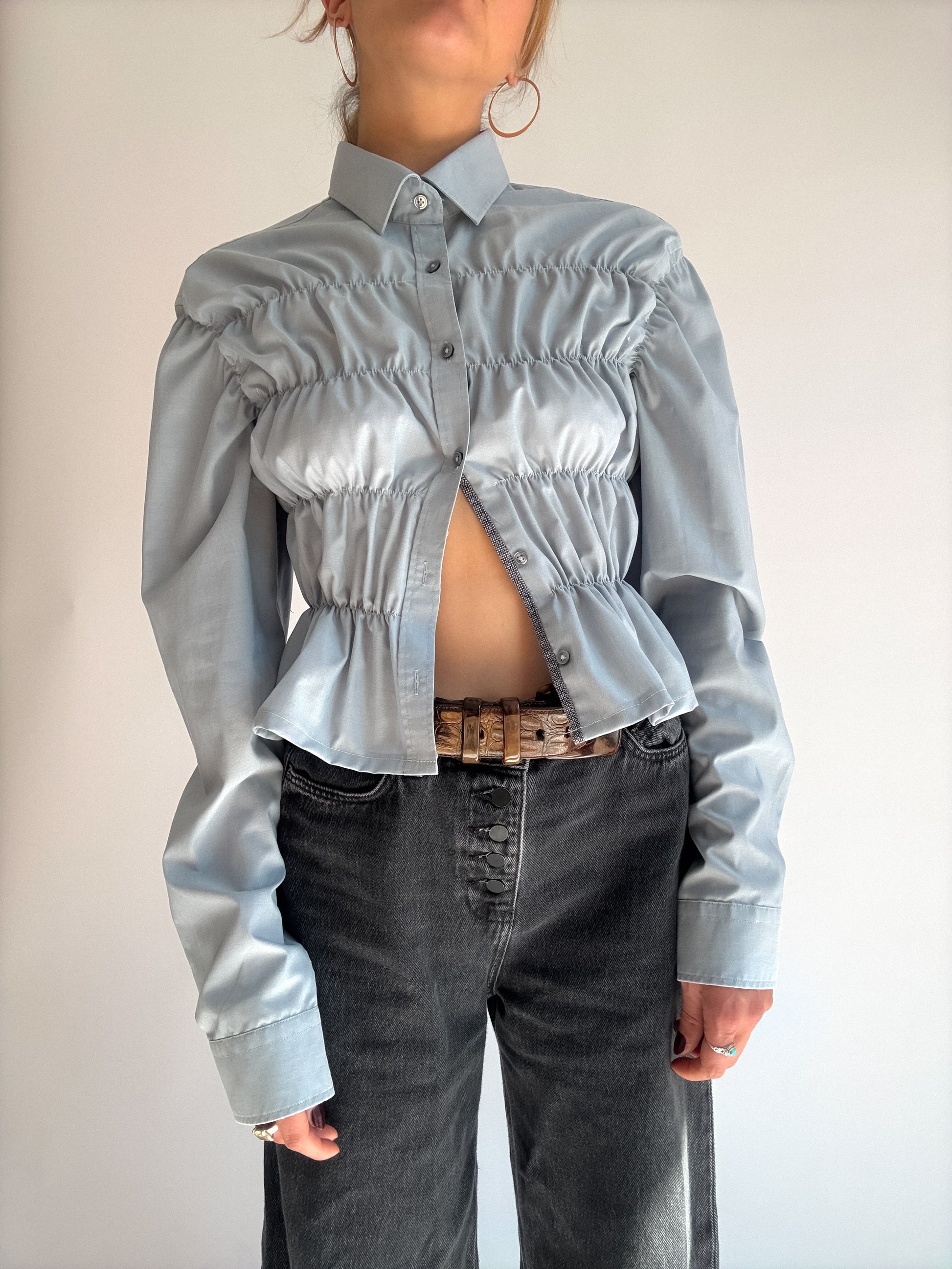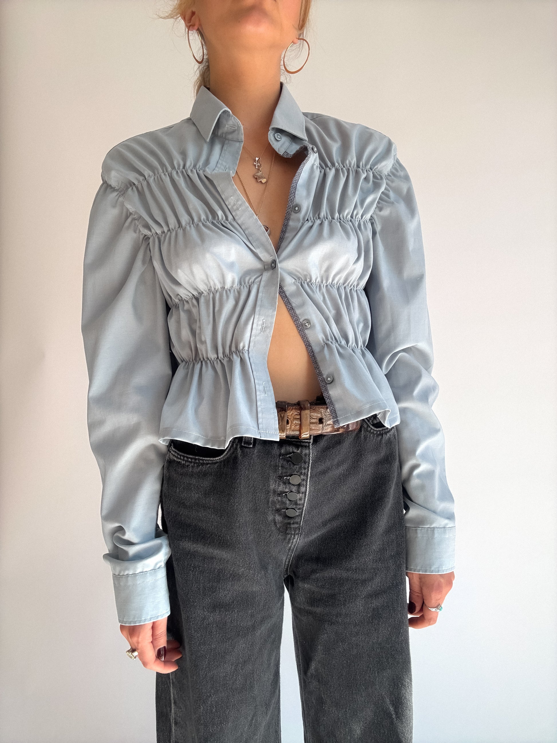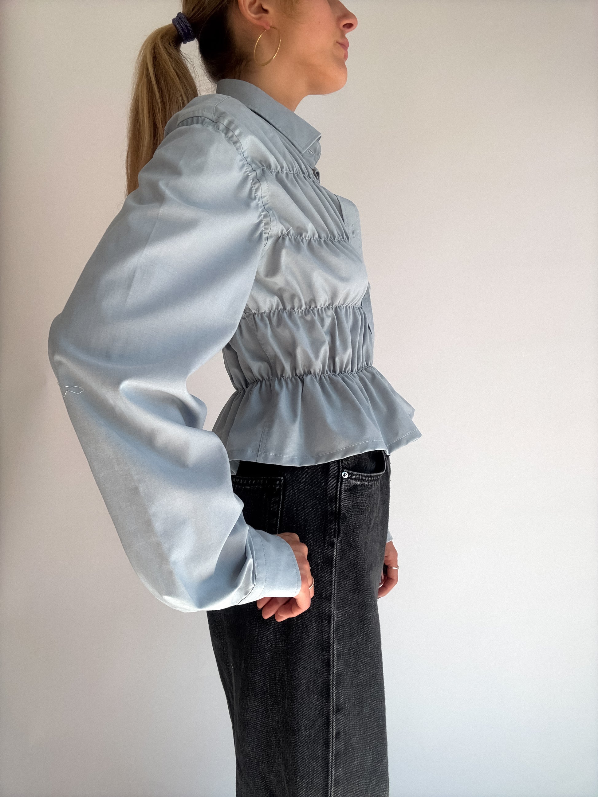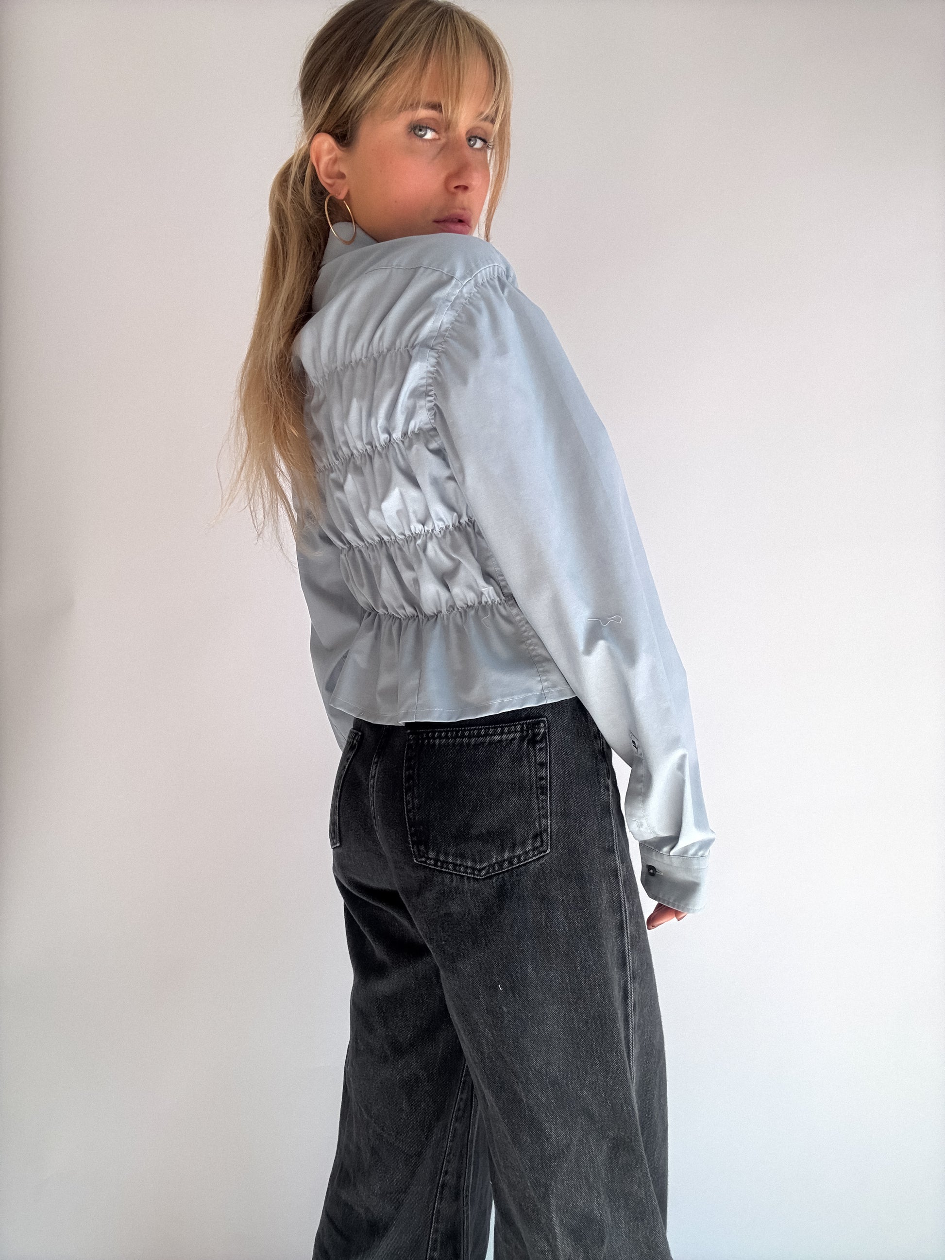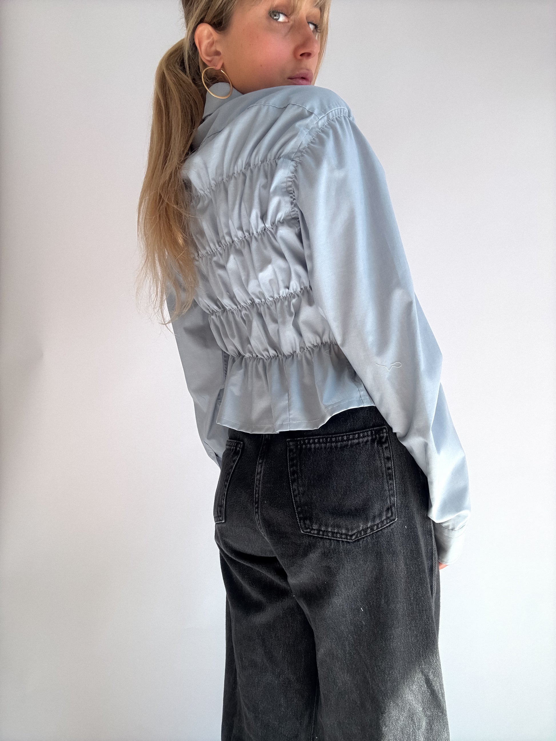 Chemise à fronces, upcyclée à partir d'une chemise oubliée de ton daron. Pièce unique à la taille élastique, qui épousera joliment ta silhouette.