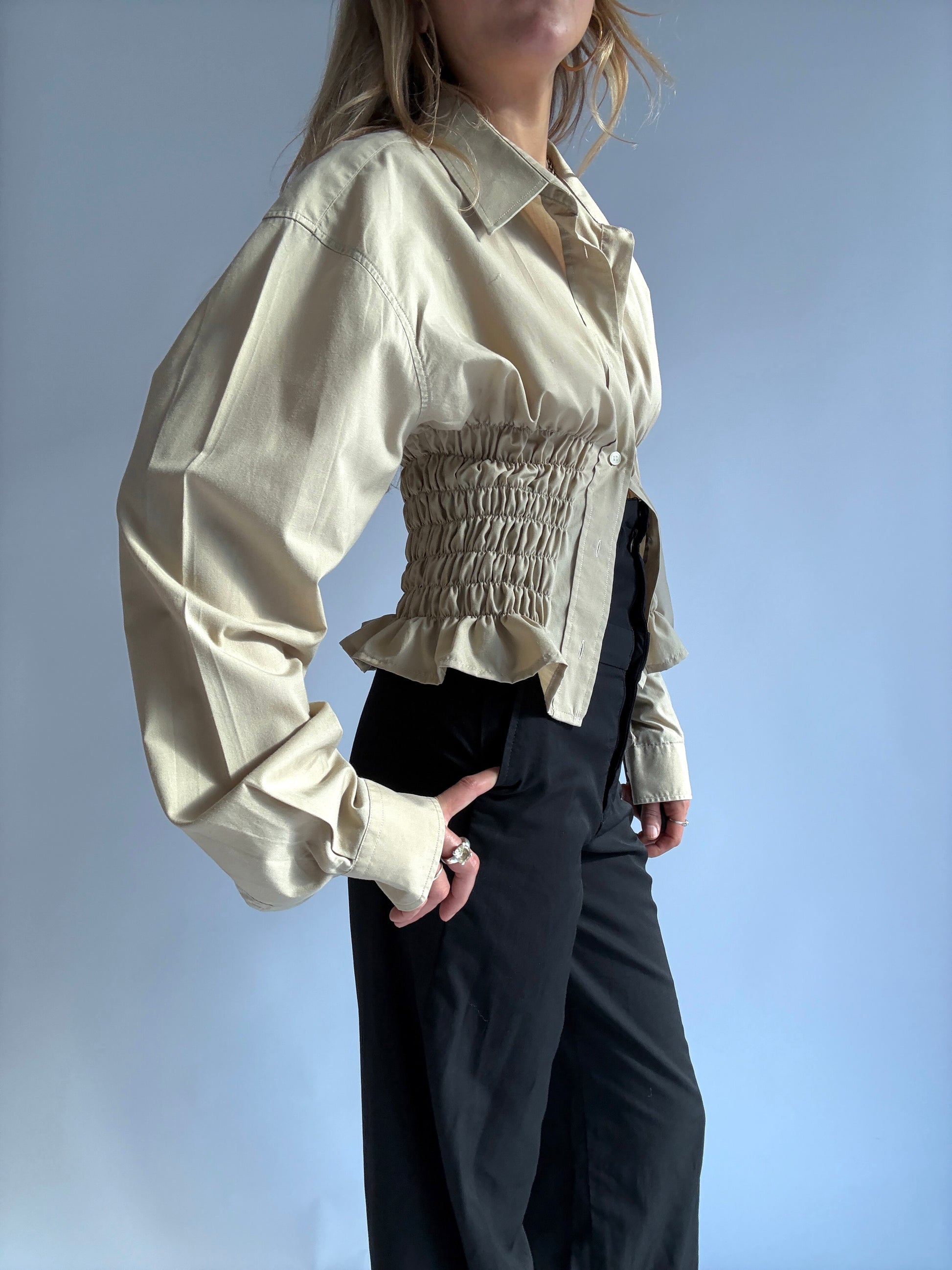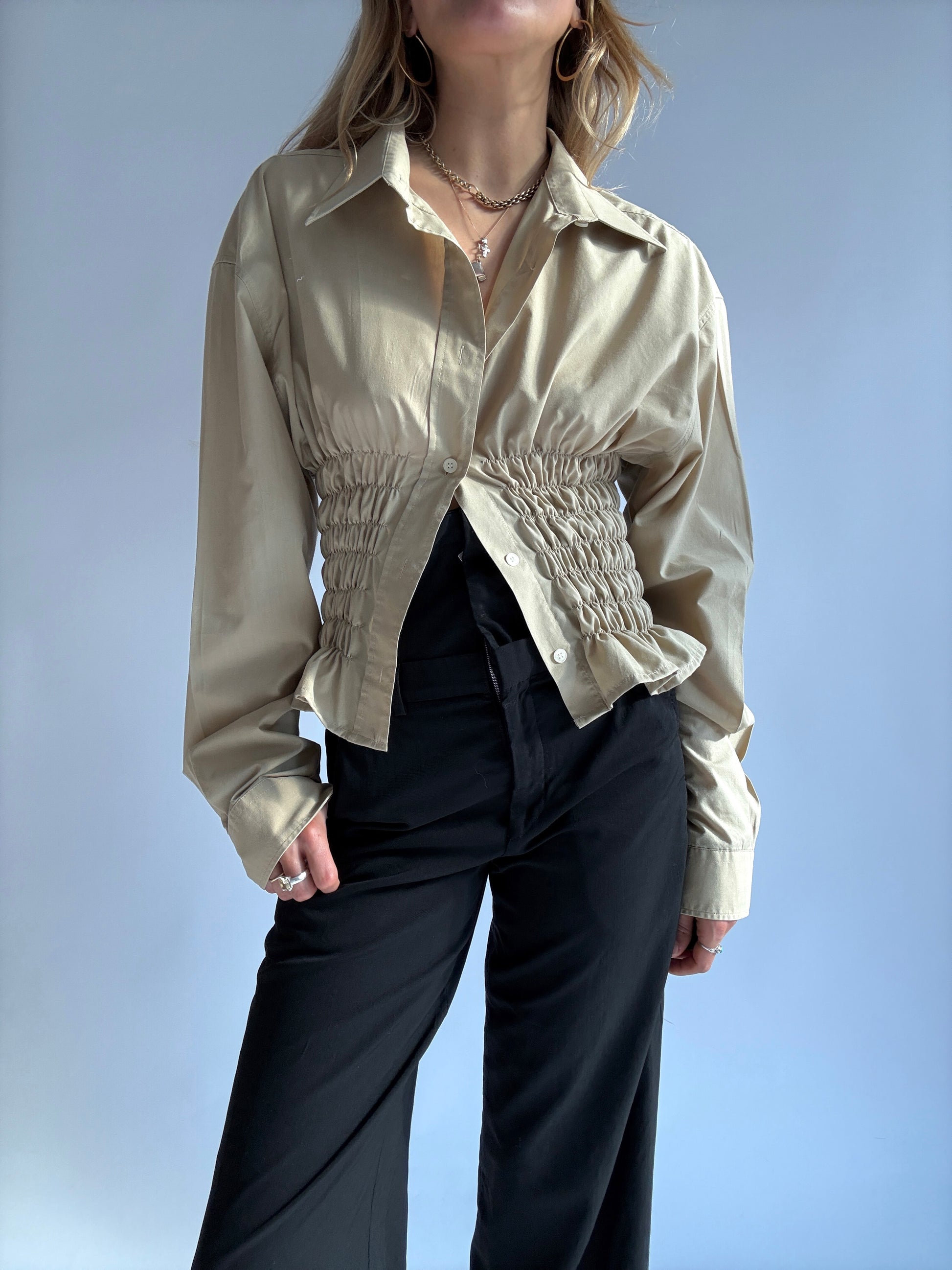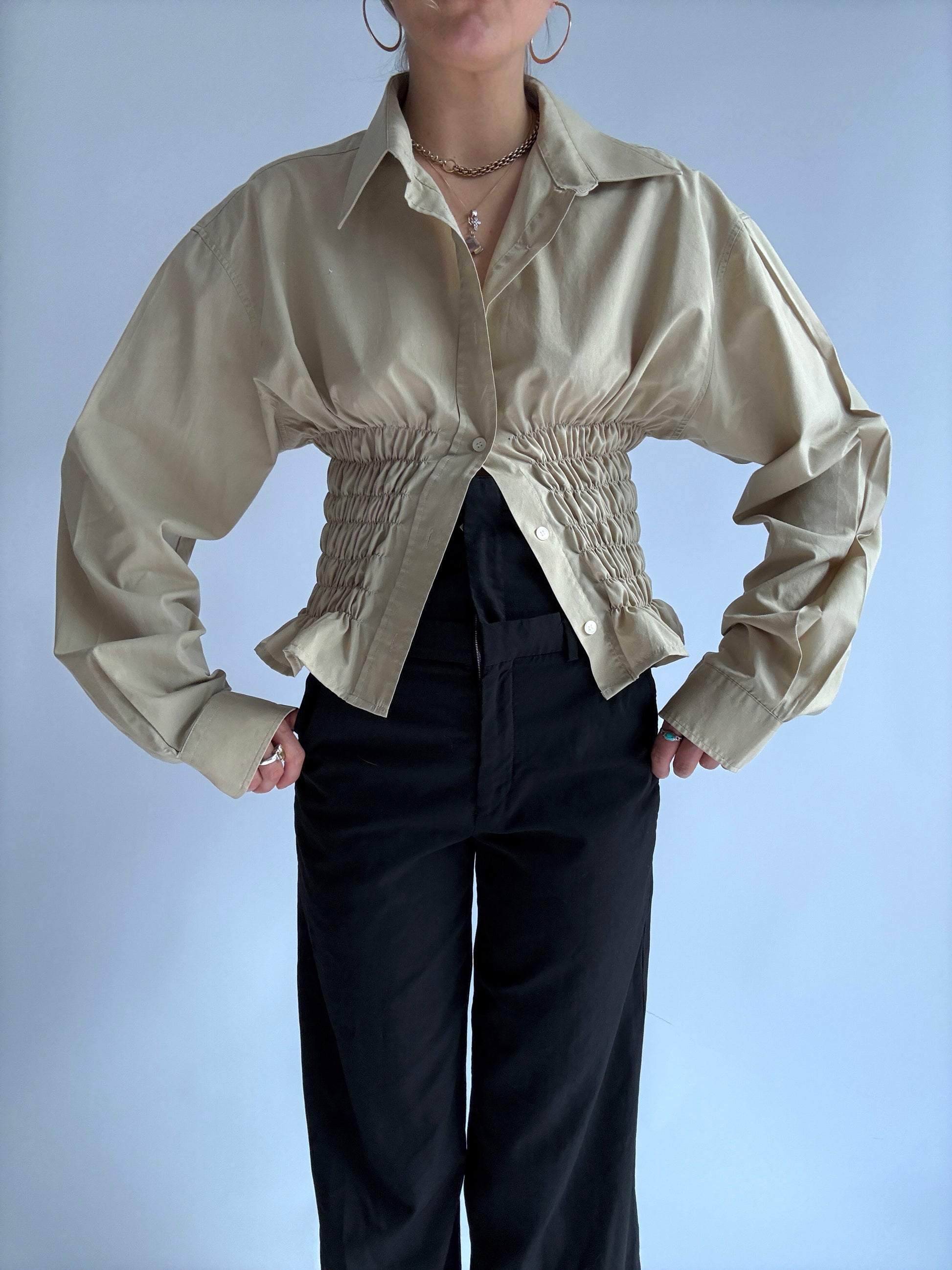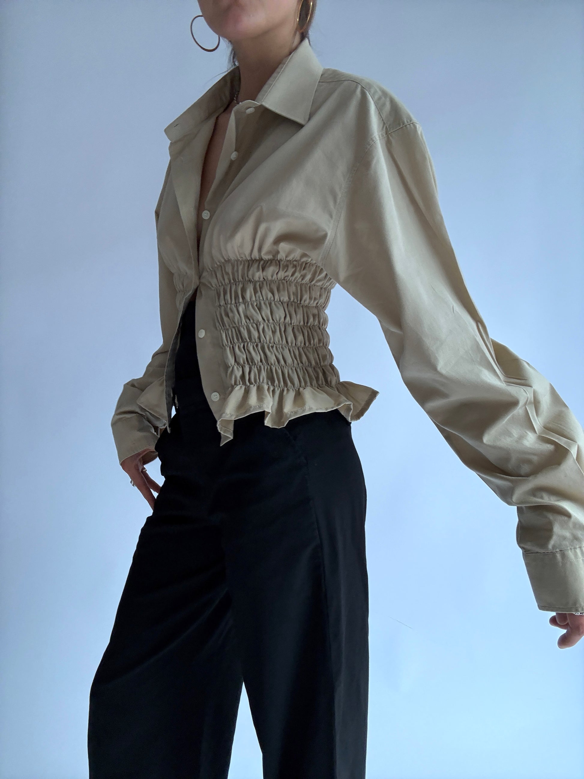 Chemise à fronces, upcyclée à partir d'une chemise oubliée de ton daron. Pièce unique à la taille élastique, qui épousera joliment tes formes de déesse.