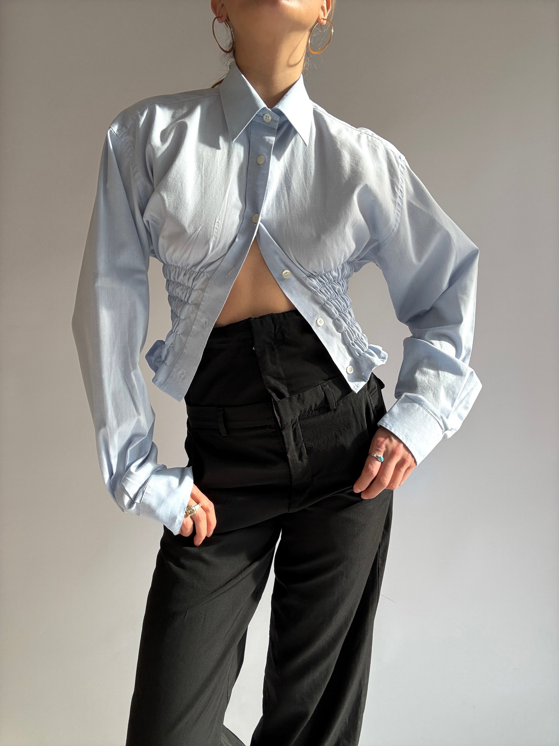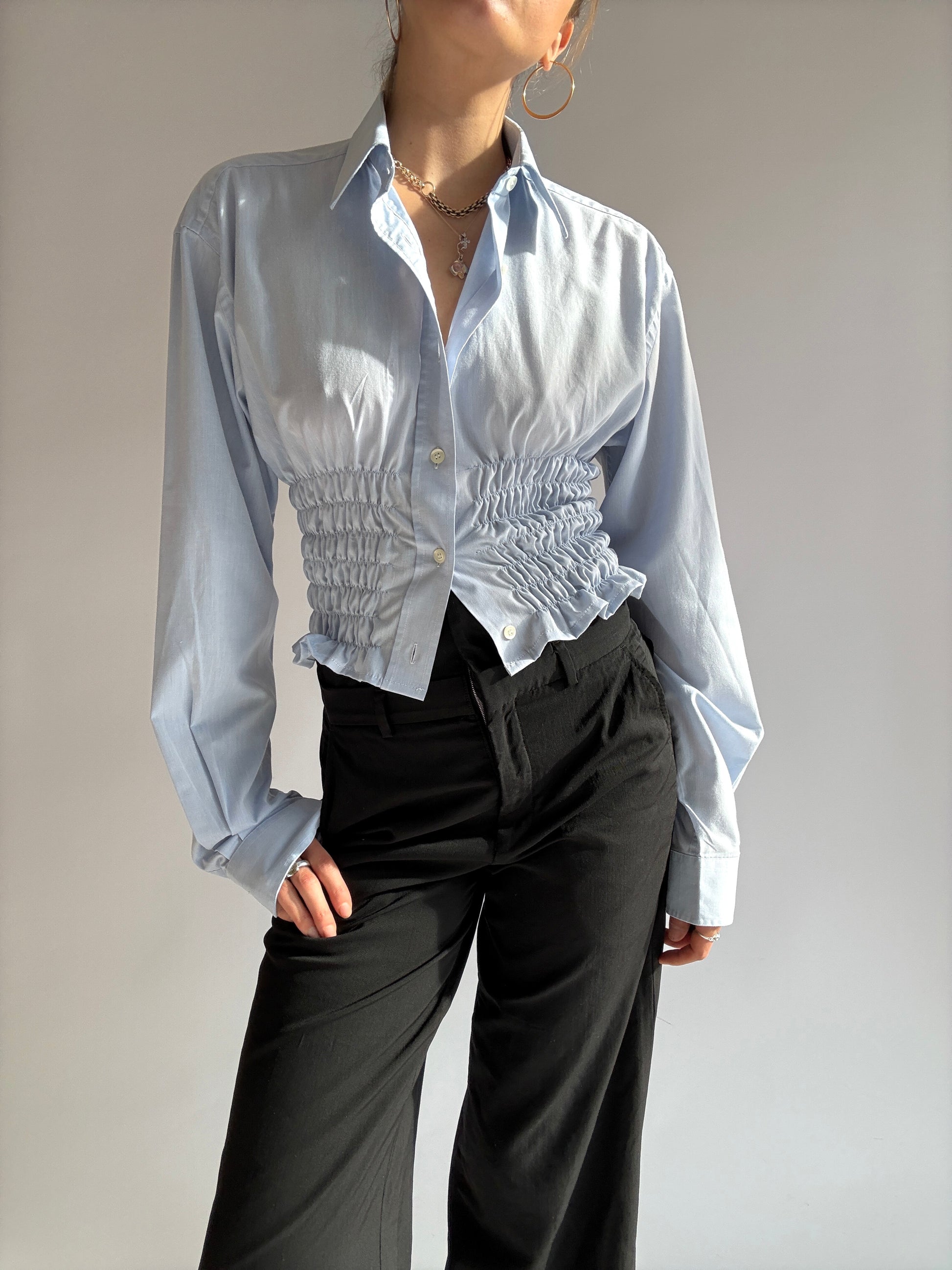 Chemise à fronces, upcyclée à partir d'une chemise oubliée de ton daron. Pièce unique à la taille élastique, qui épousera joliment tes formes de déesse.