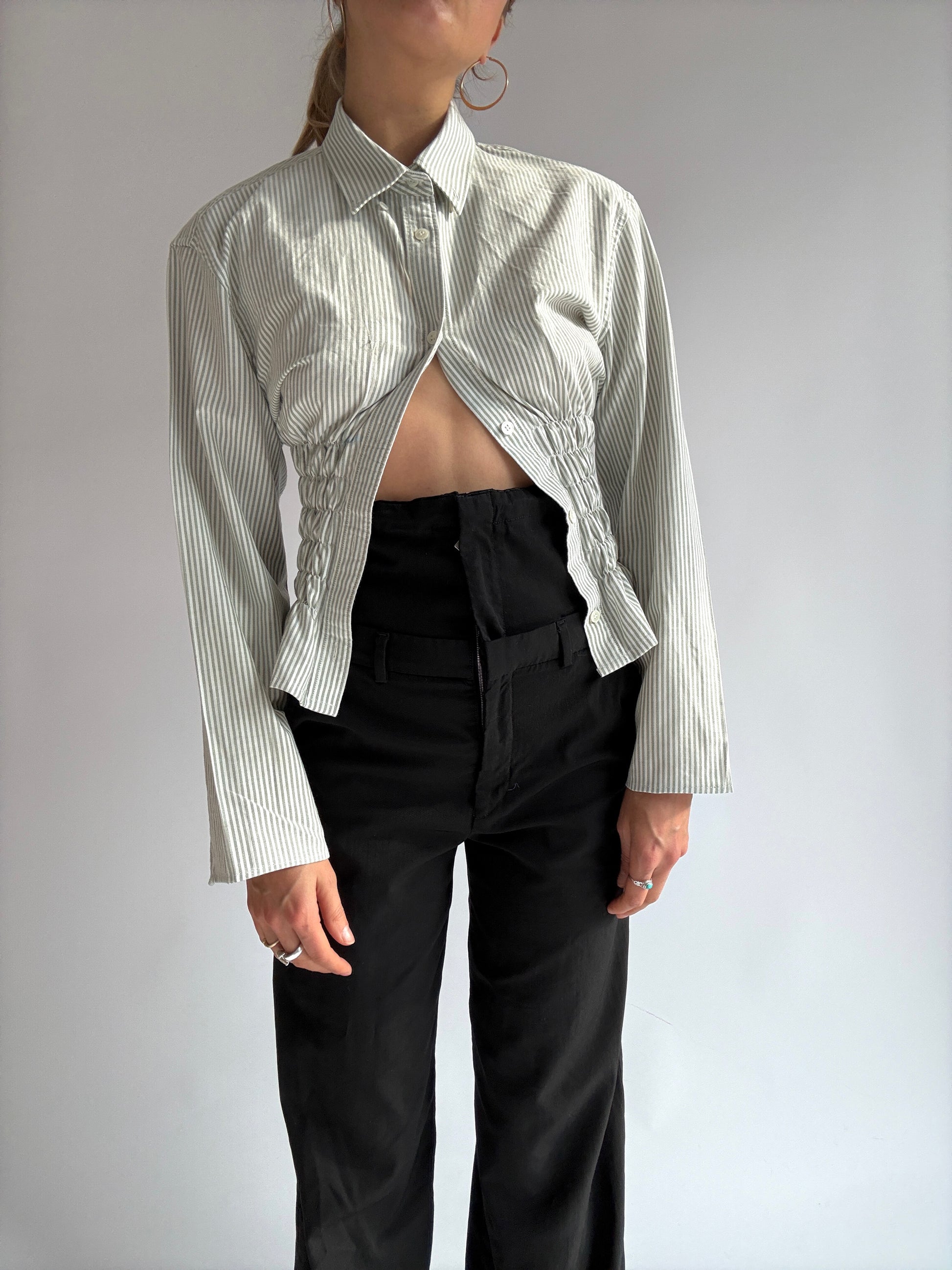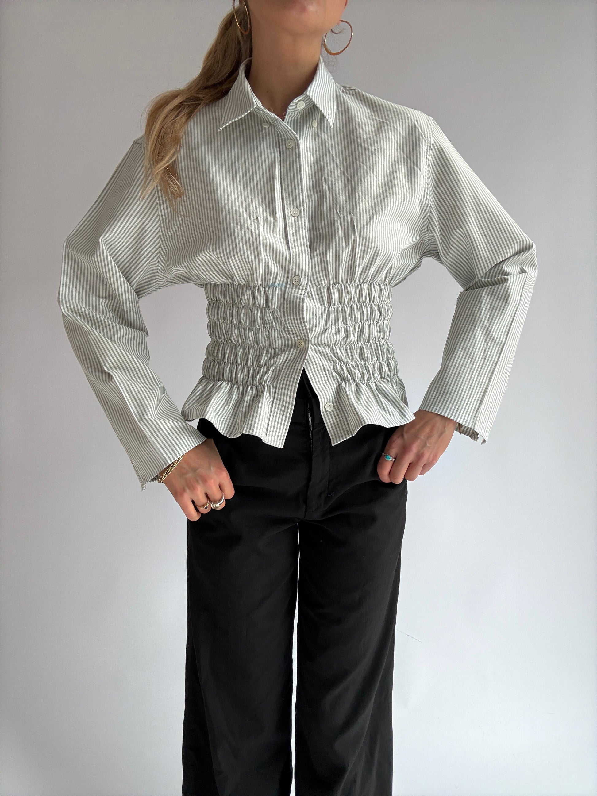 Chemise à fronces, upcyclée à partir d'une chemise oubliée de ton daron. Pièce unique à la taille élastique, qui épousera joliment tes formes de déesse.