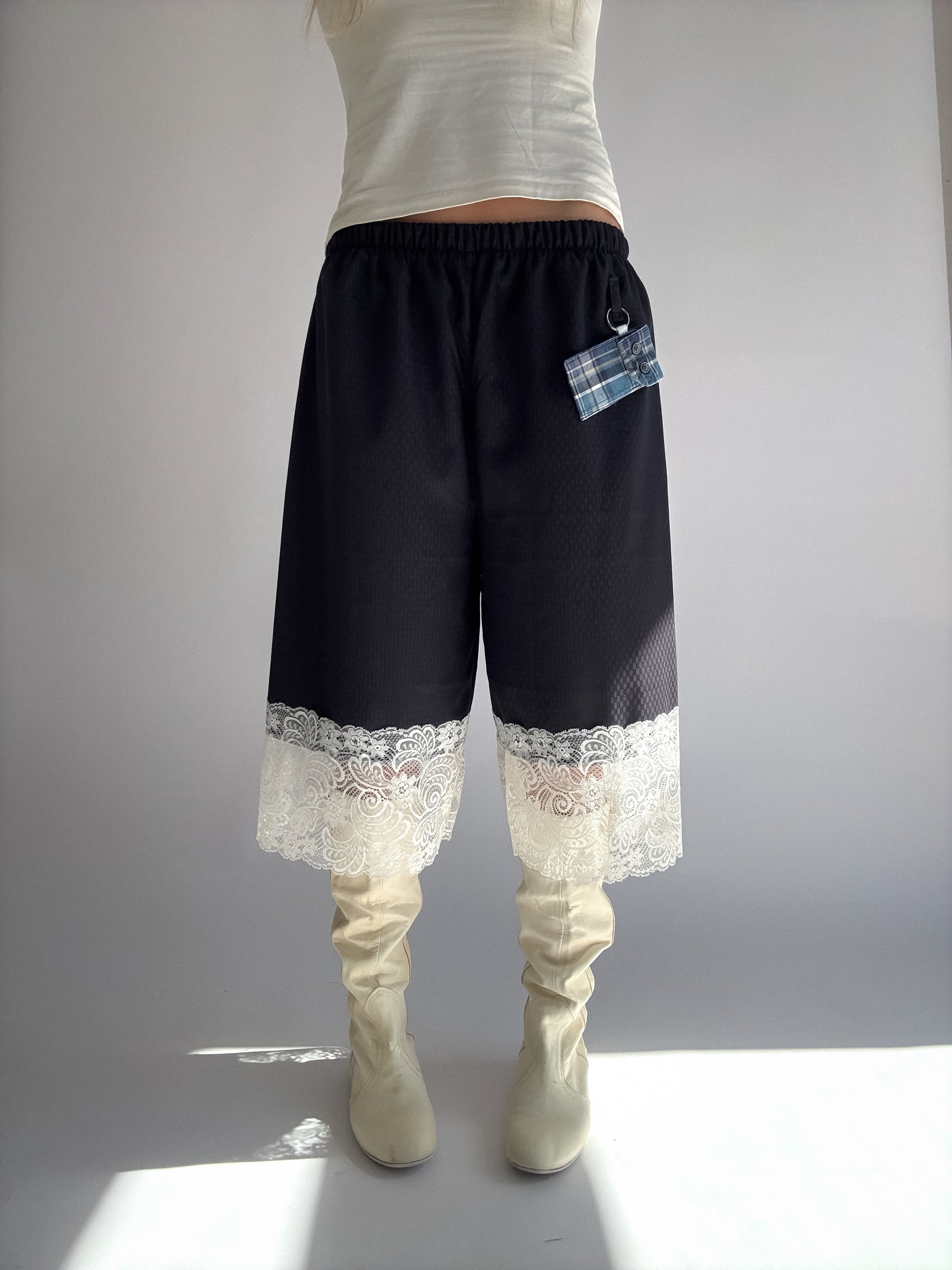 Basketball shorts bleu marine upcyclé, sublimé de dentelle de Calais, plus fine que les excuses de ton ex... Détail de zinzin : sa petite pochette porte-clé unique à chaque pièce, comme toi bébé.