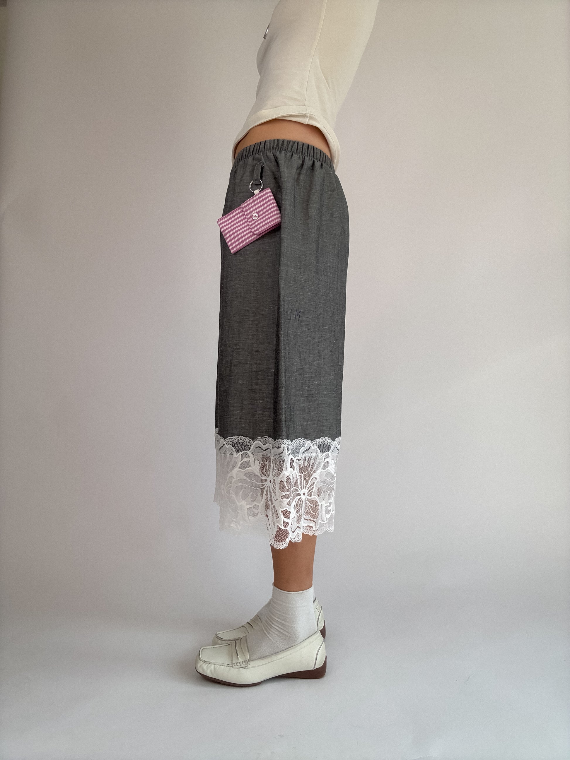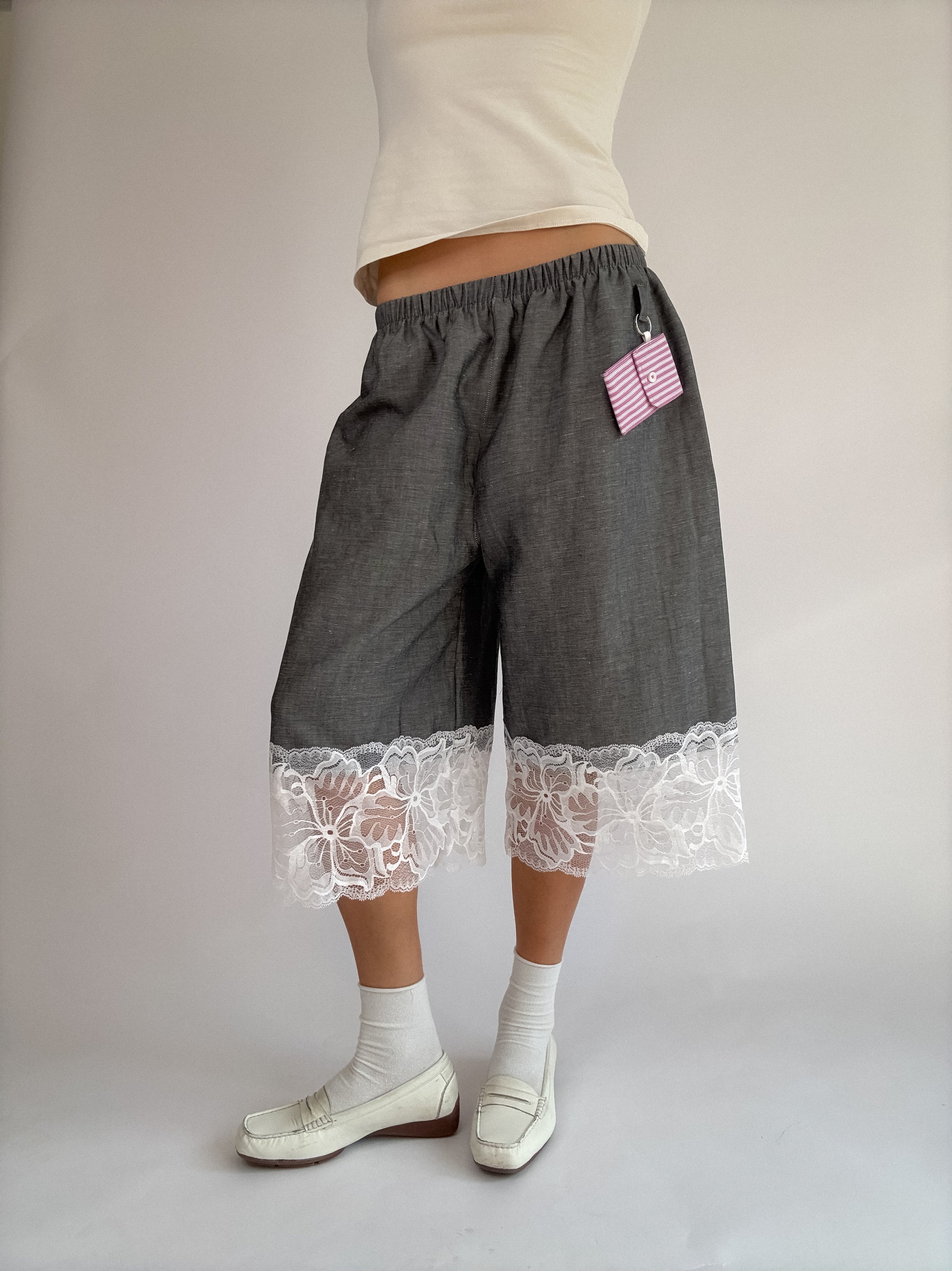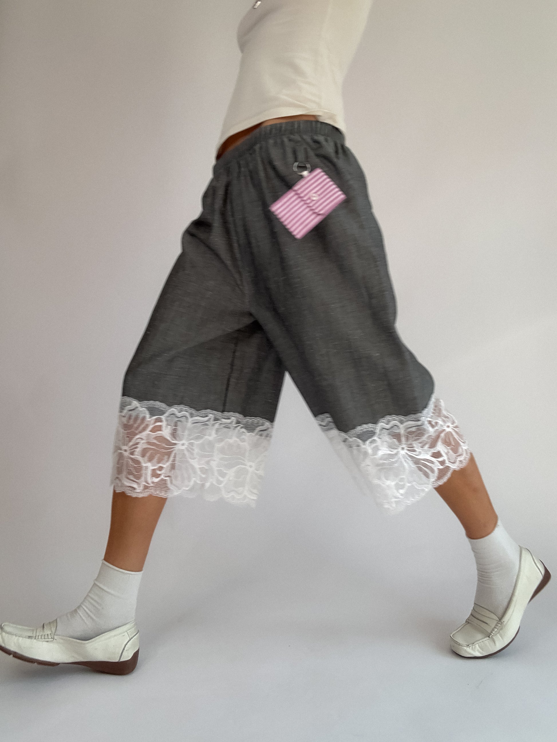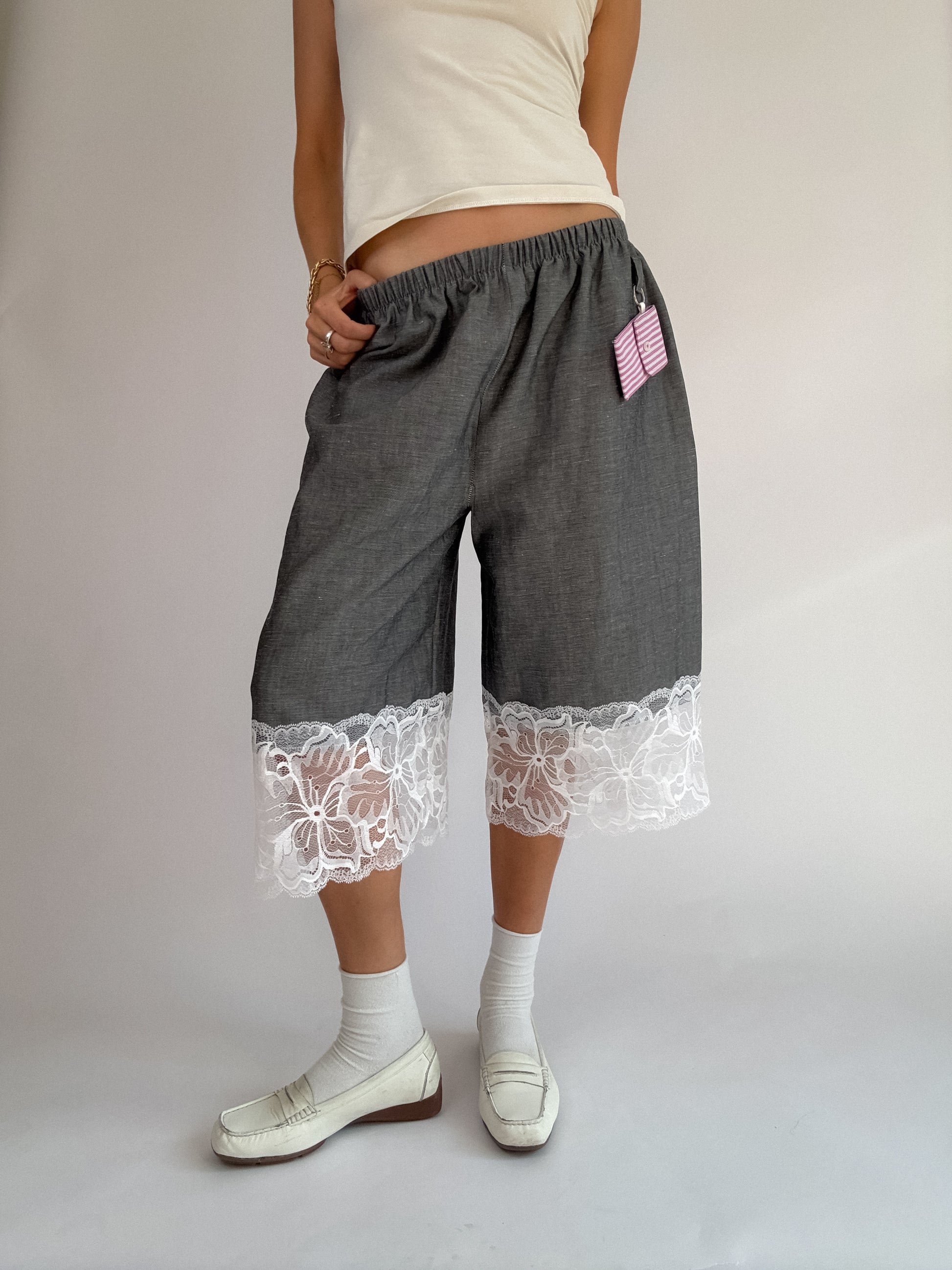 Basketball shorts gris upcyclé, sublimé de dentelle de Calais, plus fine que les excuses de ton ex... Détail de zinzin : sa petite pochette porte-clé unique à chaque pièce, comme toi bébé.