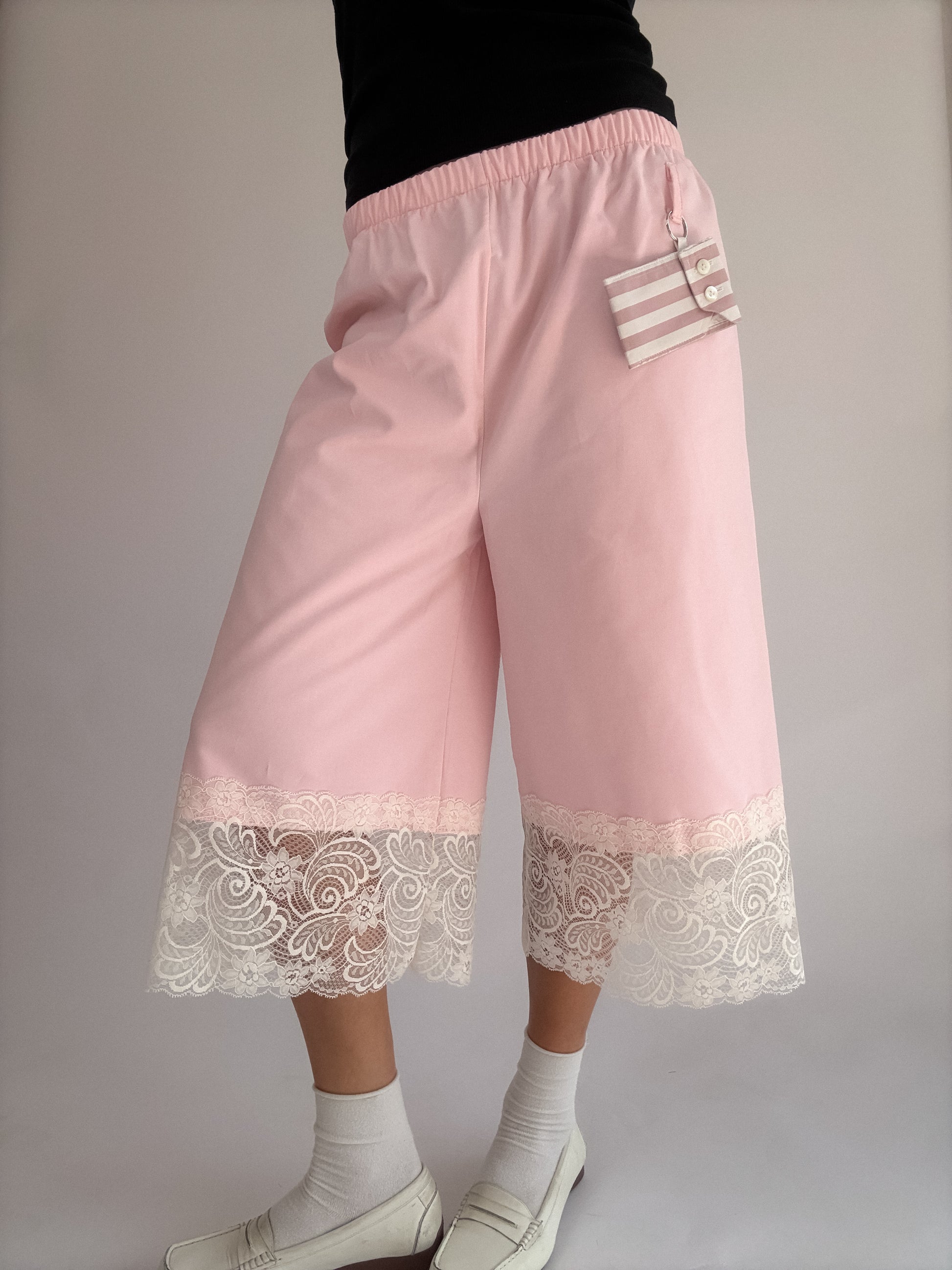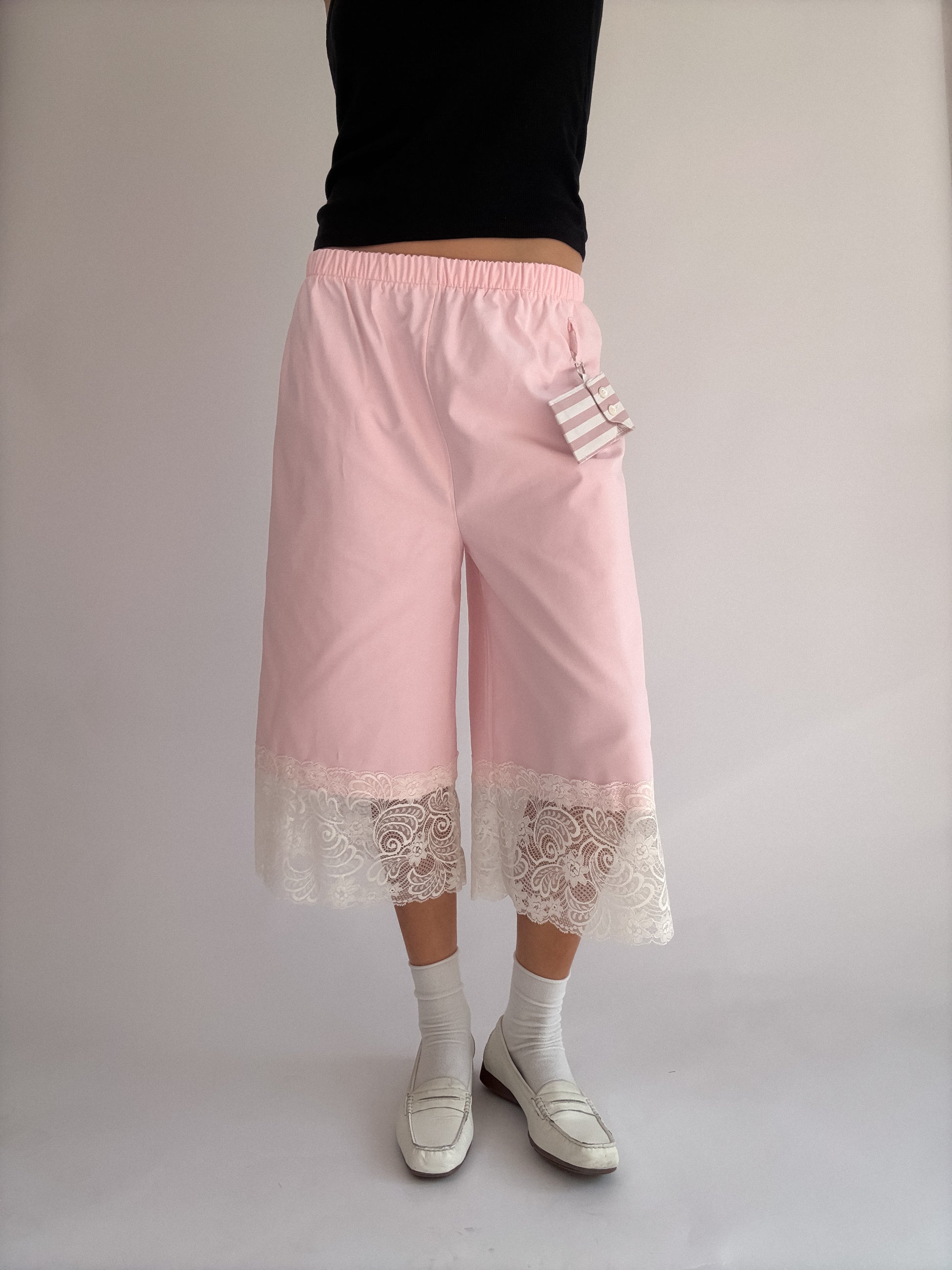 Basketball shorts baby pink upcyclé, sublimé de dentelle de Calais, plus fine que les excuses de ton ex... Détail de zinzin : sa petite pochette porte-clé unique à chaque pièce, comme toi bébé.