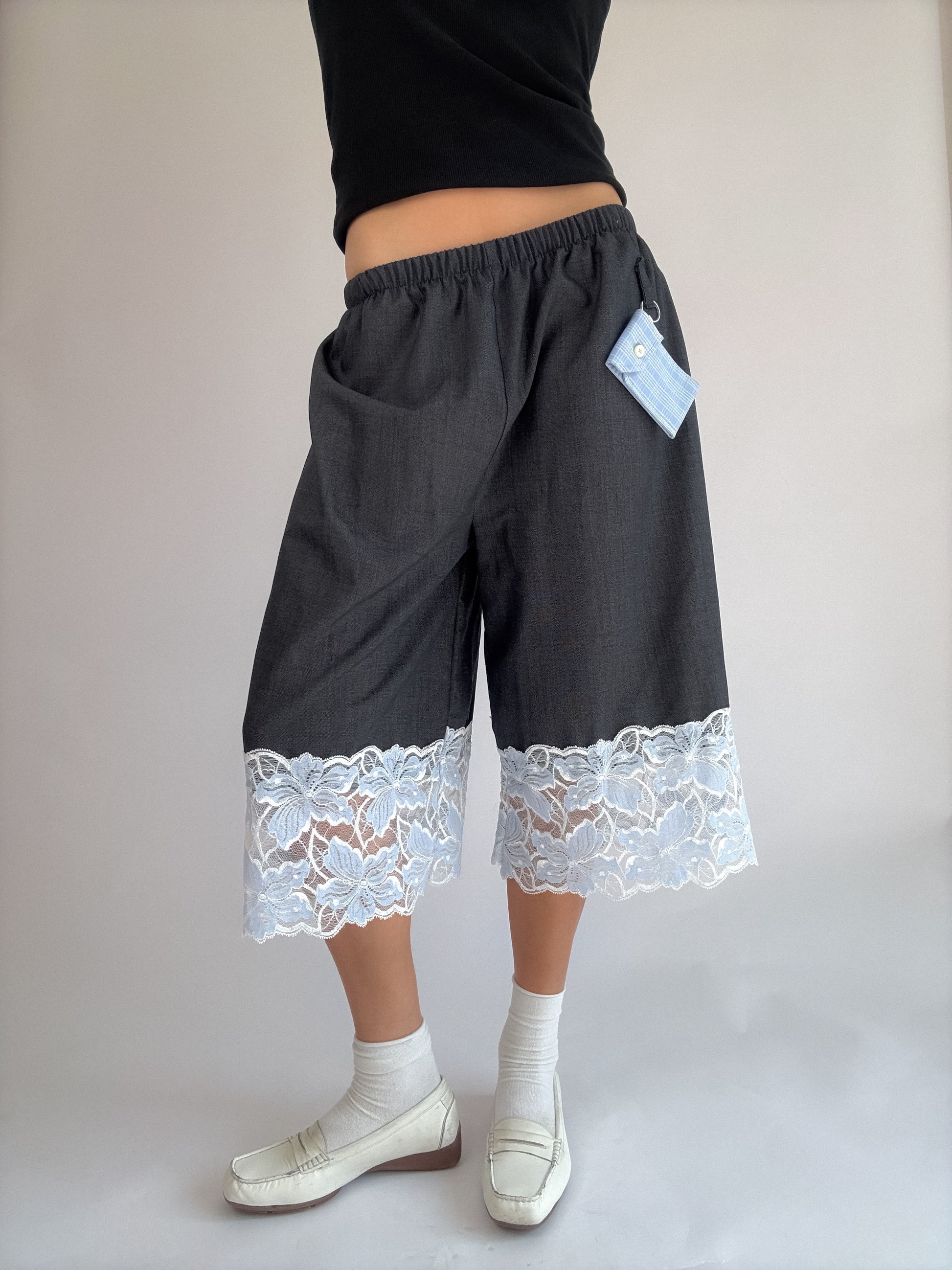 Basketball shorts bleu-gris upcyclé, sublimé de dentelle de Calais, plus fine que les excuses de ton ex... Détail de zinzin : sa petite pochette porte-clé unique à chaque pièce, comme toi bébé.
