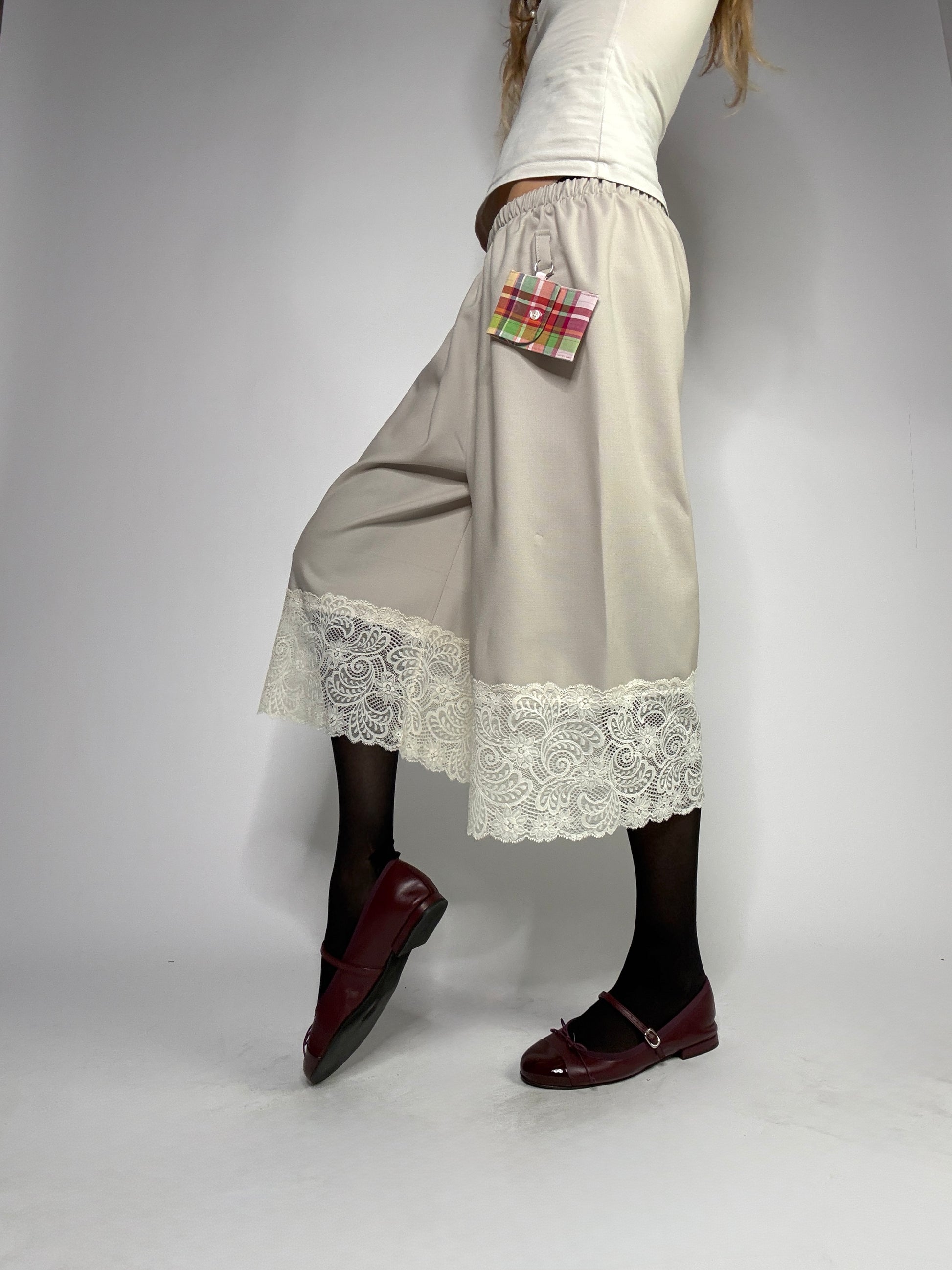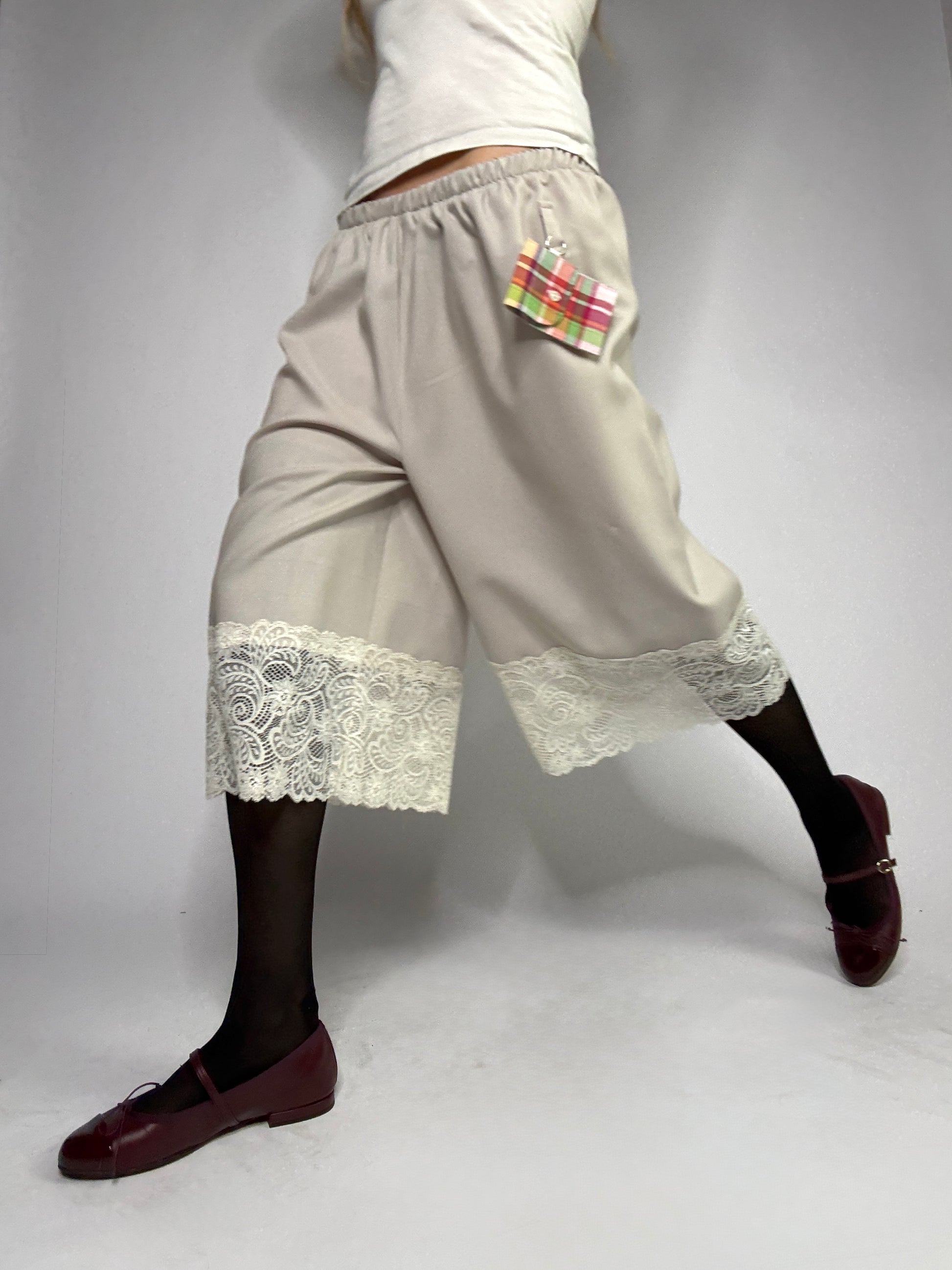 Basketball shorts upcyclé, sublimé de dentelle de Calais, plus fine que les excuses de ton ex... Détail de zinzin : sa petite pochette porte-clé unique à chaque pièce, comme toi bébé.