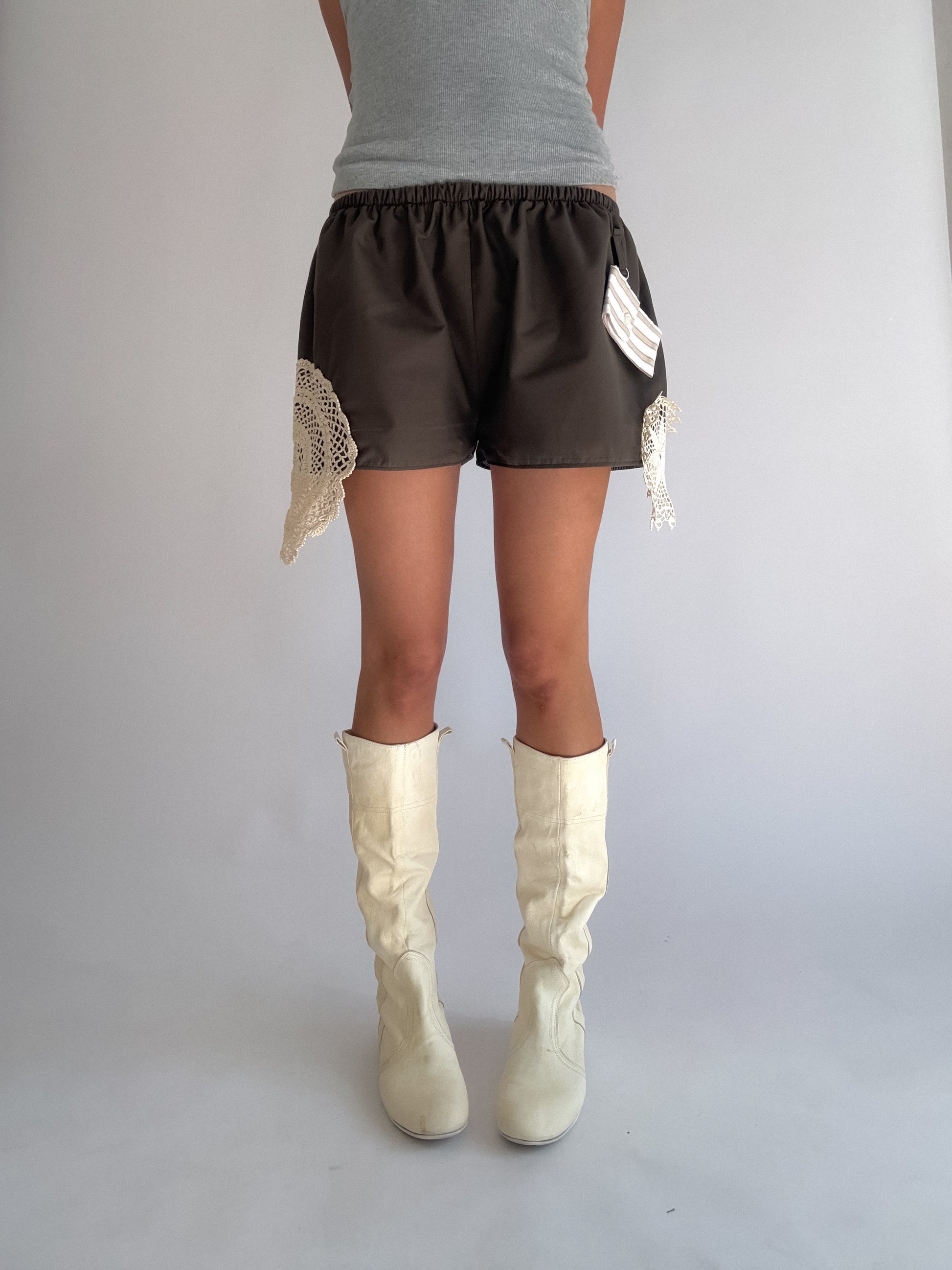 Mini short marron upcyclé, sublimé de napperons si délicats qu'ils feraient verser une larmichette à ta grand-mère... Détail de zinzin : sa petite pochette porte-clé unique à chaque pièce, comme toi bébé.