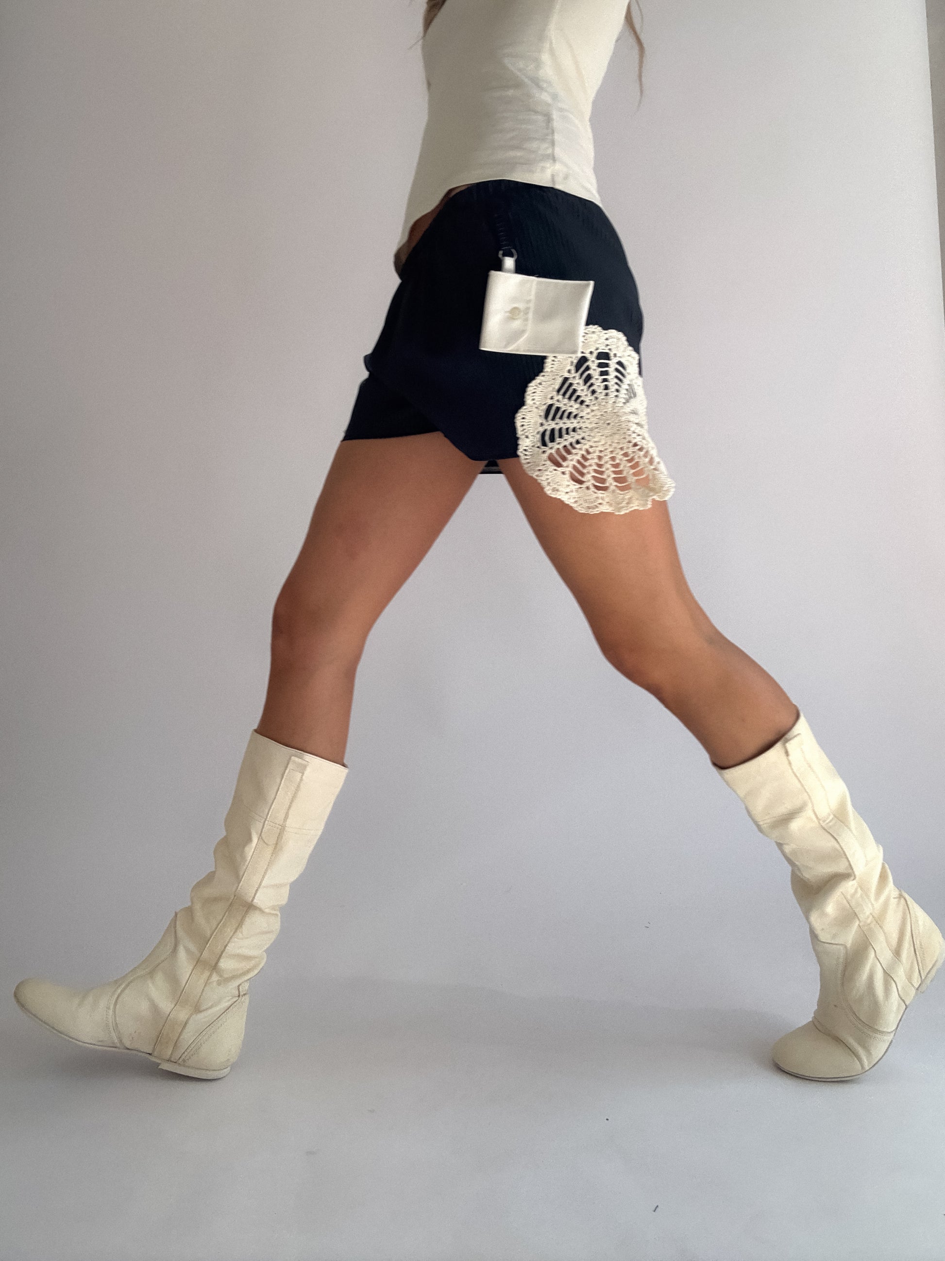 Mini short marine à fines rayures upcyclé, sublimé de napperons si délicats qu'ils feraient verser une larmichette à ta grand-mère... Détail de zinzin : sa petite pochette porte-clé unique à chaque pièce, comme toi bébé.
