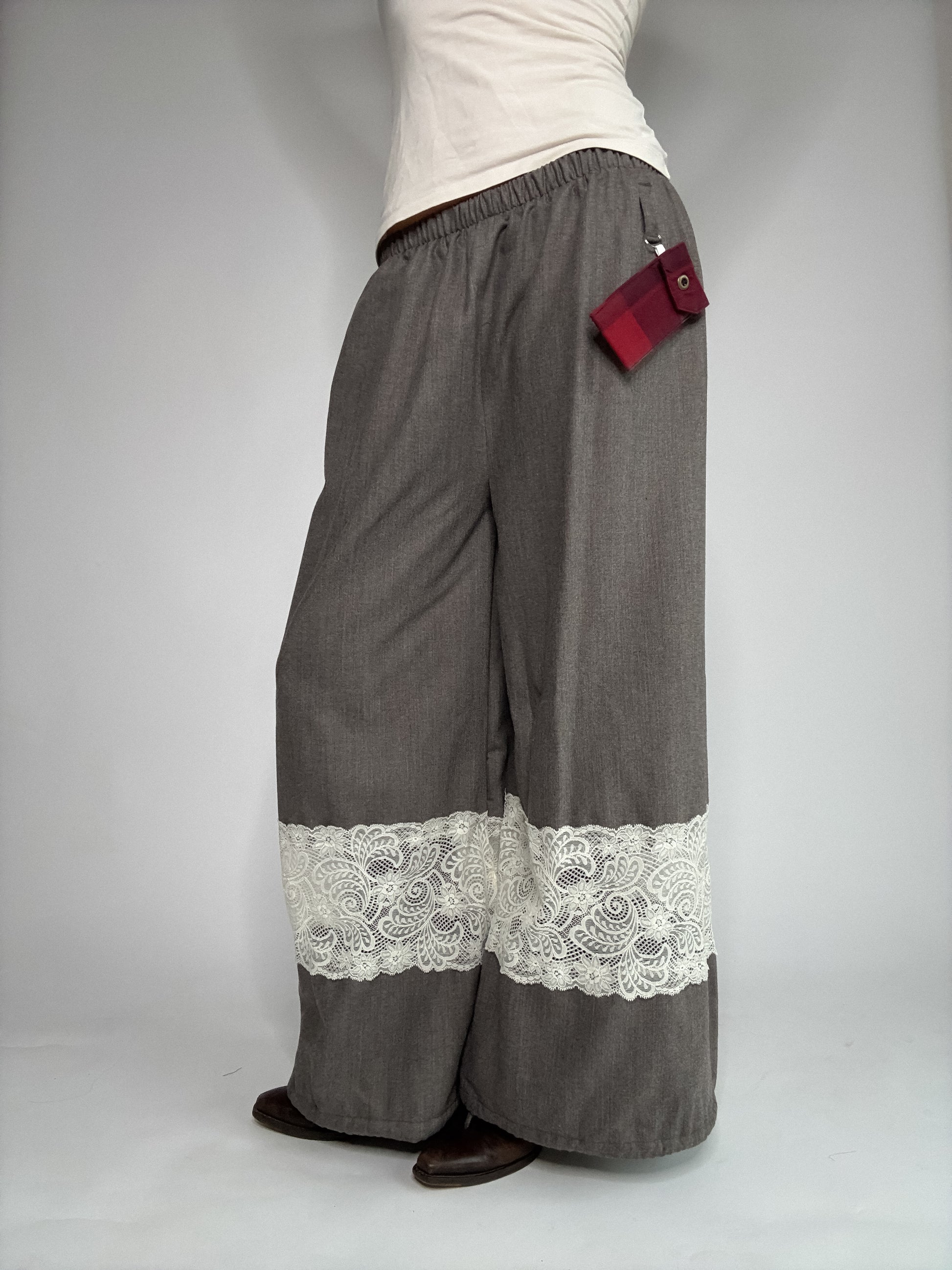 Pantalon upcyclé, confectionné à partir de stocks dormants de maisons de luxe. Et sublimé de dentelle de Calais, plus fine que les excuses de ton ex... Pantalon boule ou evasé ? vous choisissez. Détail de zinzin: sa petite pochette porte-clé, unique à chaque pièce, pour y glisser tes petits secrets.