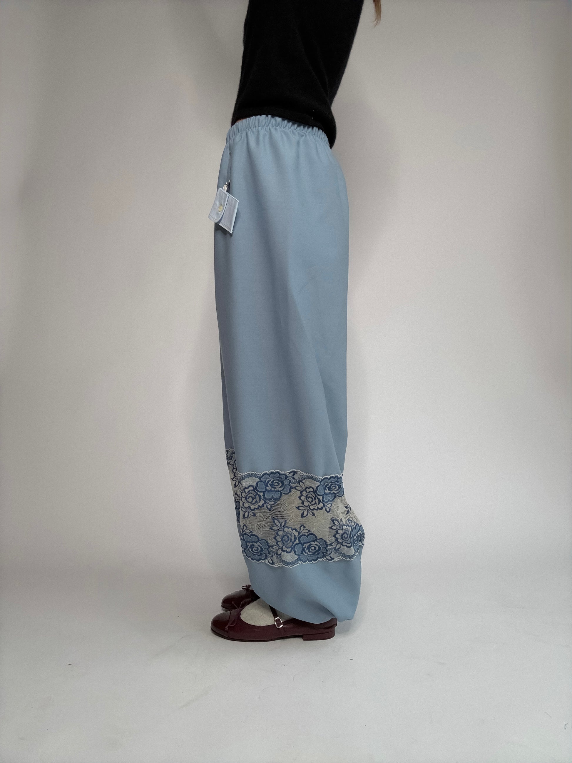 Pantalon upcyclé, sublimé de dentelle de Calais, plus fine que les excuses de ton ex... Pantalon boule ou evasé ? vous choisissez. Détail mimi : sa petite pochette porte-clé, unique à chaque pièce, pour y glisser tes petits secrets.