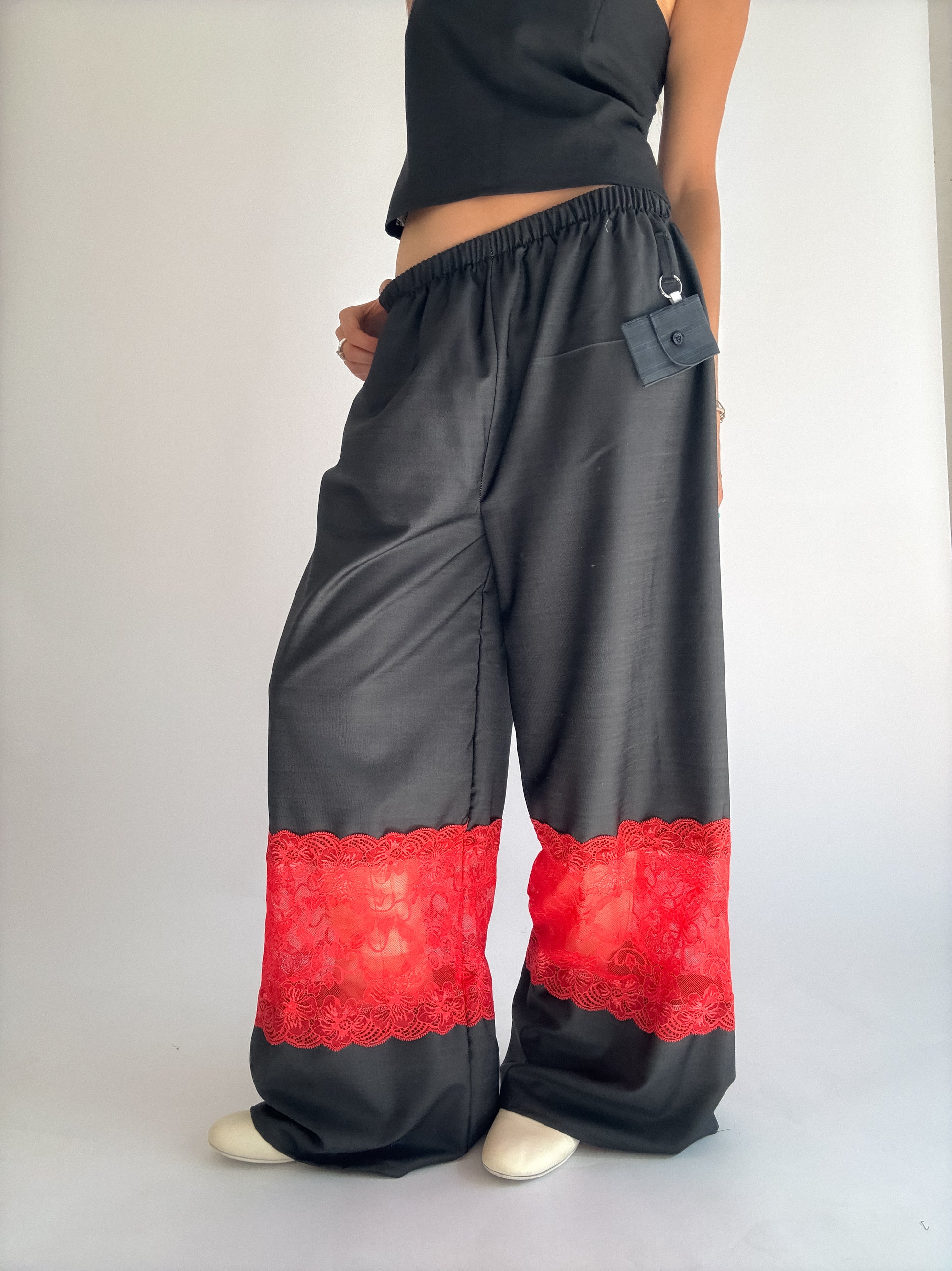 Pantalon upcyclé, sublimé de dentelle de Calais si délicate qu'elle ferait verser une larmichette à ta grand-mère... Détail de zinzin: sa petite pochette porte-clé, unique à chaque pièce, pour y glisser tes petits secrets.