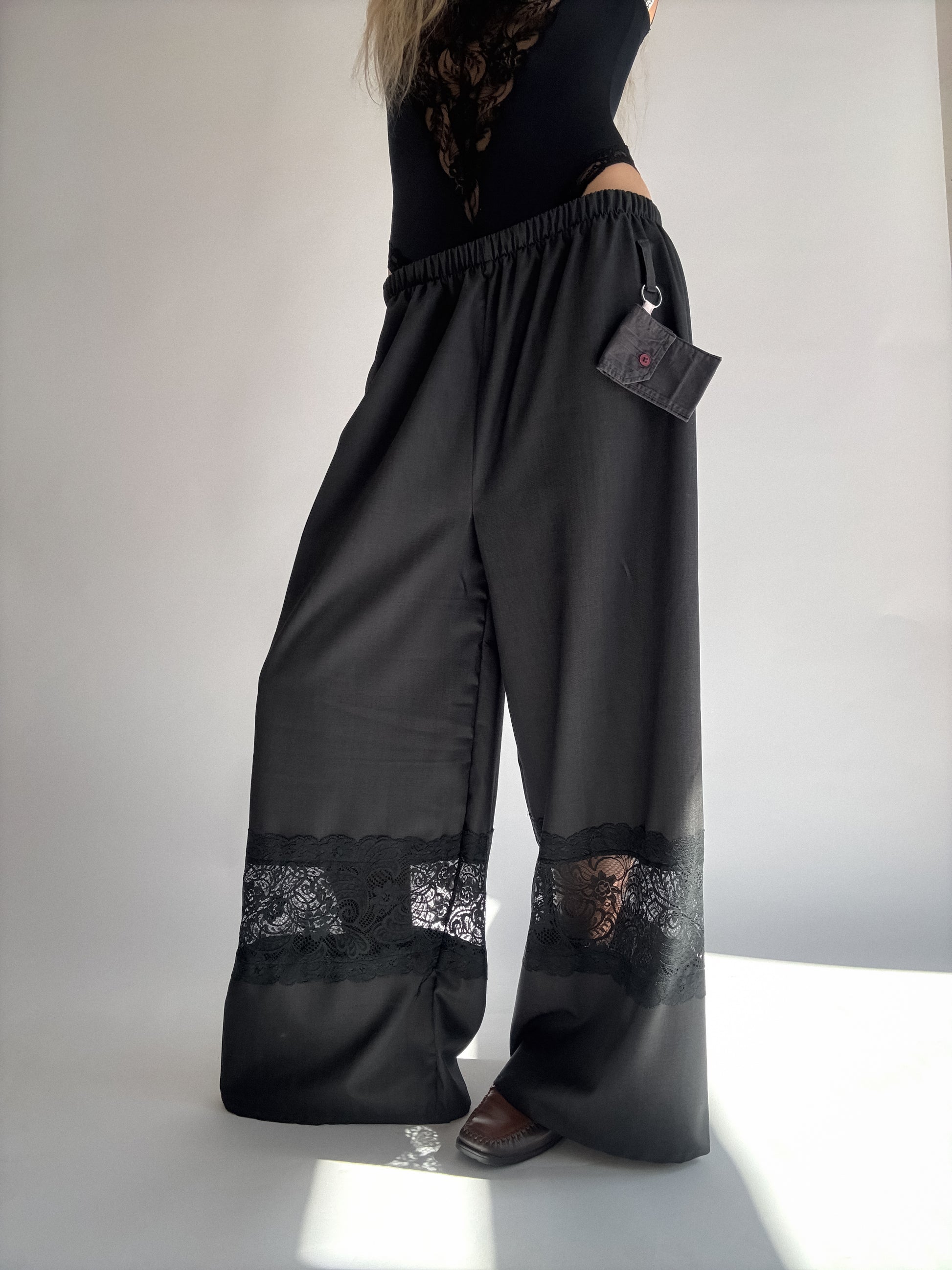 Pantalon upcyclé, sublimé de dentelle de Calais si délicate qu'elle ferait verser une larmichette à ta grand-mère... Détail de zinzin: sa petite pochette porte-clé, unique à chaque pièce, pour y glisser tes petits secrets.