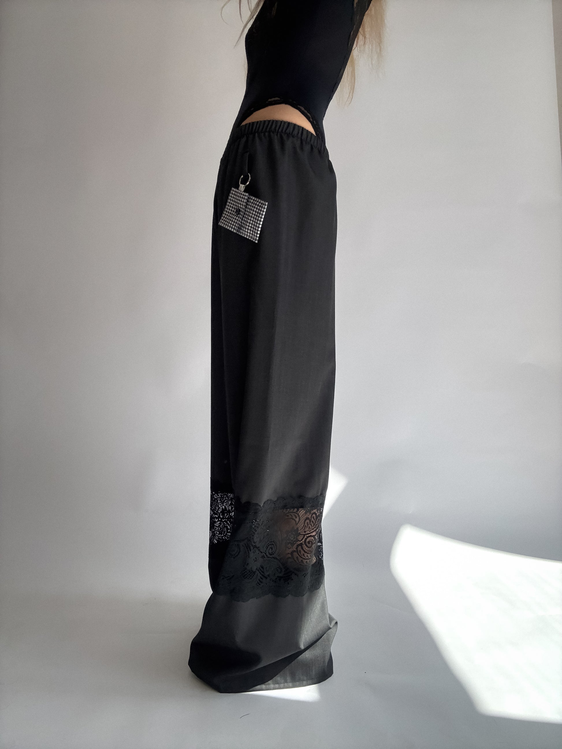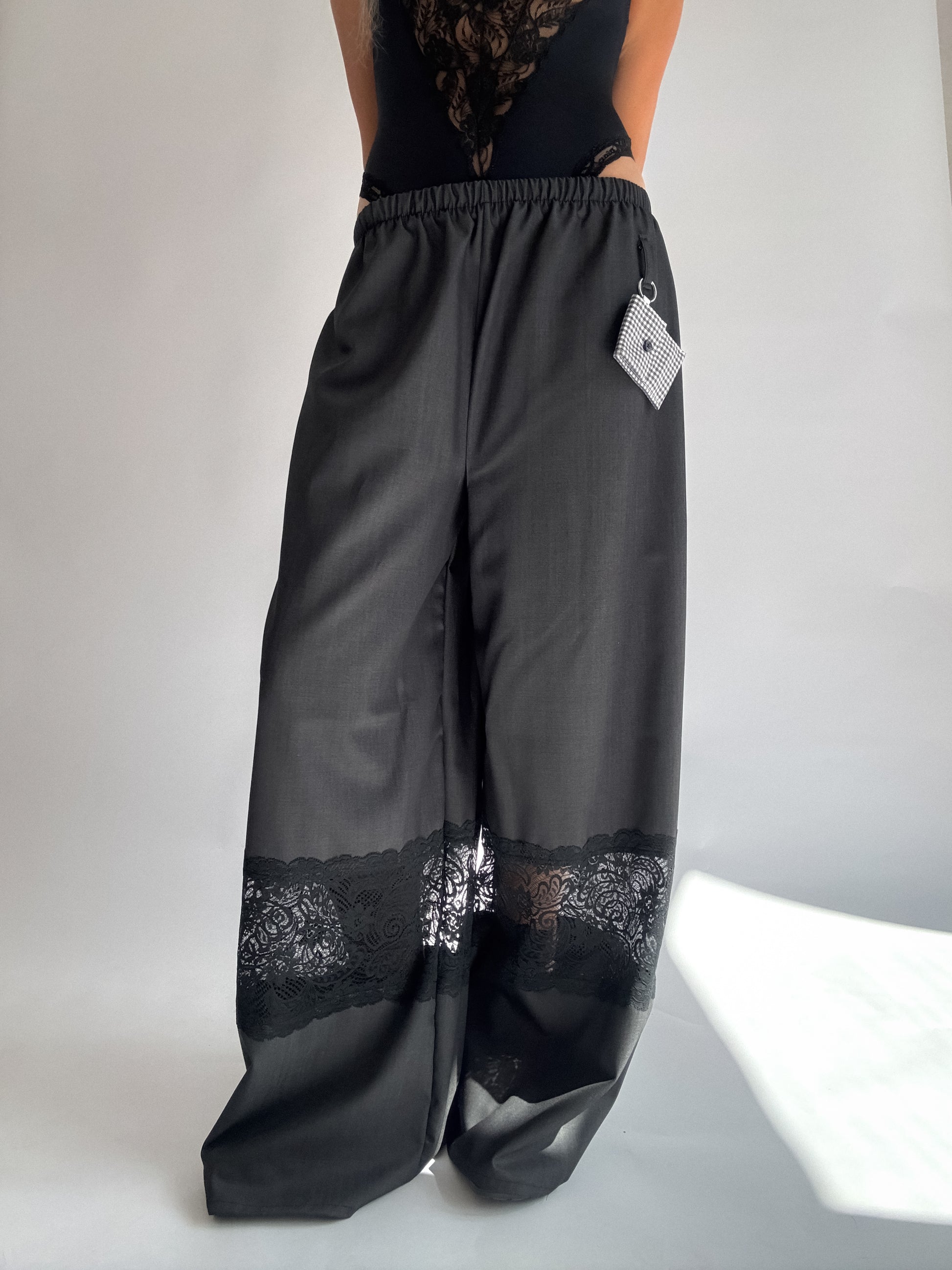 Pantalon upcyclé, sublimé de dentelle de Calais si délicate qu'elle ferait verser une larmichette à ta grand-mère... Détail de zinzin: sa petite pochette porte-clé, unique à chaque pièce, pour y glisser tes petits secrets.