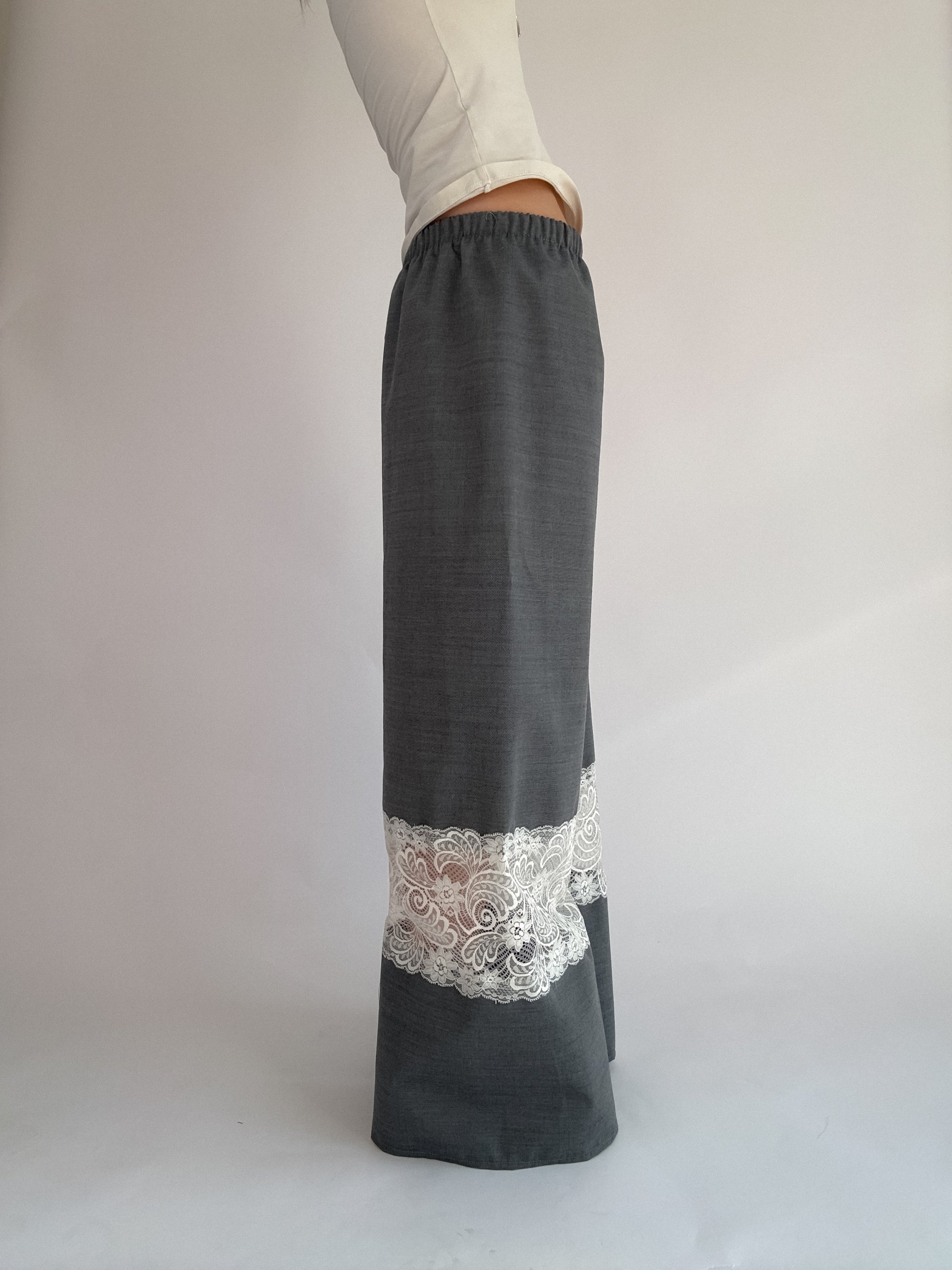 Pantalon upcyclé, sublimé de dentelle de Calais si délicate qu'elle ferait verser une larmichette à ta grand-mère... Détail de zinzin: sa petite pochette porte-clé, unique à chaque pièce, pour y glisser tes petits secrets.