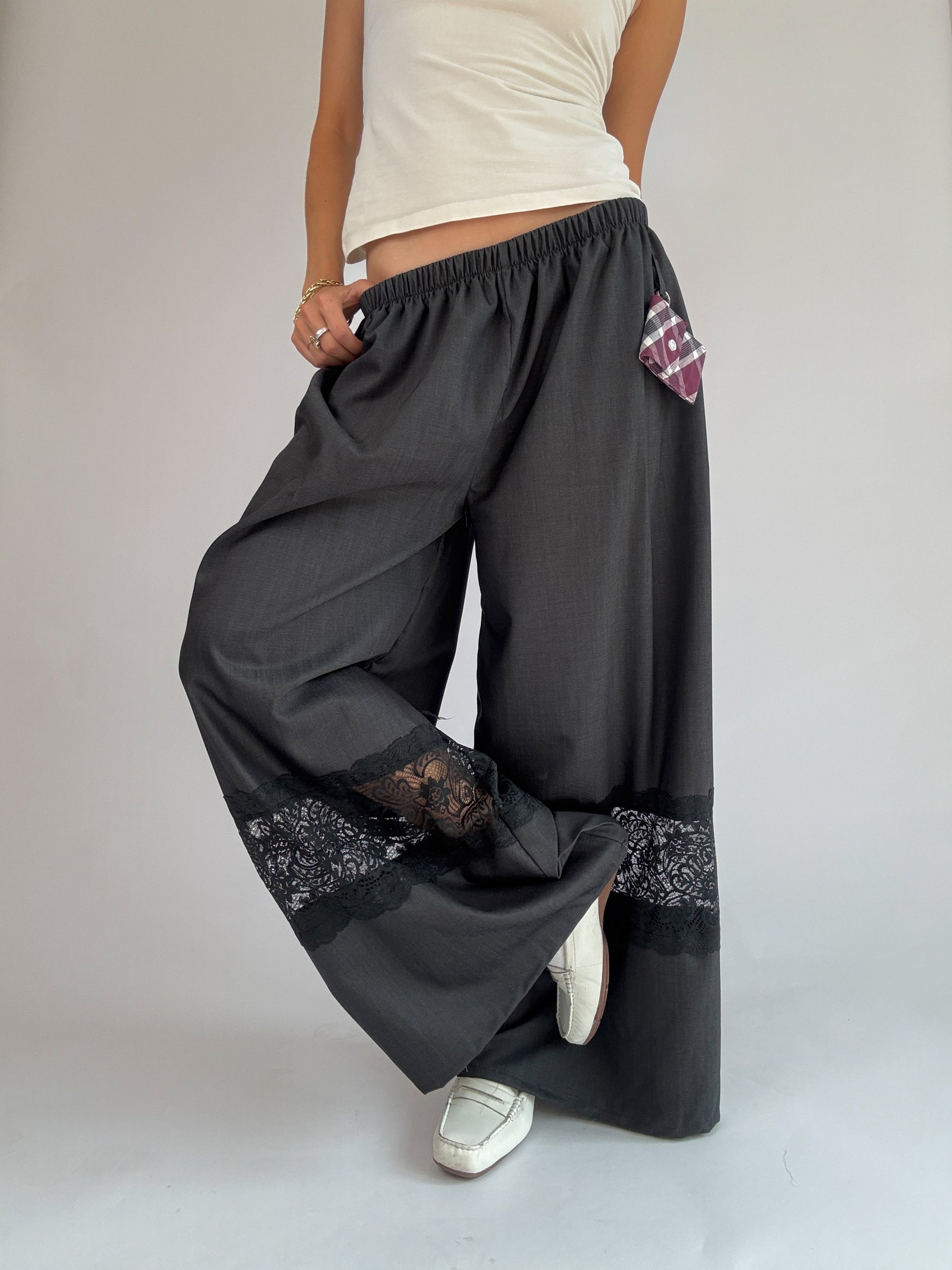 Pantalon upcyclé, sublimé de dentelle de Calais si délicate qu'elle ferait verser une larmichette à ta grand-mère... Détail de zinzin: sa petite pochette porte-clé, unique à chaque pièce, pour y glisser tes petits secrets.