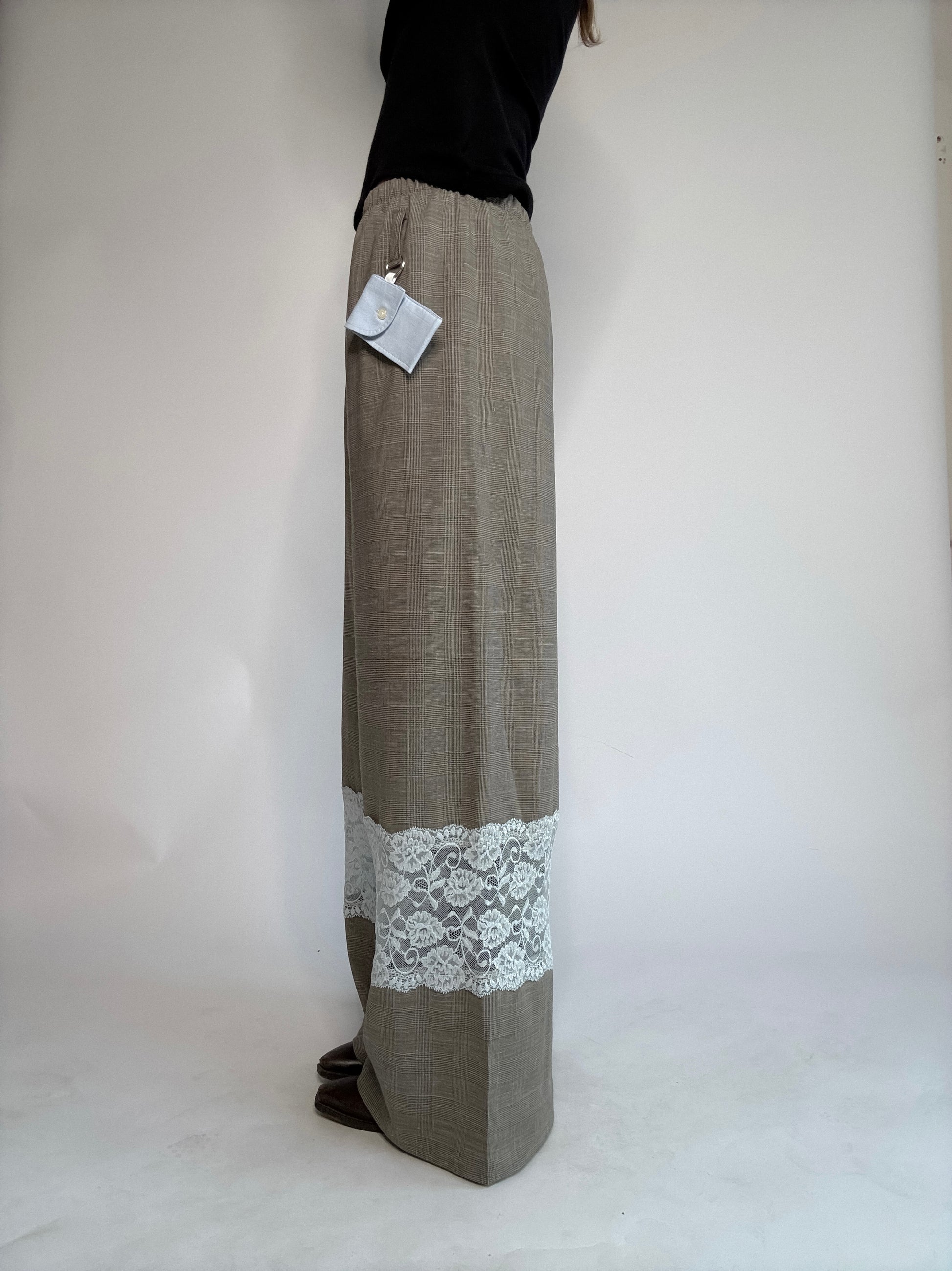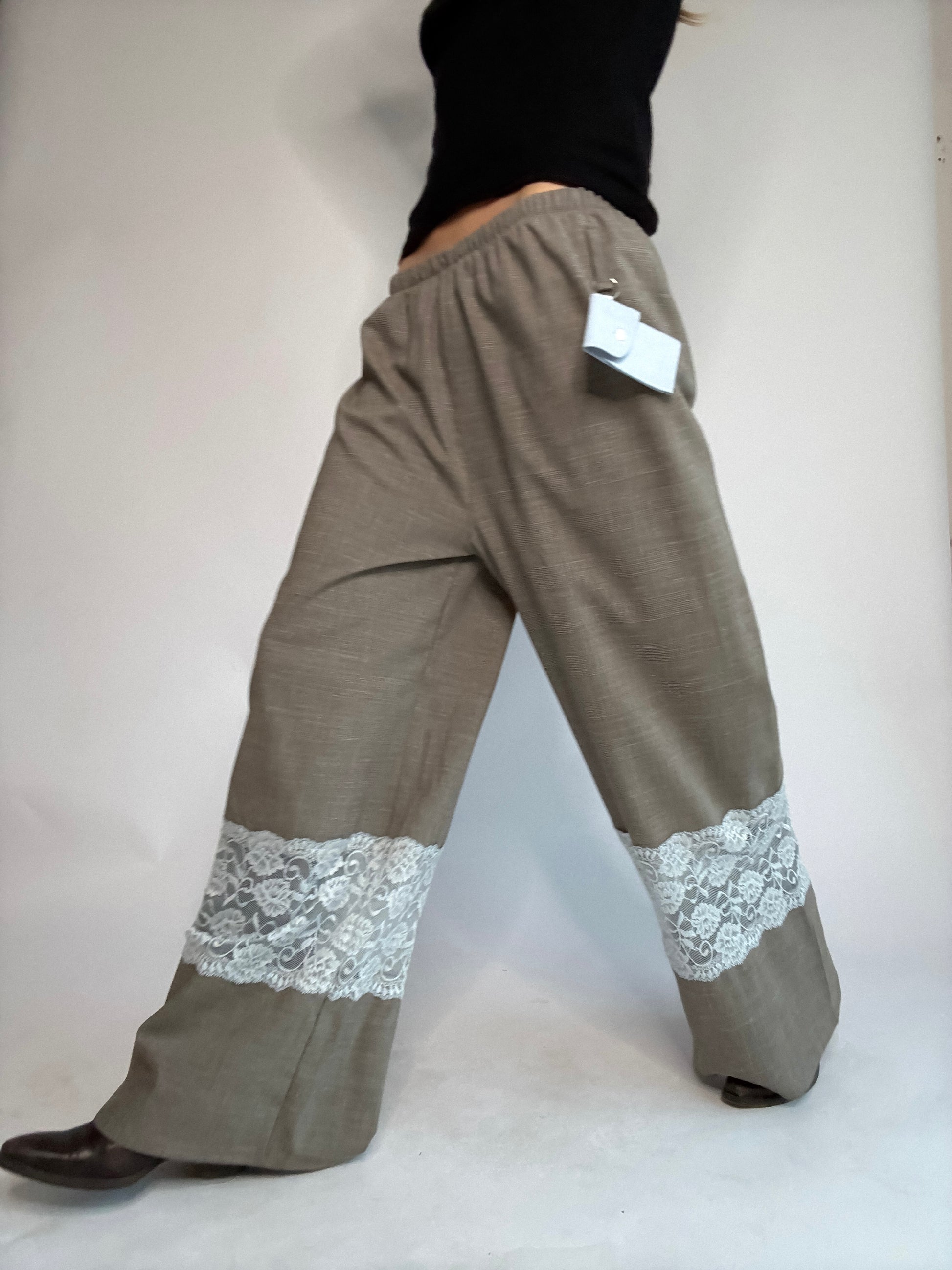 Pantalon upcyclé, sublimé de dentelle de Calais, plus fine que les excuses de ton ex... Détail de zinzin: sa petite pochette porte-clé, unique à chaque pièce, pour y glisser tes petits secrets.