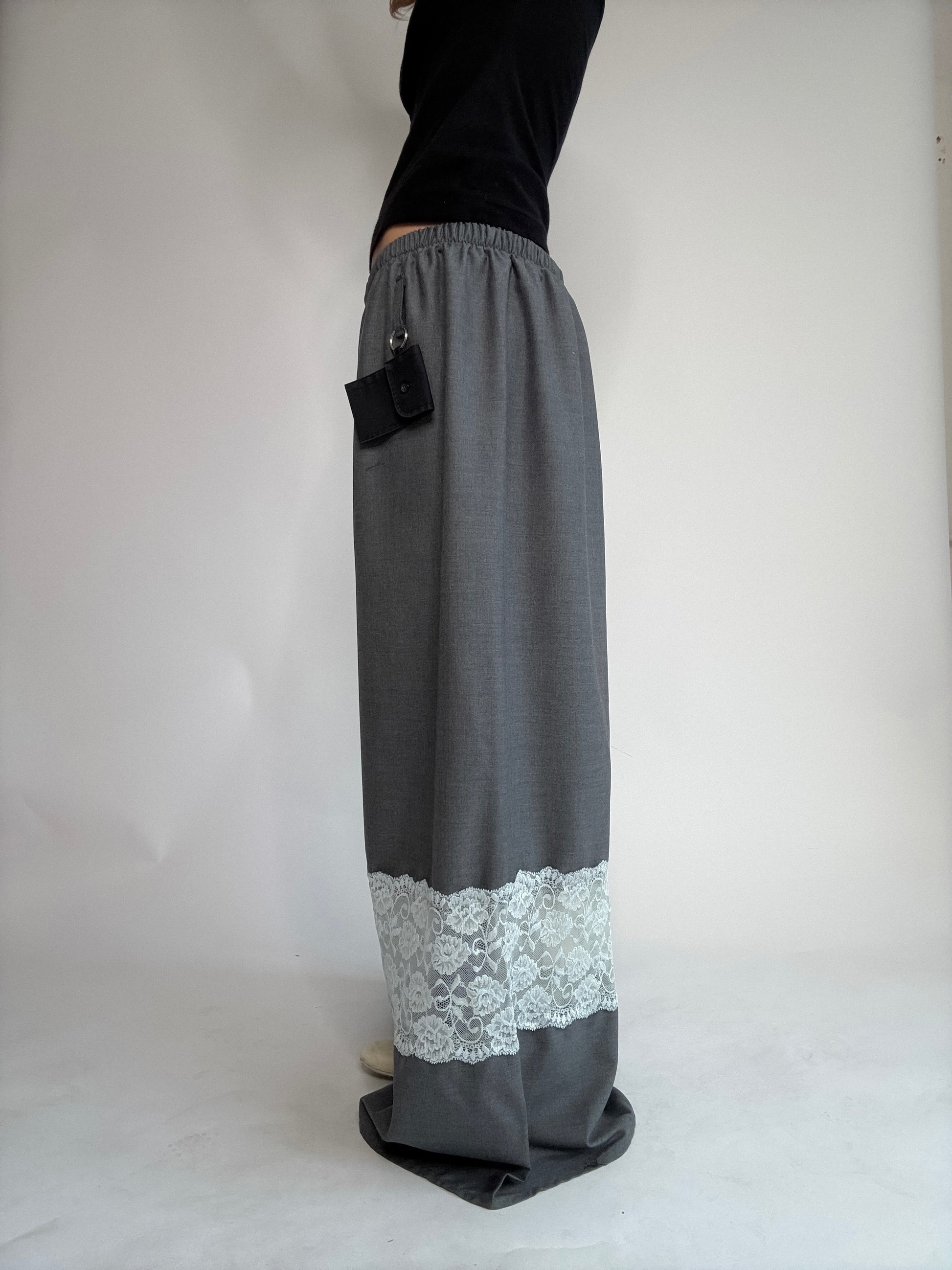 Pantalon upcyclé, sublimé de dentelle de Calais, plus fine que les excuses de ton ex... Détail de zinzin: sa petite pochette porte-clé, unique à chaque pièce, pour y glisser tes petits secrets.