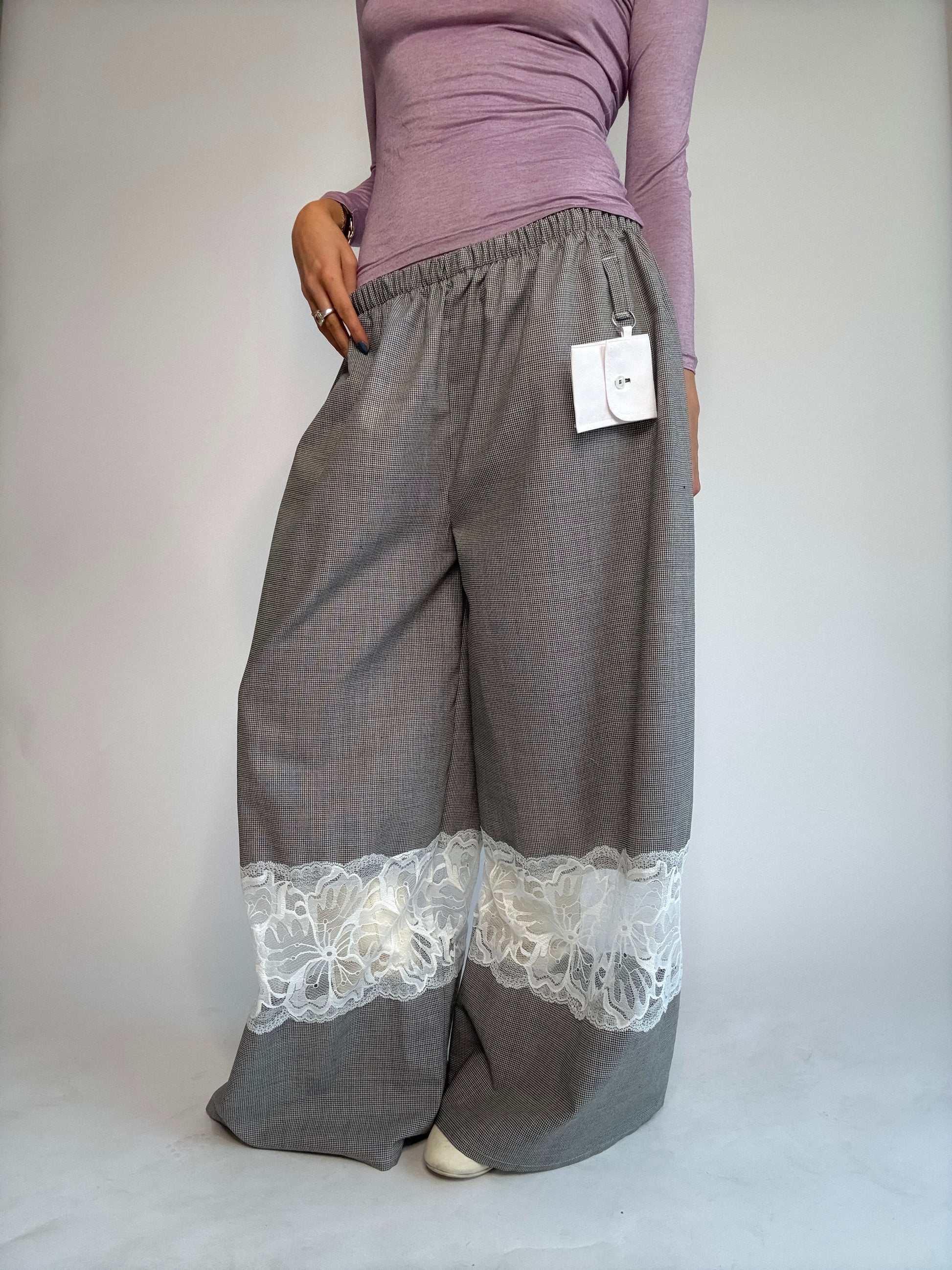Pantalon upcyclé, sublimé de dentelle de Calais, plus fine que les excuses de ton ex... Détail de zinzin: sa petite pochette porte-clé, unique à chaque pièce, pour y glisser tes petits secrets.