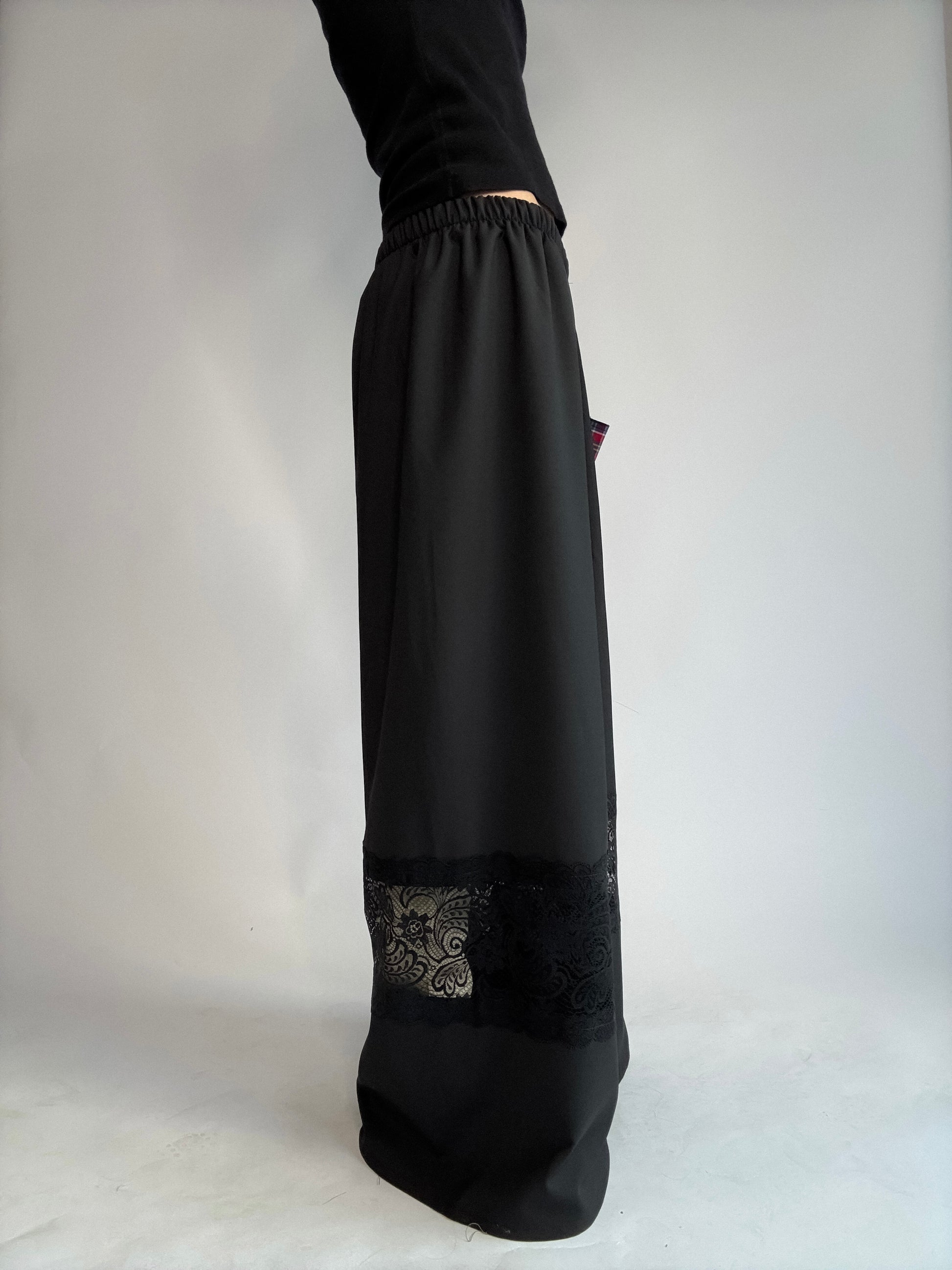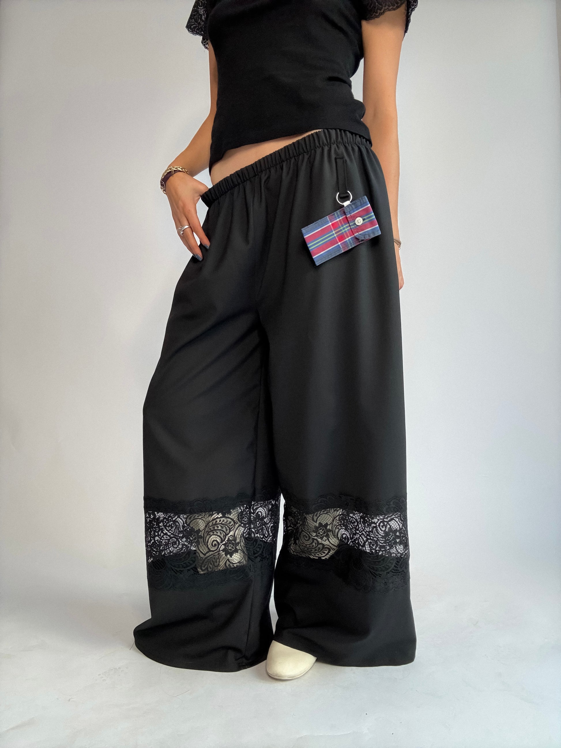 Pantalon upcyclé, sublimé de dentelle de Calais, plus fine que les excuses de ton ex... Détail de zinzin: sa petite pochette porte-clé, unique à chaque pièce, pour y glisser tes petits secrets.