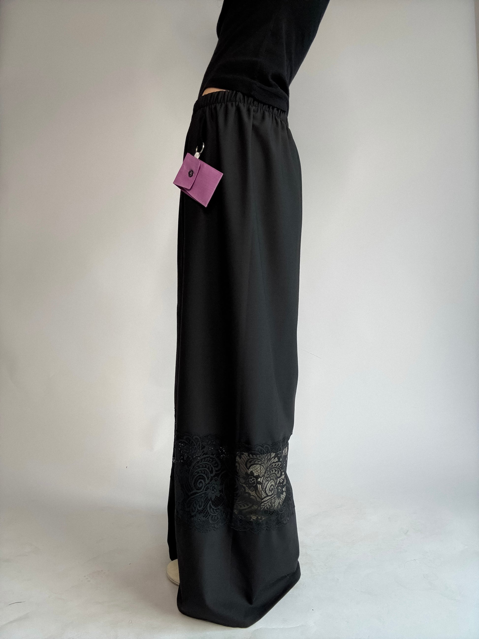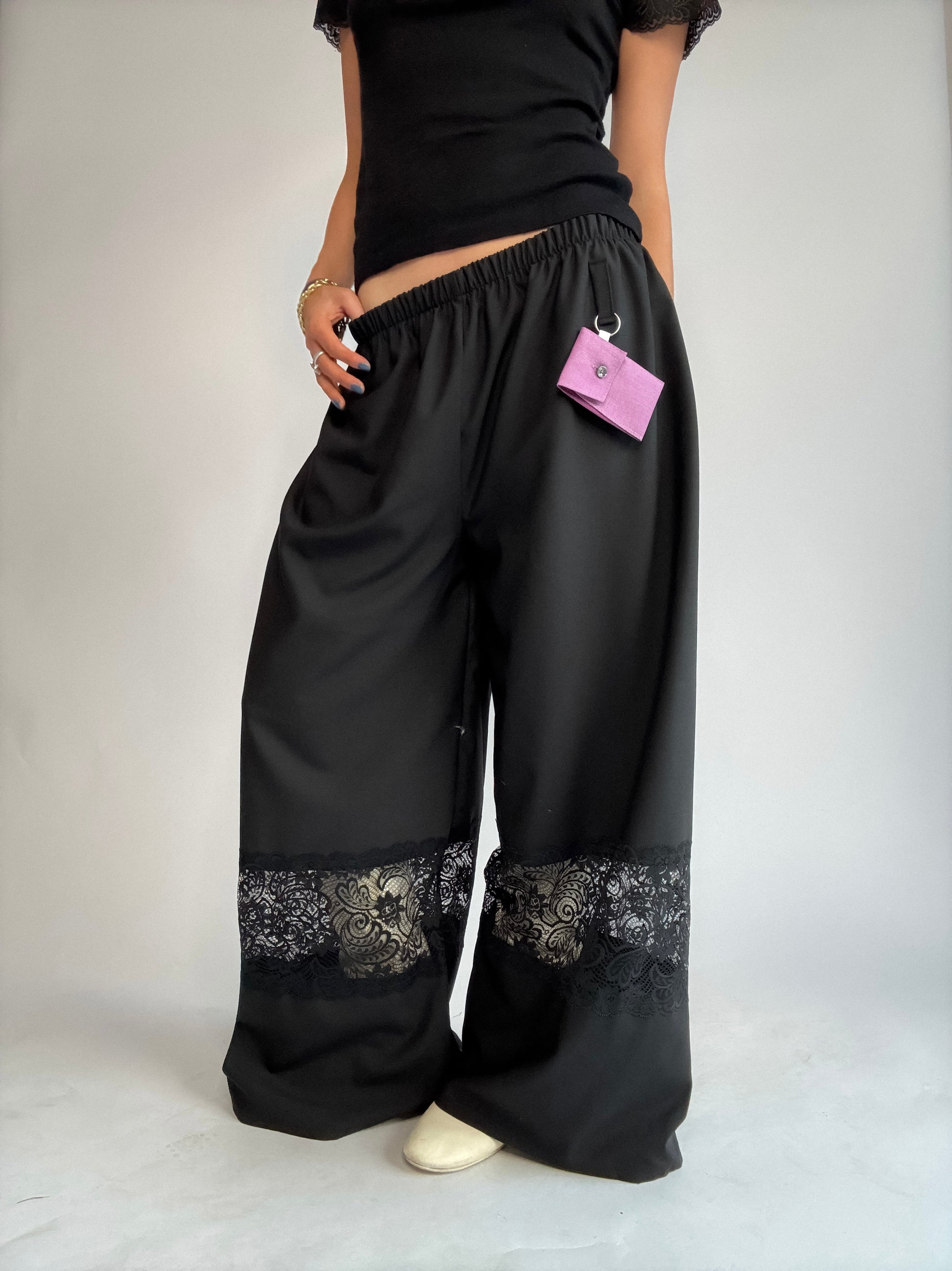 Pantalon upcyclé, sublimé de dentelle de Calais, plus fine que les excuses de ton ex... Détail de zinzin: sa petite pochette porte-clé, unique à chaque pièce, pour y glisser tes petits secrets.