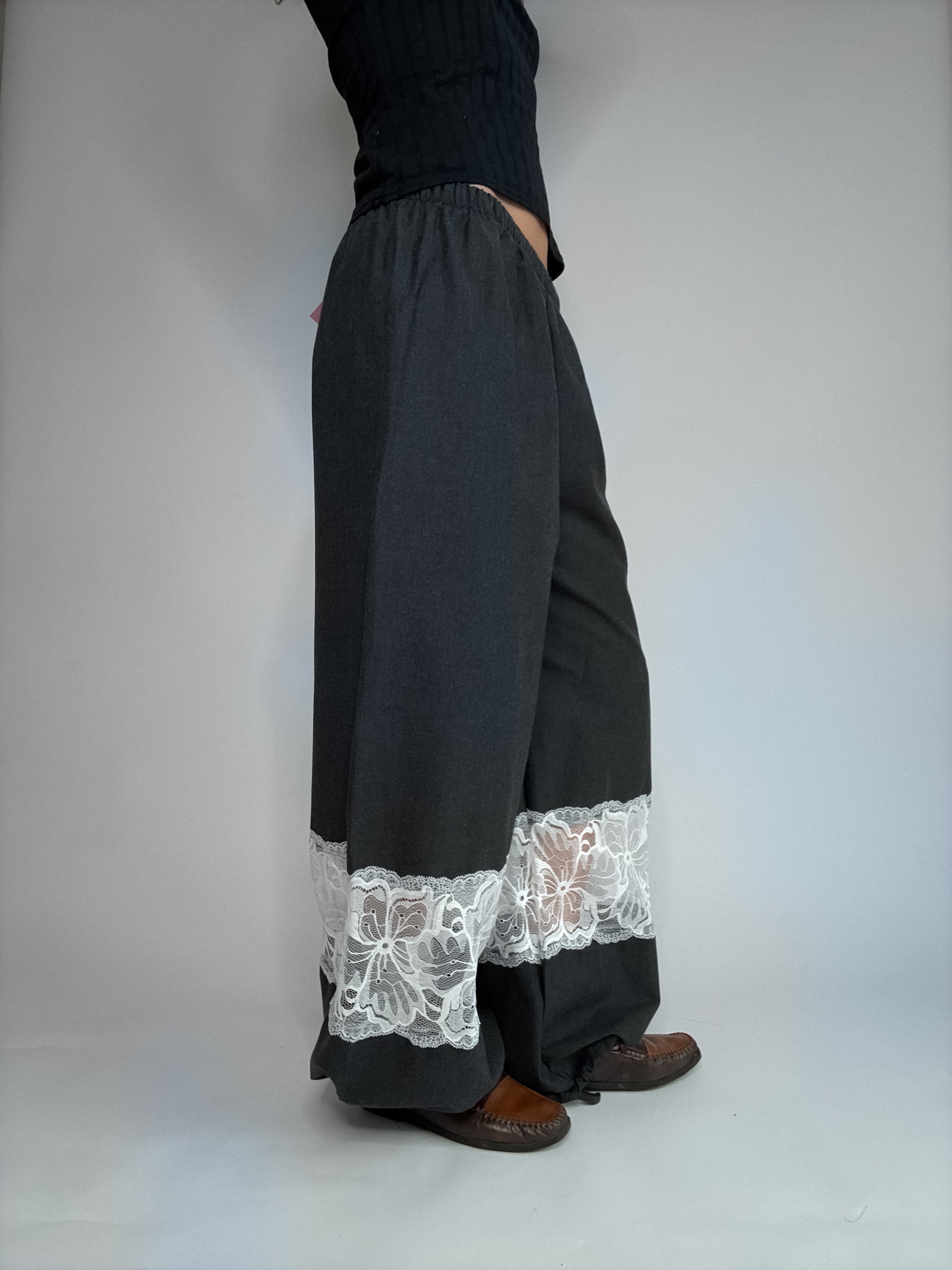 Pantalon upcyclé, confectionné à partir de stocks dormants de maisons de luxe. Et sublimé de dentelle de Calais, plus fine que les excuses de ton ex... Pantalon boule ou evasé ? vous choisissez. Détail de zinzin: sa petite pochette porte-clé, unique à chaque pièce, pour y glisser tes petits secrets.