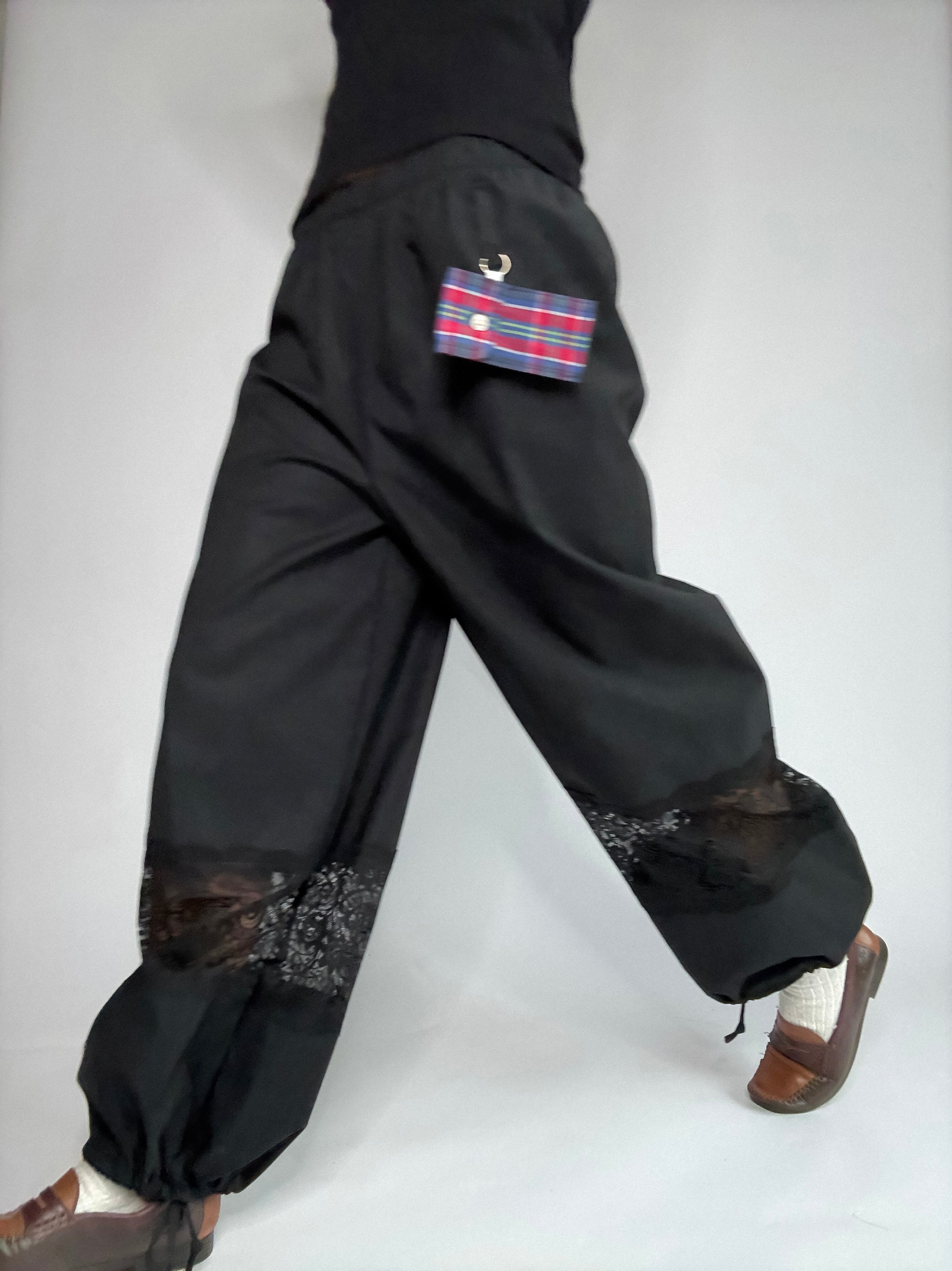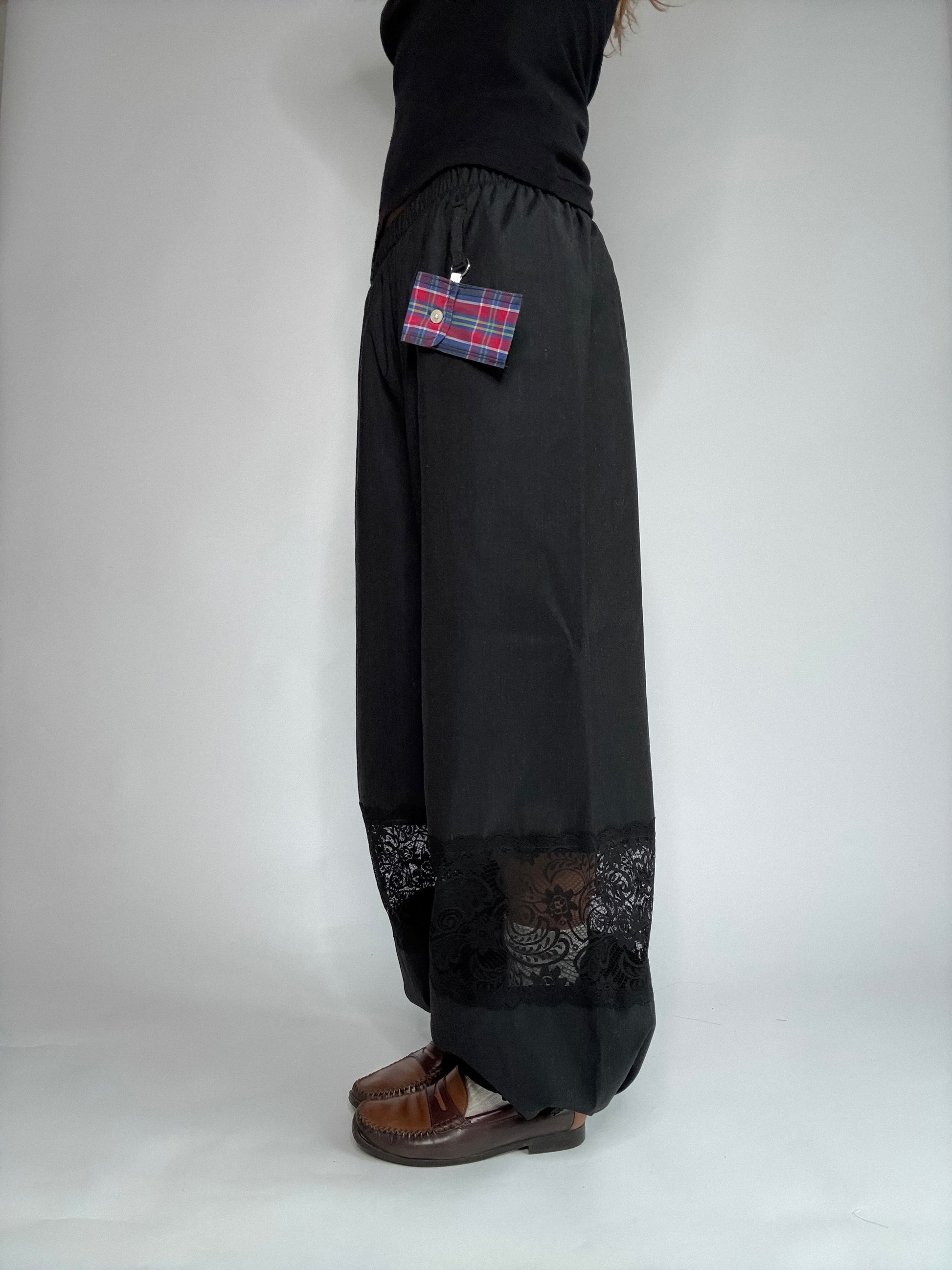 Pantalon upcyclé, confectionné à partir de stocks dormants de maisons de luxe. Et sublimé de dentelle de Calais, plus fine que les excuses de ton ex... Pantalon boule ou evasé ? vous choisissez. Détail de zinzin: sa petite pochette porte-clé, unique à chaque pièce, pour y glisser tes petits secrets.