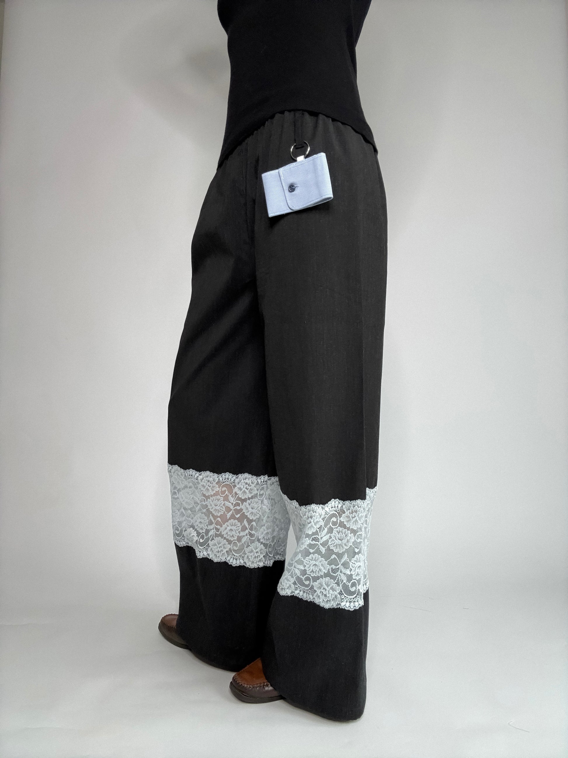 Pantalon upcyclé, confectionné à partir de stocks dormants de maisons de luxe. Et sublimé de dentelle de Calais, plus fine que les excuses de ton ex... Pantalon boule ou evasé ? vous choisissez. Détail de zinzin: sa petite pochette porte-clé, unique à chaque pièce, pour y glisser tes petits secrets.