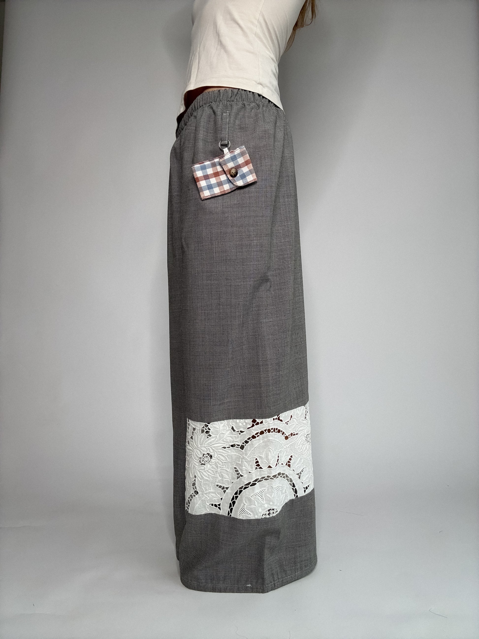 Pantalon upcyclé, confectionné à partir de stocks dormants de maisons de luxe. Et sublimé de dentelle de Calais, plus fine que les excuses de ton ex... Pantalon boule ou evasé ? vous choisissez. Détail de zinzin: sa petite pochette porte-clé, unique à chaque pièce, pour y glisser tes petits secrets.