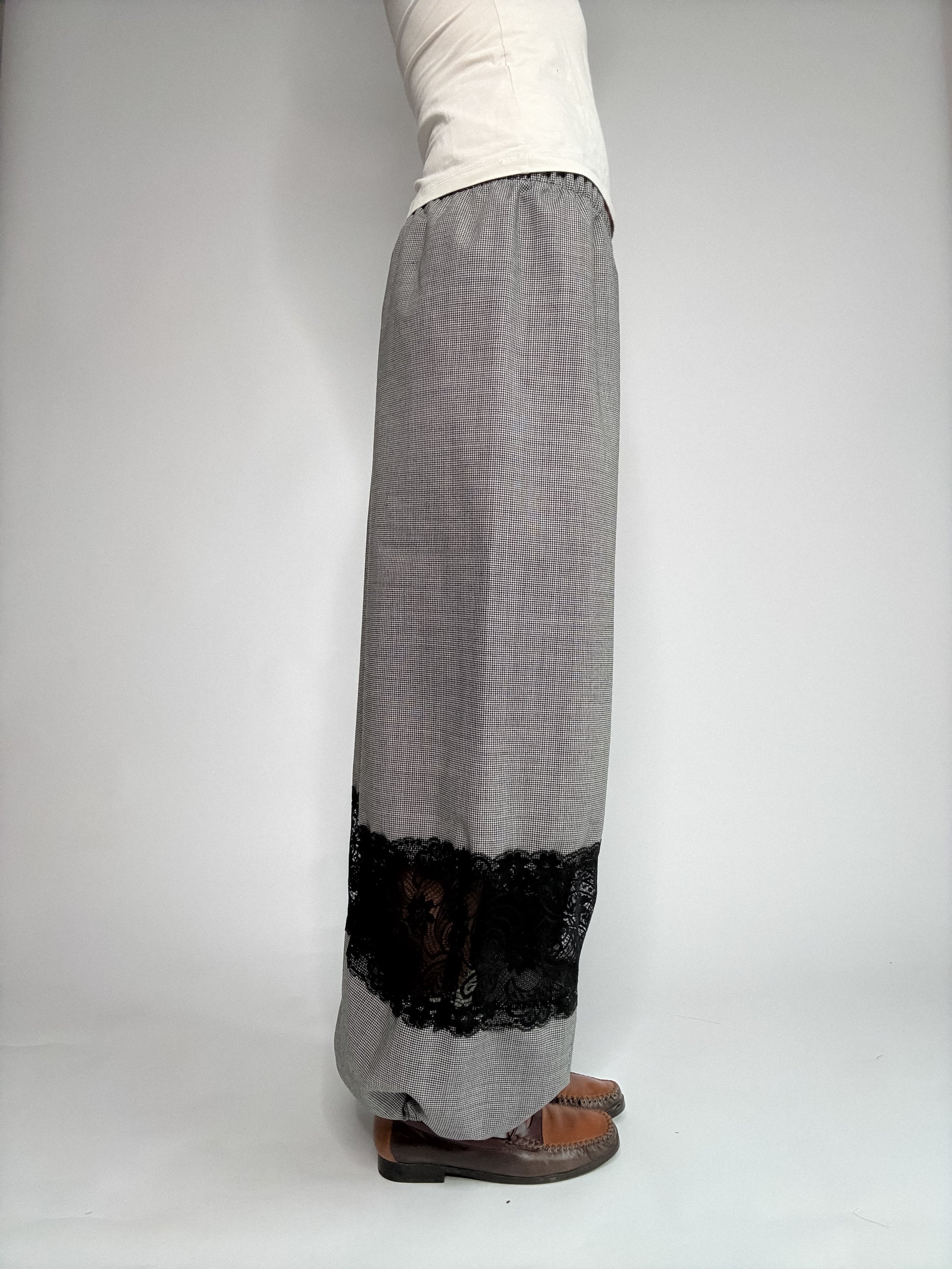 Pantalon upcyclé, confectionné à partir de stocks dormants de maisons de luxe. Et sublimé de dentelle de Calais, plus fine que les excuses de ton ex... Pantalon boule ou evasé ? vous choisissez. Détail de zinzin: sa petite pochette porte-clé, unique à chaque pièce, pour y glisser tes petits secrets.