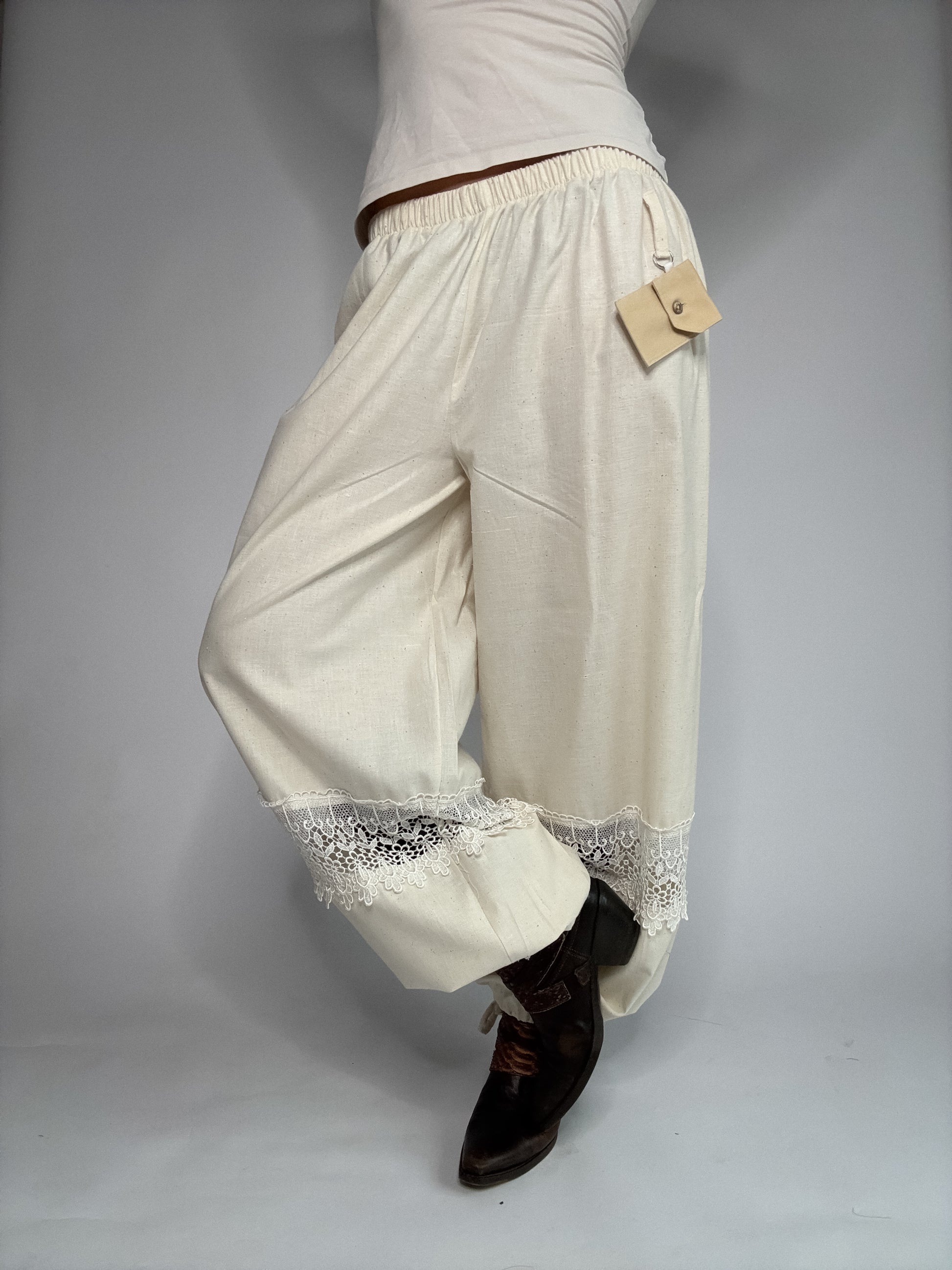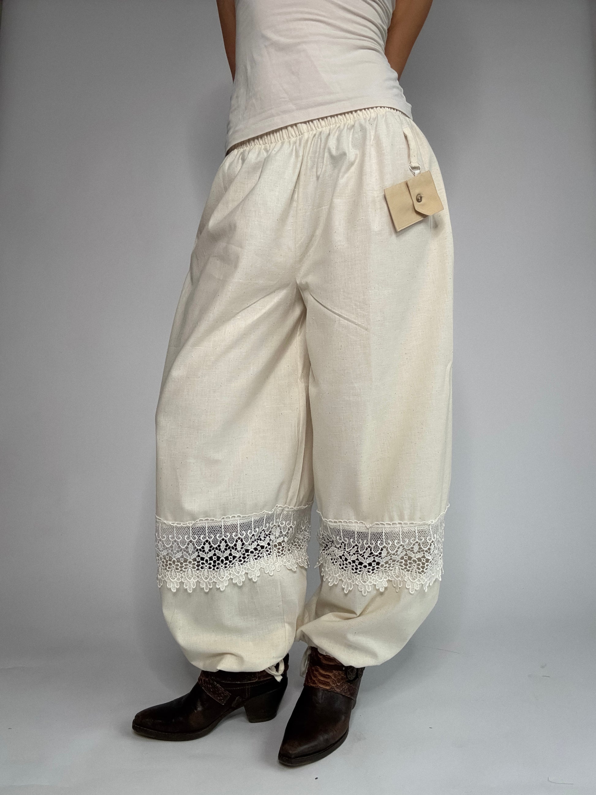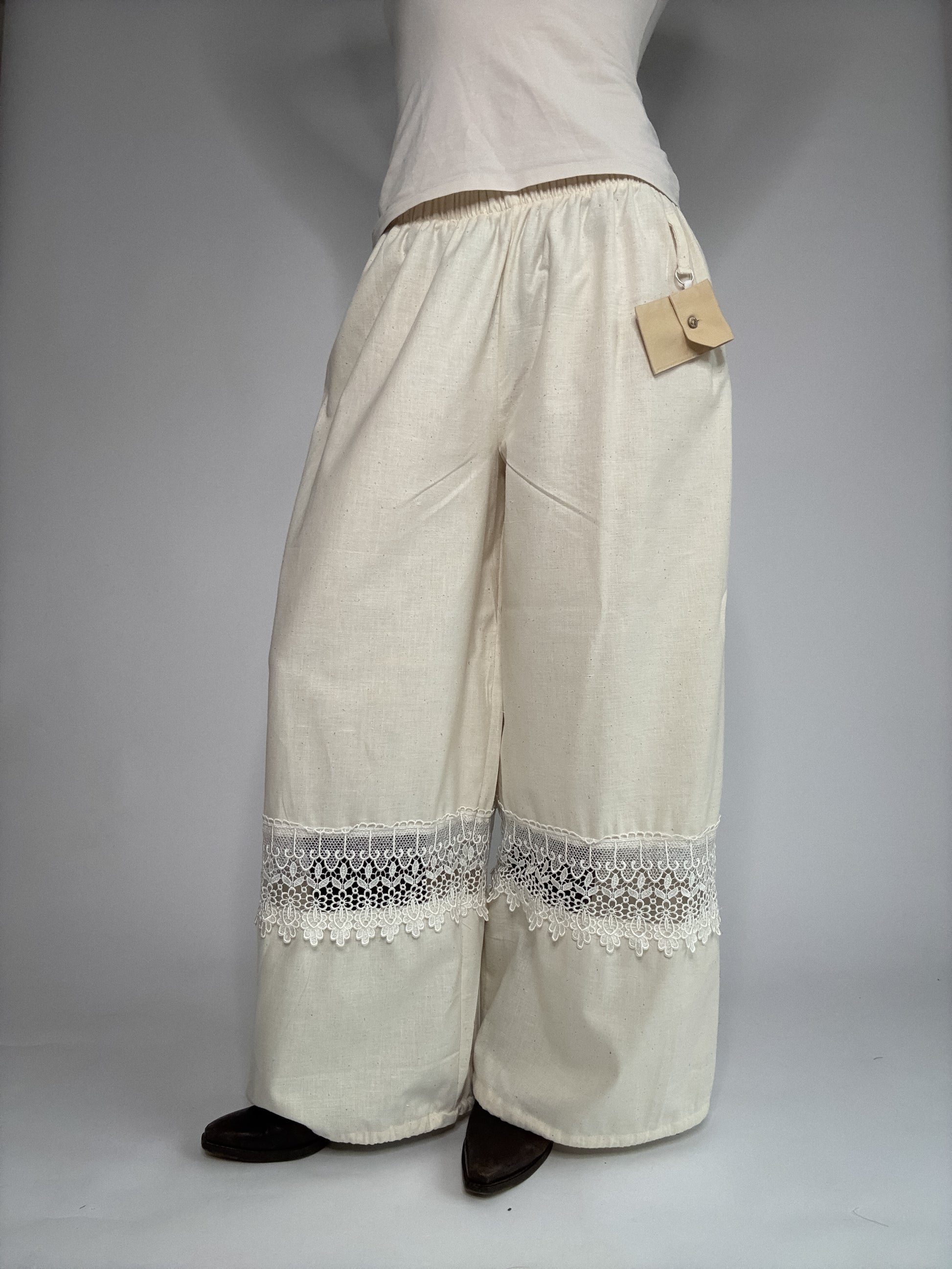 Pantalon upcyclé, confectionné à partir de stocks dormants de maisons de luxe. Et sublimé de dentelle de Calais, plus fine que les excuses de ton ex... Pantalon boule ou evasé ? vous choisissez. Détail de zinzin: sa petite pochette porte-clé, unique à chaque pièce, pour y glisser tes petits secrets.