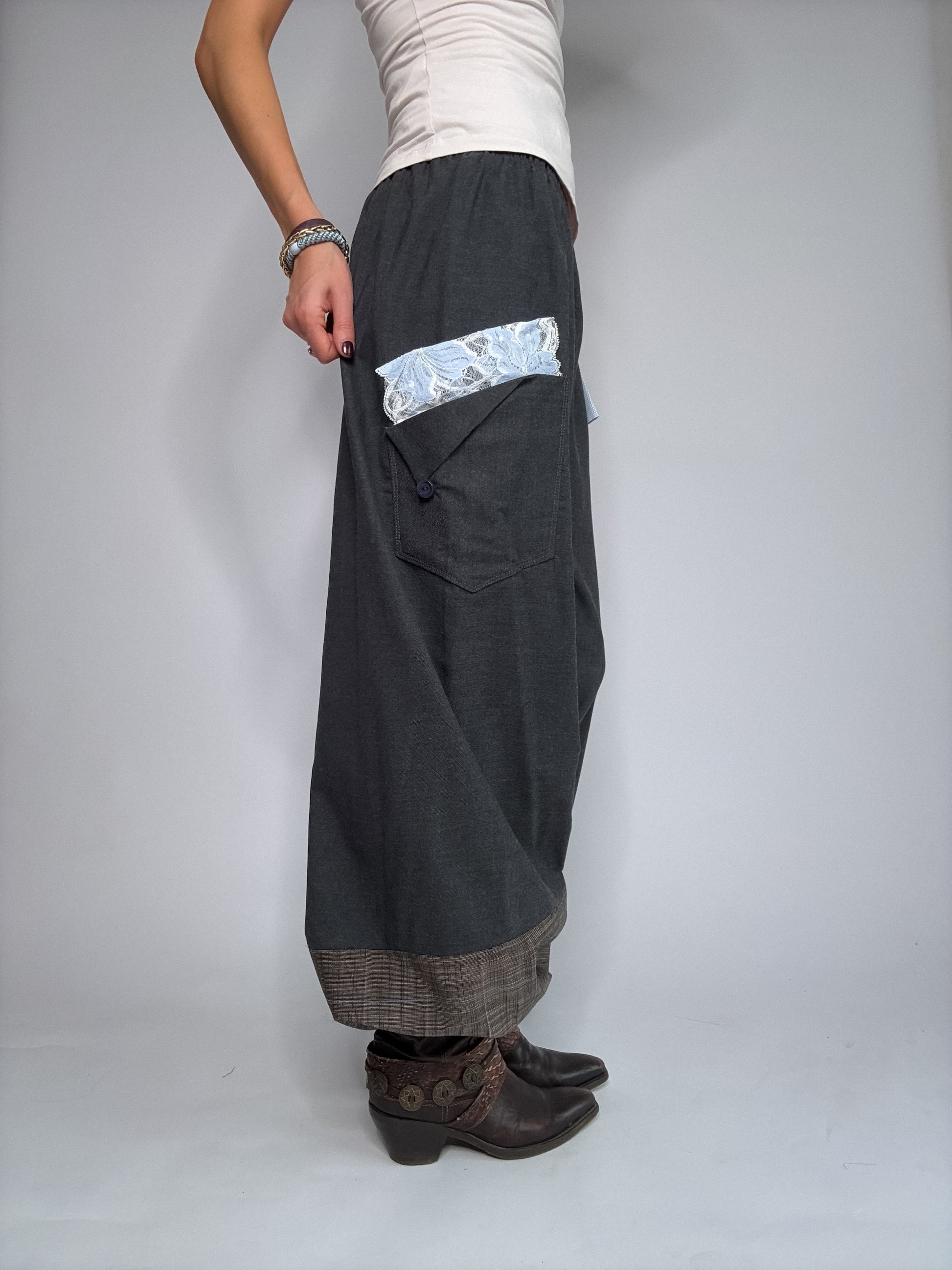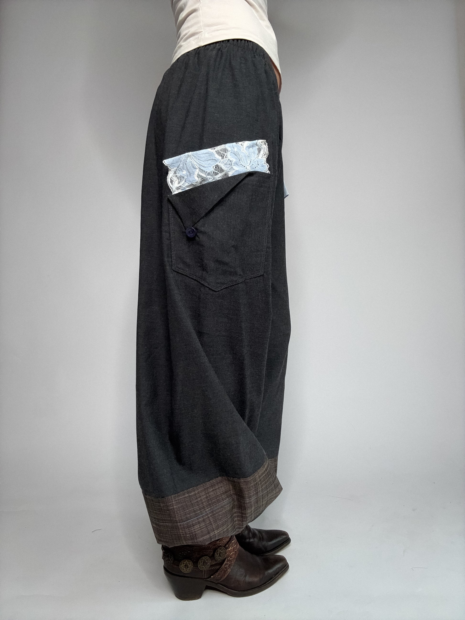 Pantalon upcyclé, boule ou évasé ? c’est vous qui décidez. Confectionné à partir de stocks dormants de maisons de luxe. Du caractère : poche asymétrique faite main, bouton vintage, mouchoir en dentelle qui dépasse… clin d’œil à ton grand-père enrhumé avec élégance.