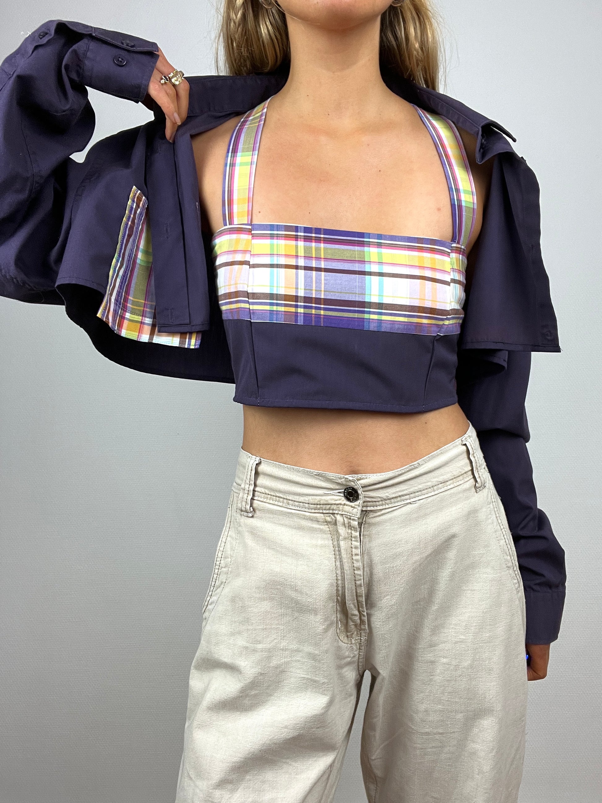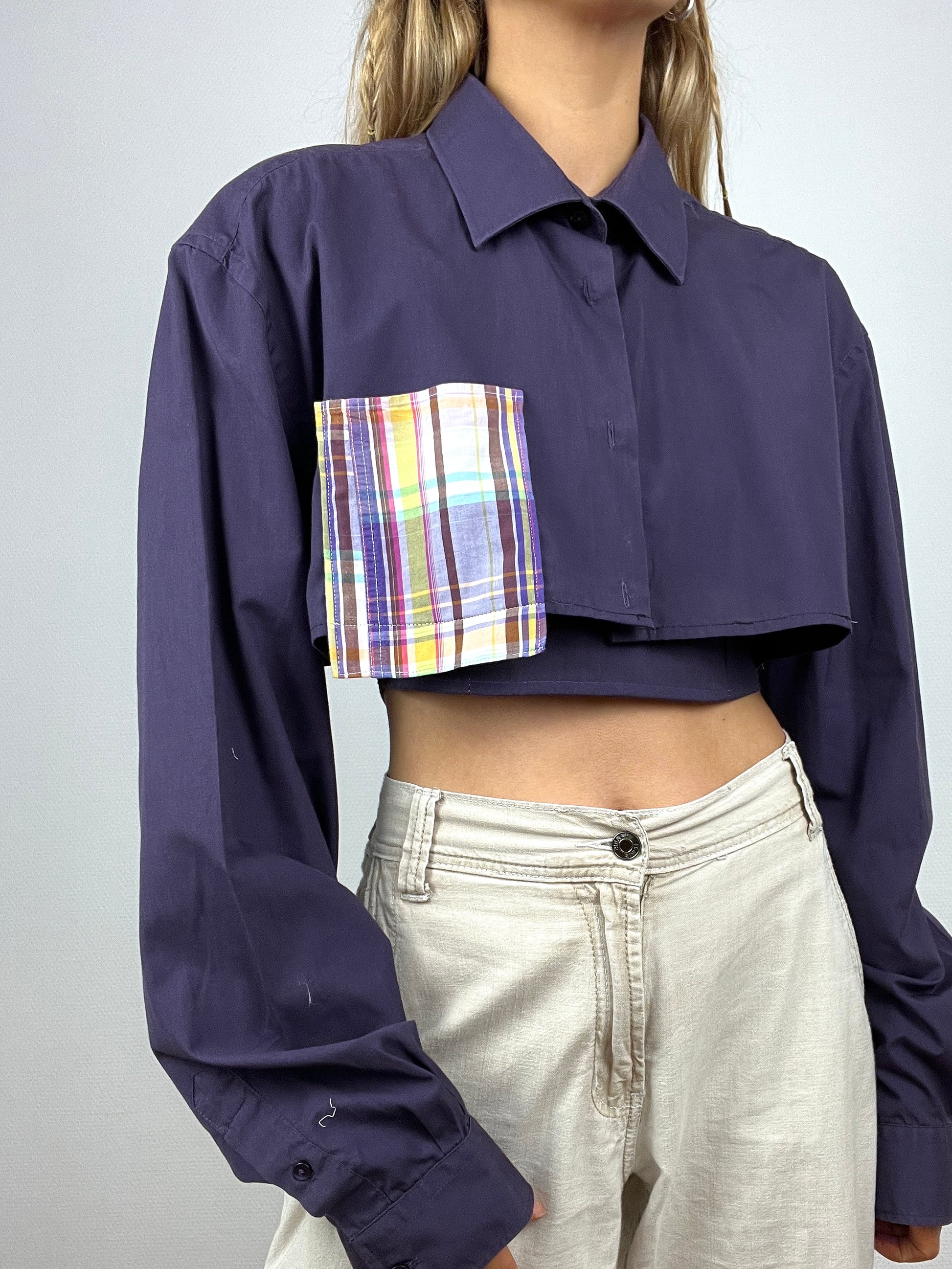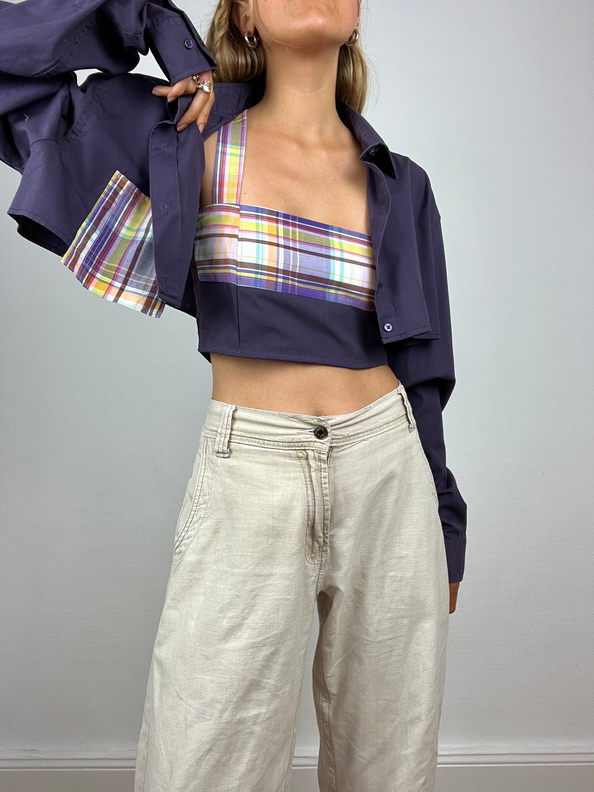 Set bicolore, upcyclé à partir d’une chemise pour homme violette. Top court avec sa chemise coupée assortie à big poche.