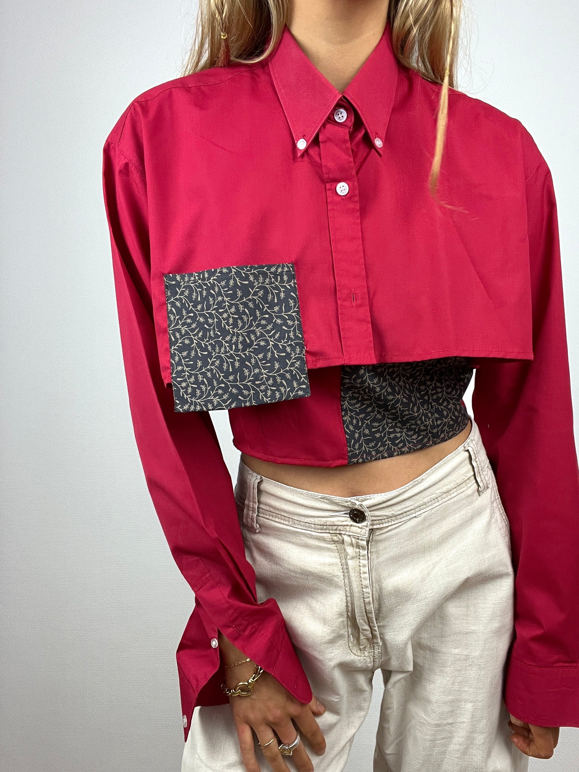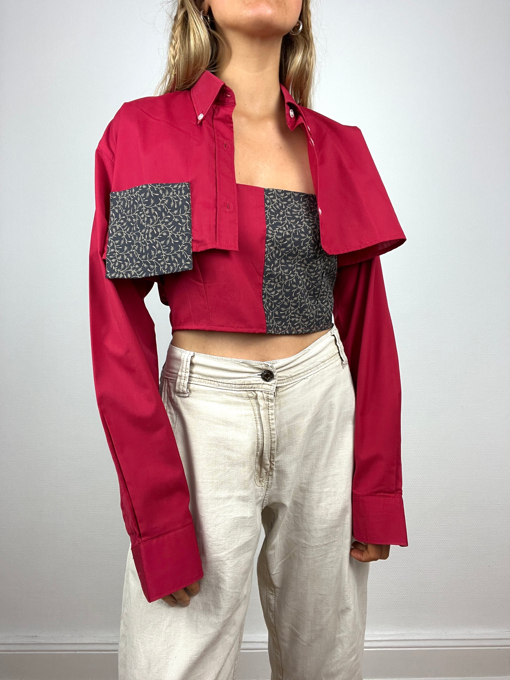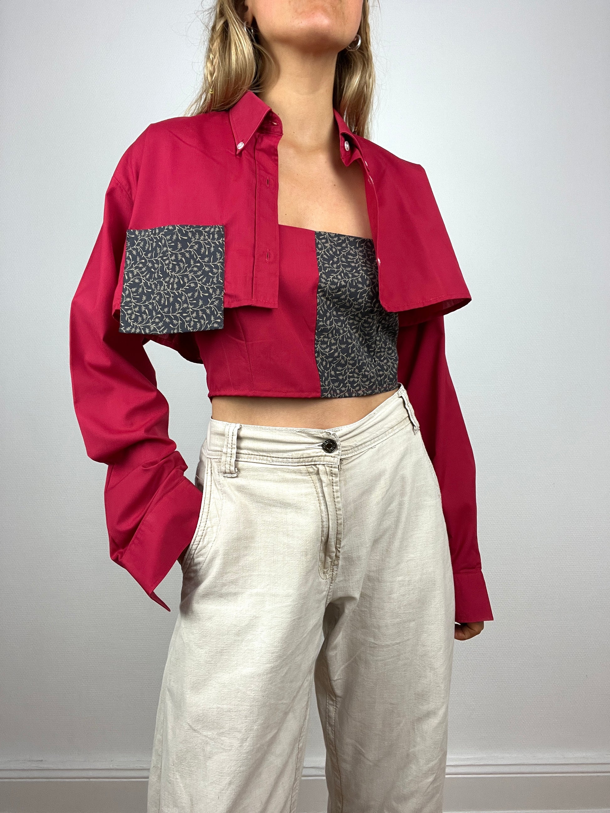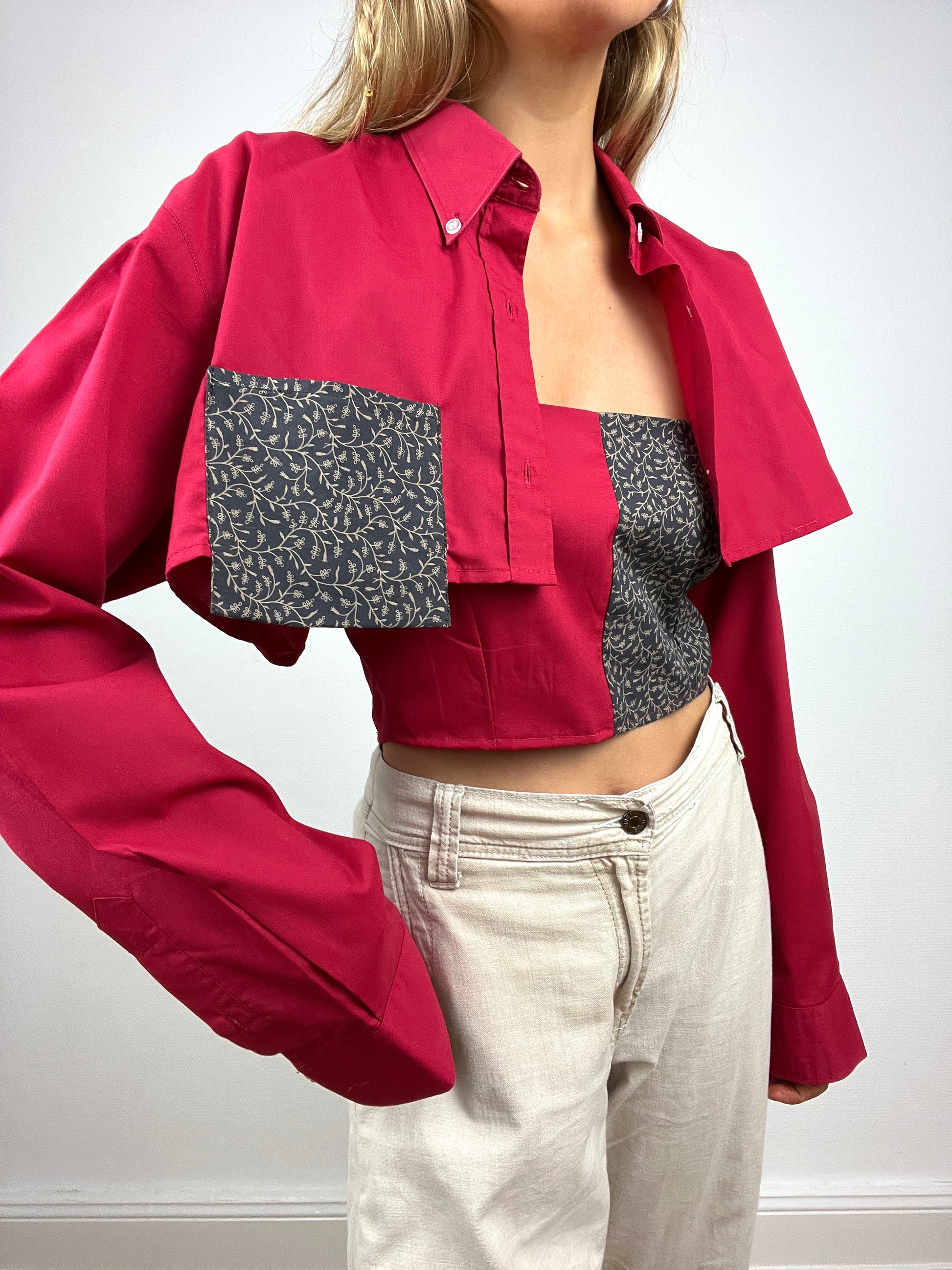 Set bicolore, upcyclé à partir d’une chemise pour homme rouge. Top court avec sa chemise coupée assortie à big poche.