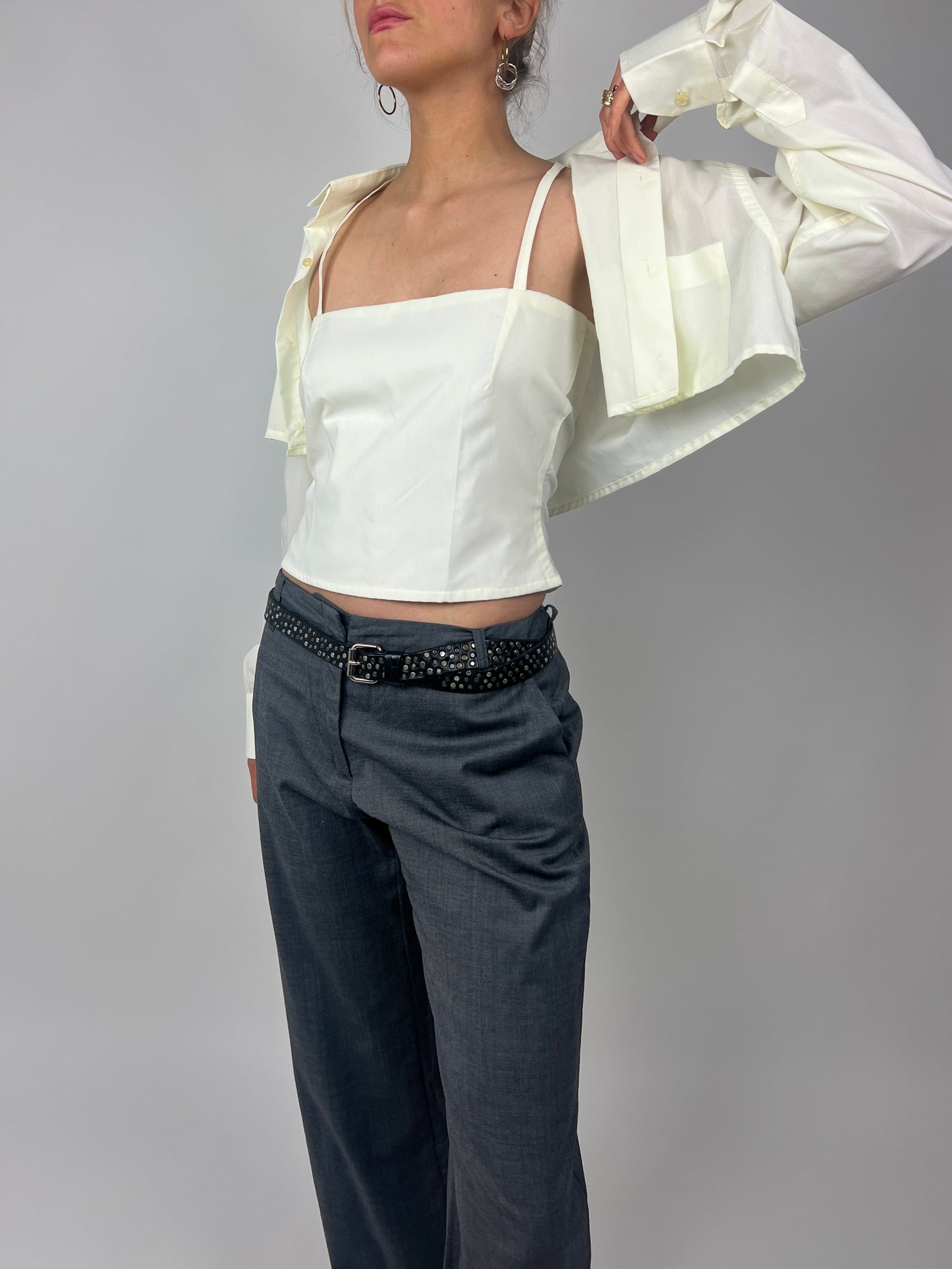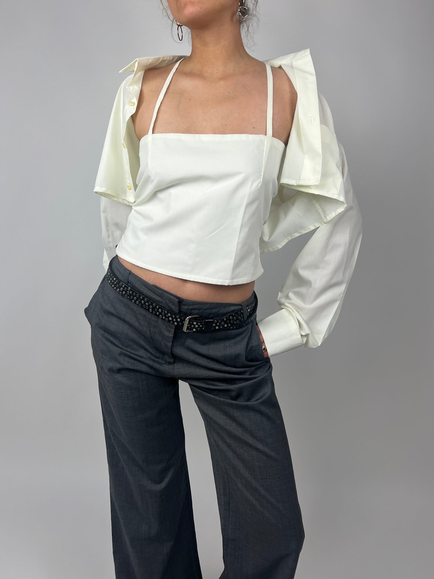 Set jaune pâle, upcyclé à partir d’une chemise pour homme. Top long, avec sa chemise coupée assortie.
