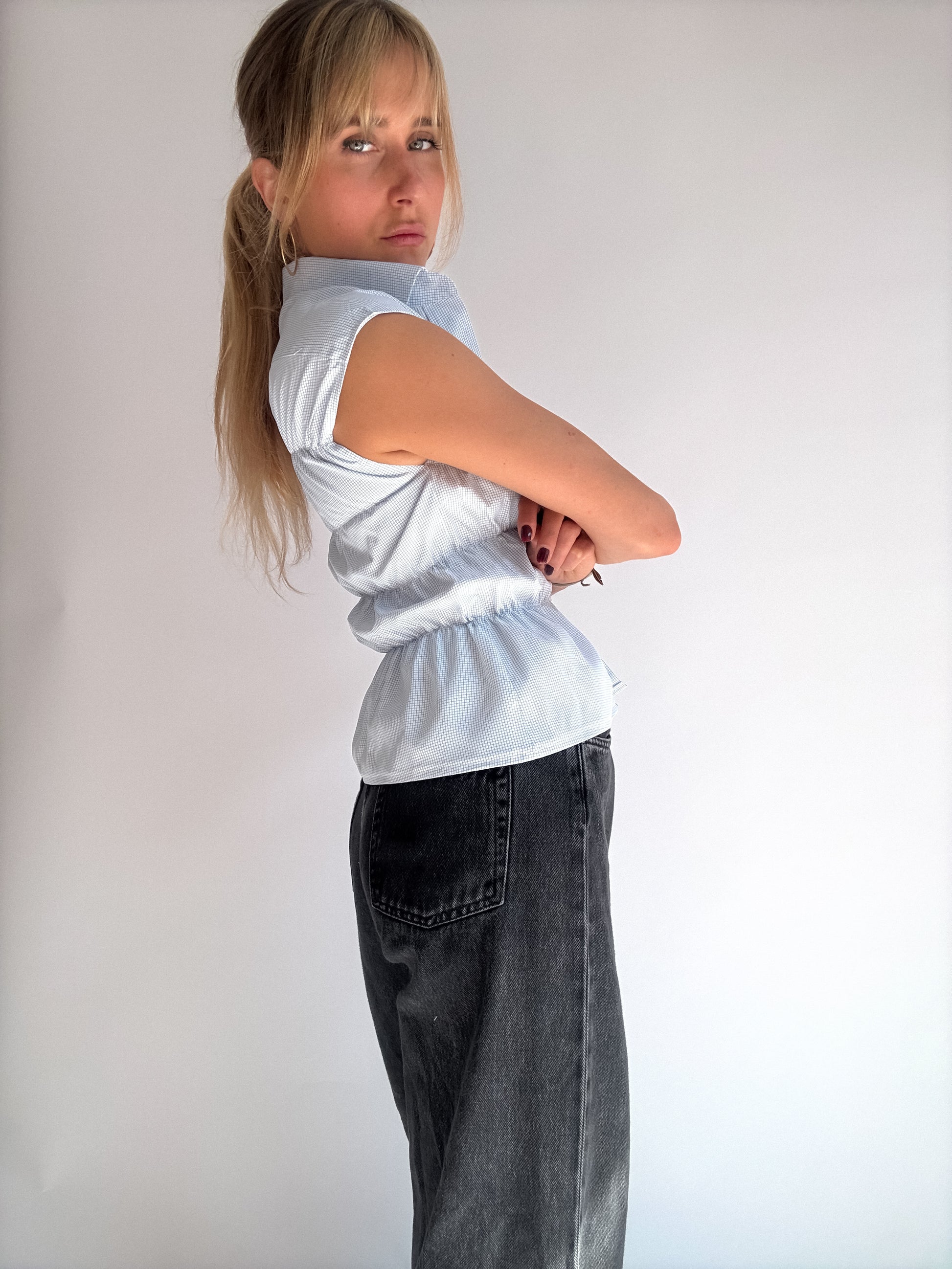Chemise sans manches à fronces, upcyclée à partir de la chemise de ton ex... qu'il attend encore.