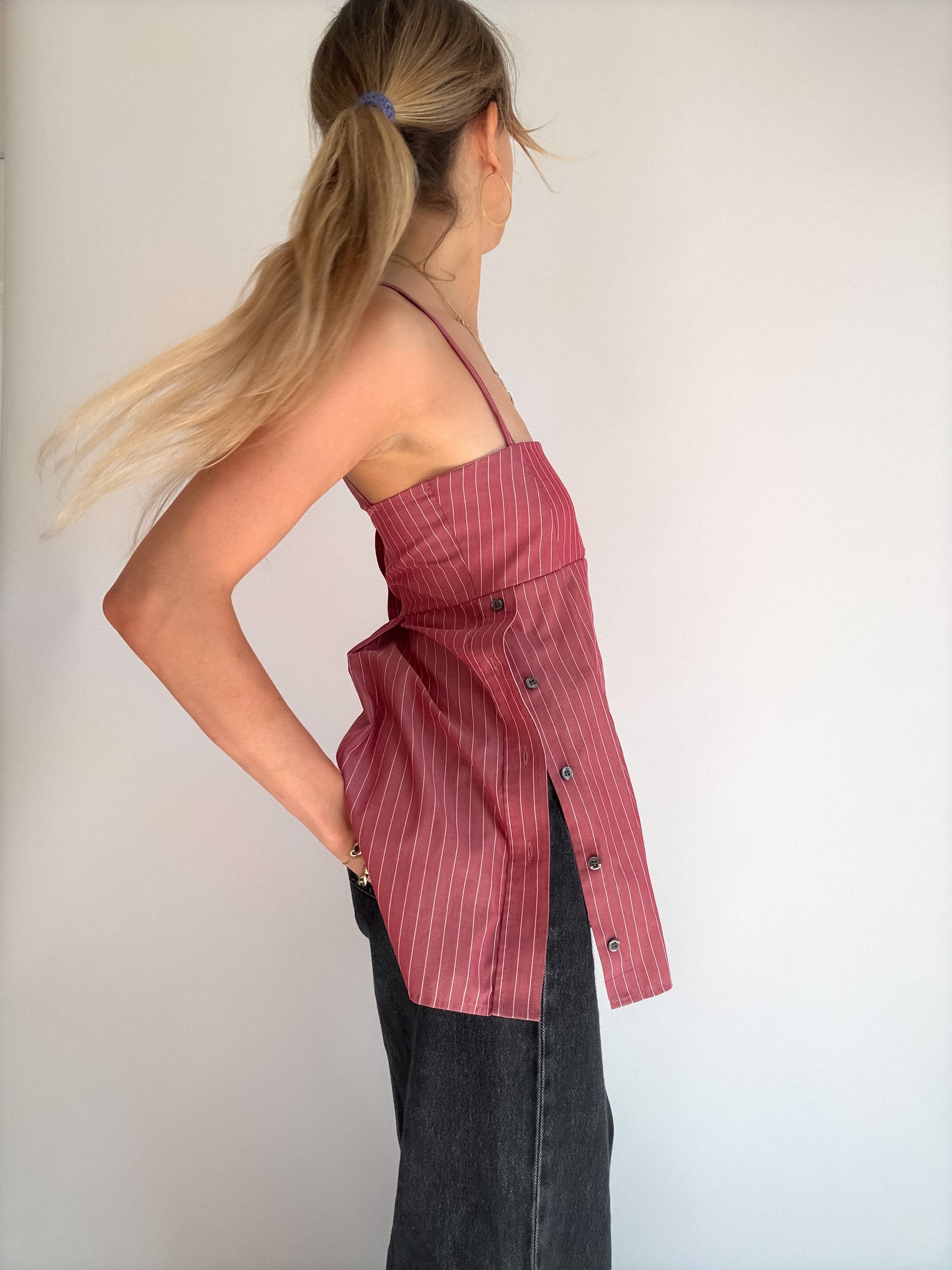 Top à fines bretelles, upcyclé à partir de la chemise de ton ex que t'as gardée en douce... Boutonnière de chemise et détails d'upcycling uniques.