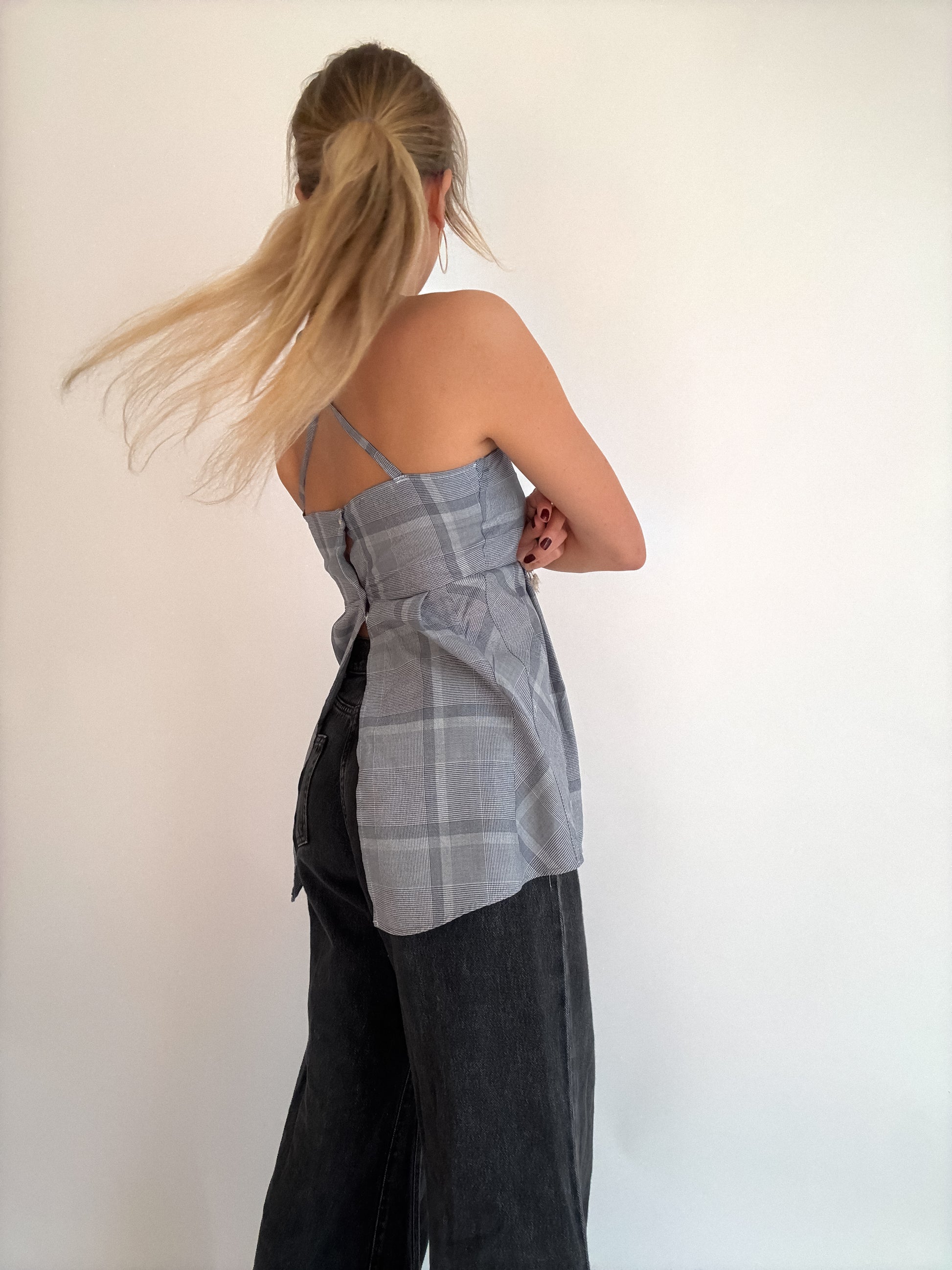Top à fines bretelles, upcyclé à partir de la chemise de ton ex que t'as gardée en douce... Boutonnière de chemise et détails d'upcycling uniques.